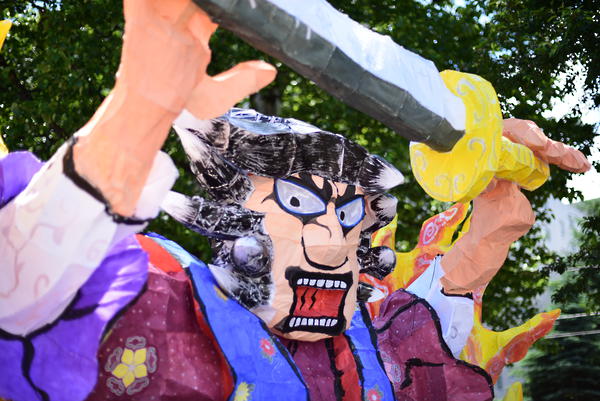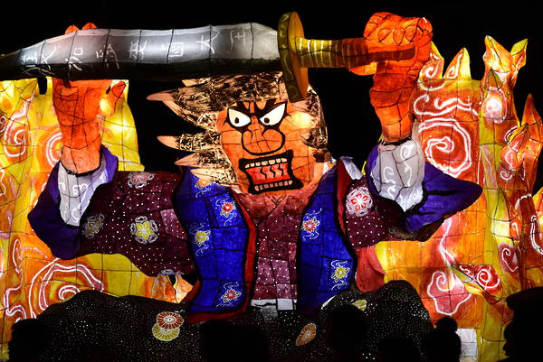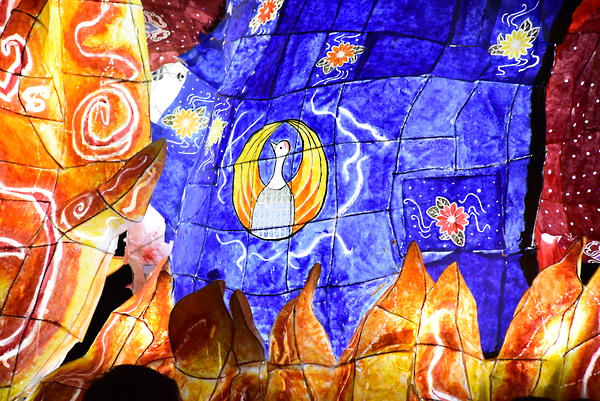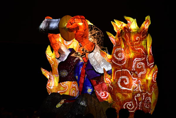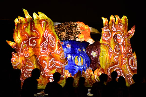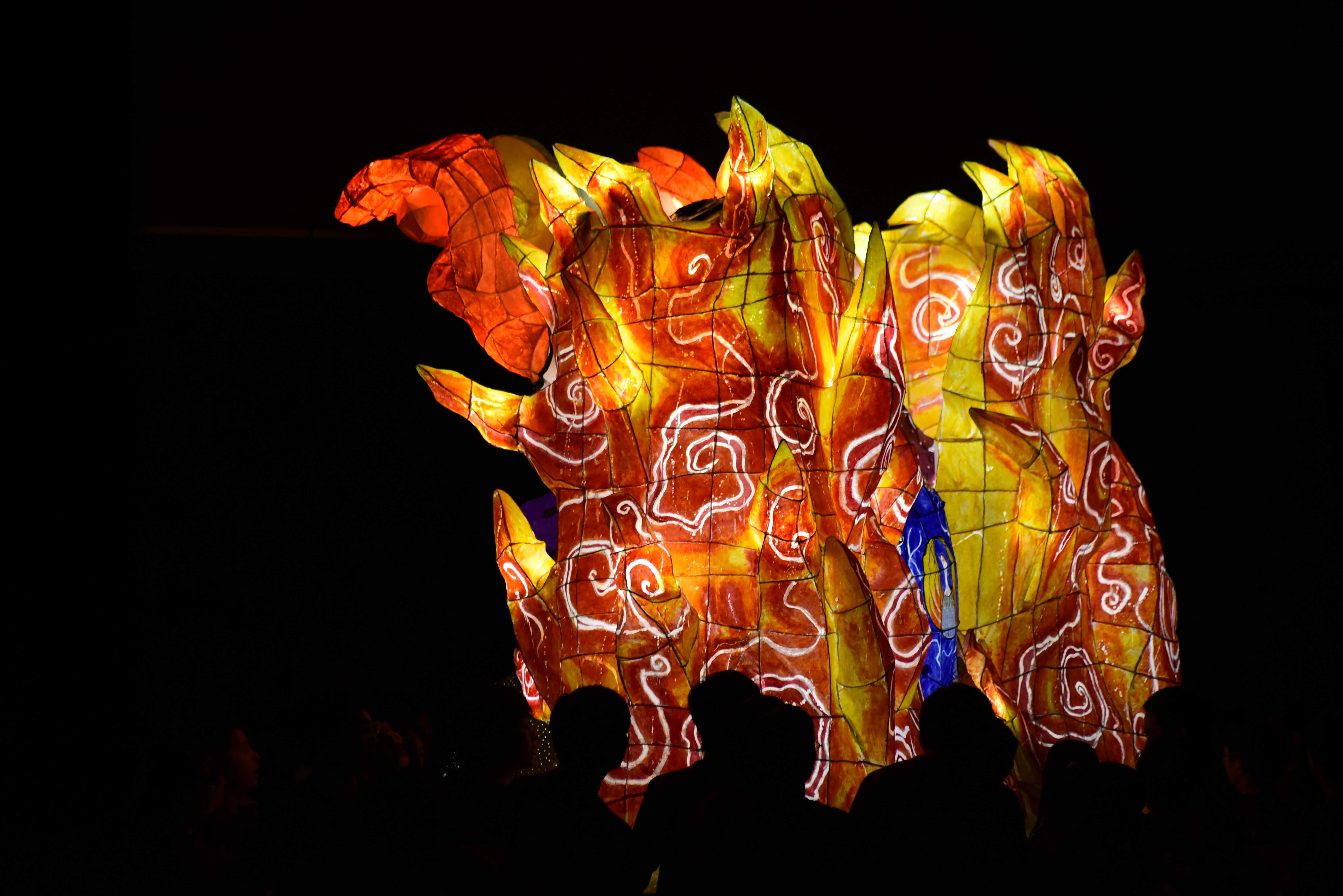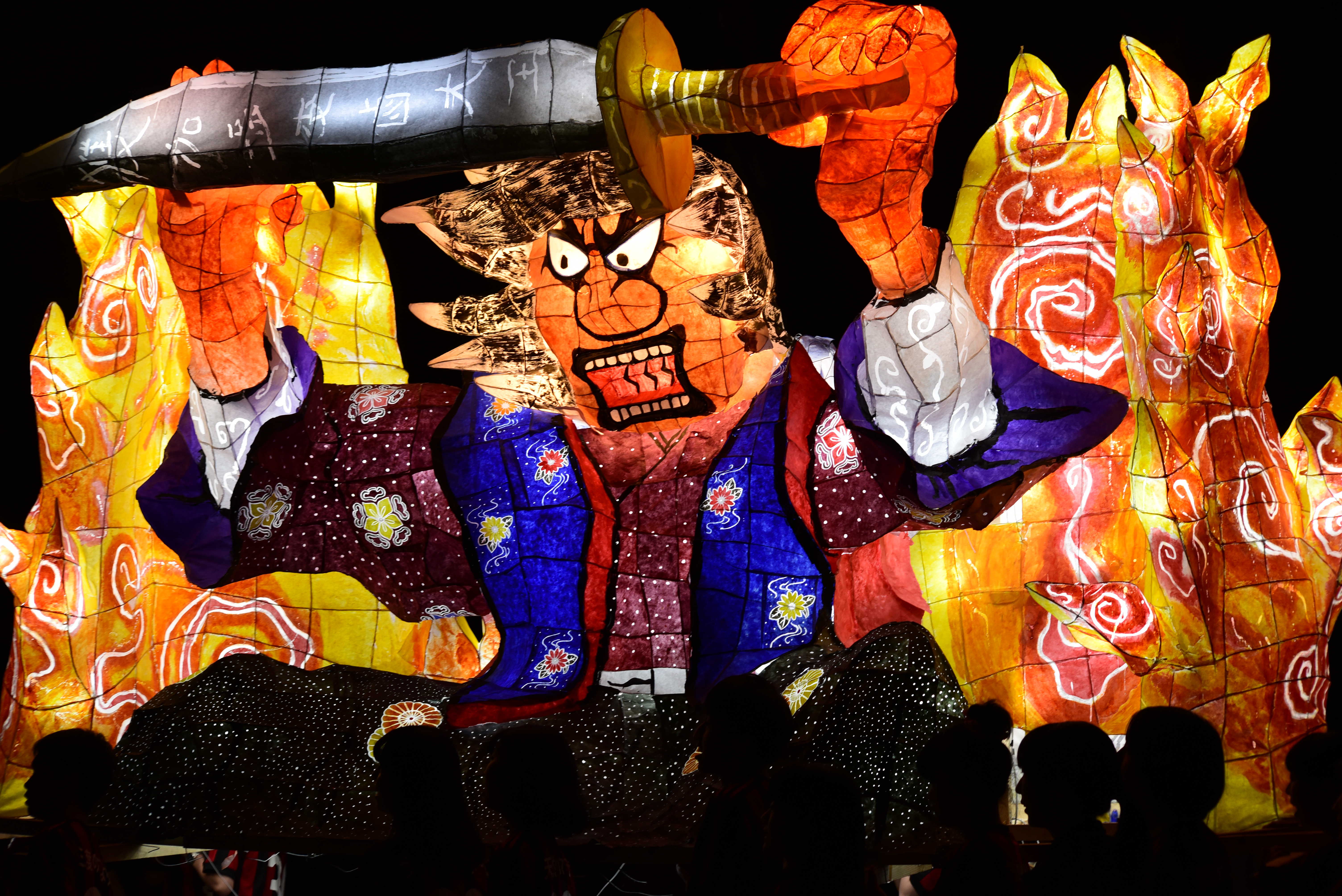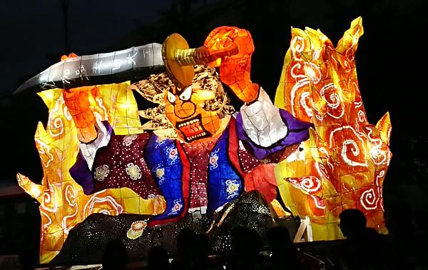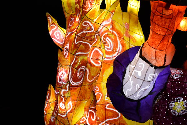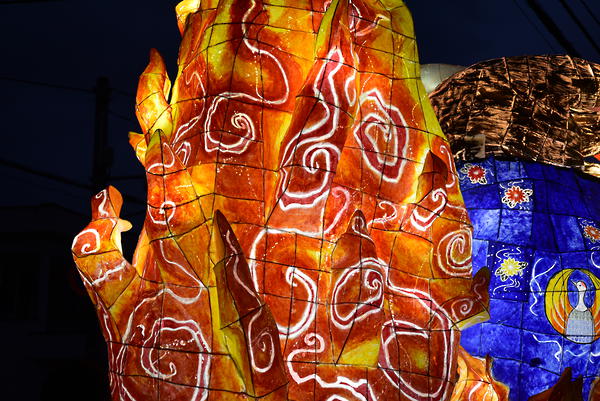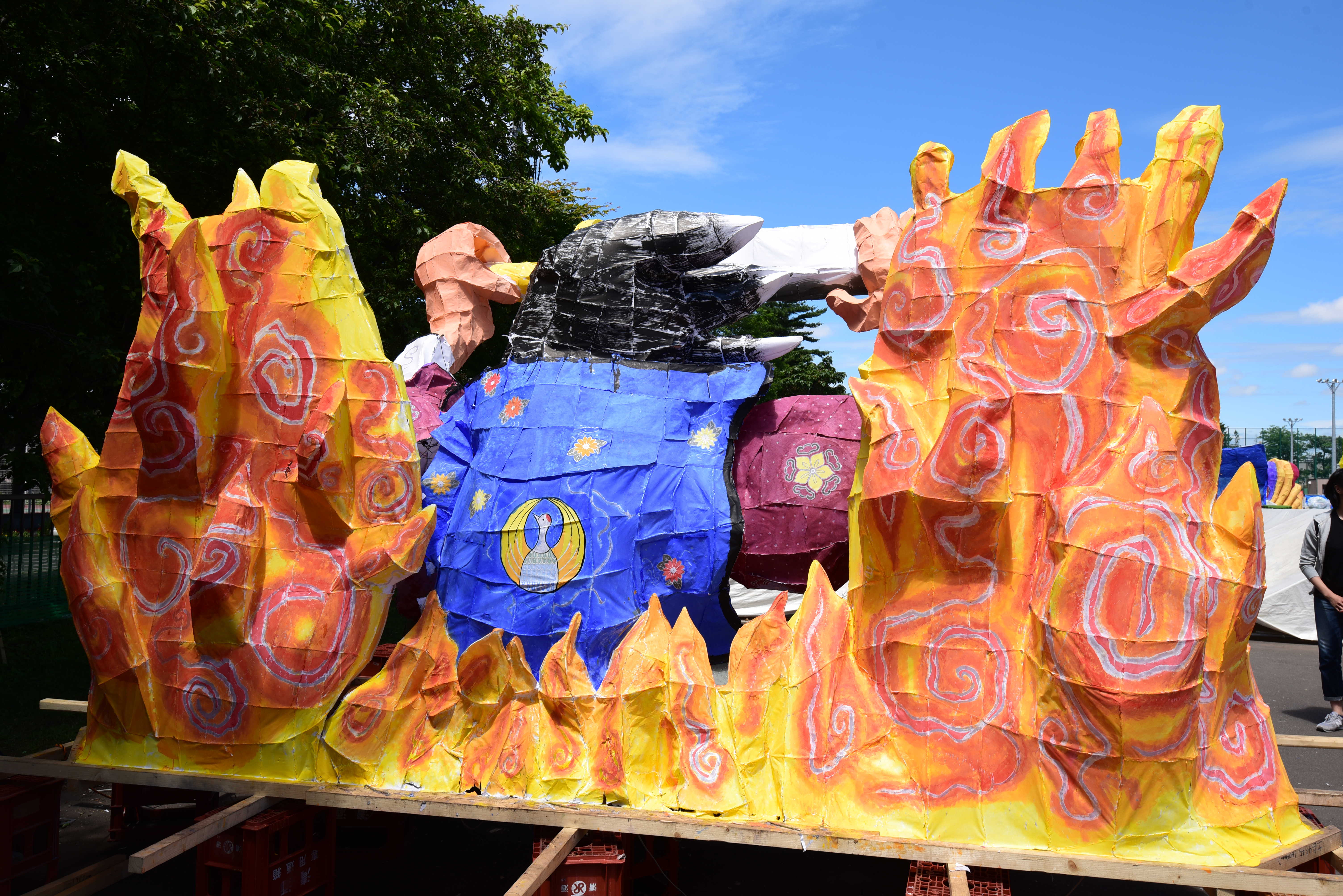 特に配色が素晴らしいと思っていて、内側には暗い寒色系の色、外側に明るい暖色系の色を持ってきているので、内側は引き締めつつも全体では大きく見せることに成功しています。 暗い色もただ暗くするだけでは形がわからなくなってしまうので、きちんとロウ点を打っていたり明るい柄を入れていたりとよく工夫されています。さらに炎がバックにあるので体の輪郭もよくわかります。 針金も不自然なところはないですし、電飾もよく光っていました。 あともう一つ「おお」と思ったのが、ギャラリーの写真を見るとわかりますが、このクラスは審査員席で前に傾けていて、審査員に対して覆いかぶさるような演出をしていました。青森ねぶた祭りを観に行くとよくわかりますが前に傾けられると迫力が倍増するんですよね。あとは北高行灯の奥行き足りなさすぎ問題に対してこの手を使うと高さを奥行きとして使うことができるので、よさそうです。 ただ、これけっこう危ない (最悪角材が折れたりパーツが外れたりして審査員席に落ちる) と思うので後輩のみなさんはやらないほうがいいと思います。現段階では禁止されていない?かもしれませんがもしかしたら今後禁止されるかも。