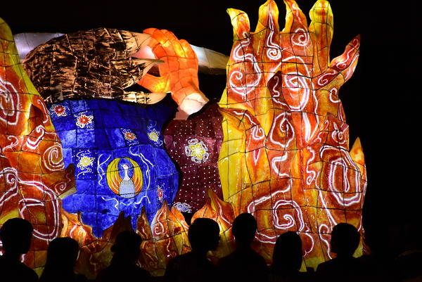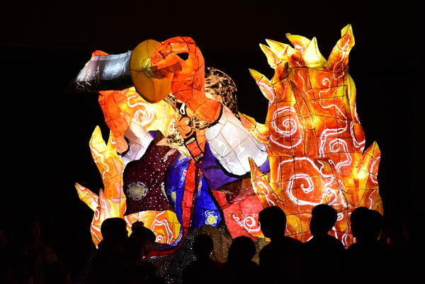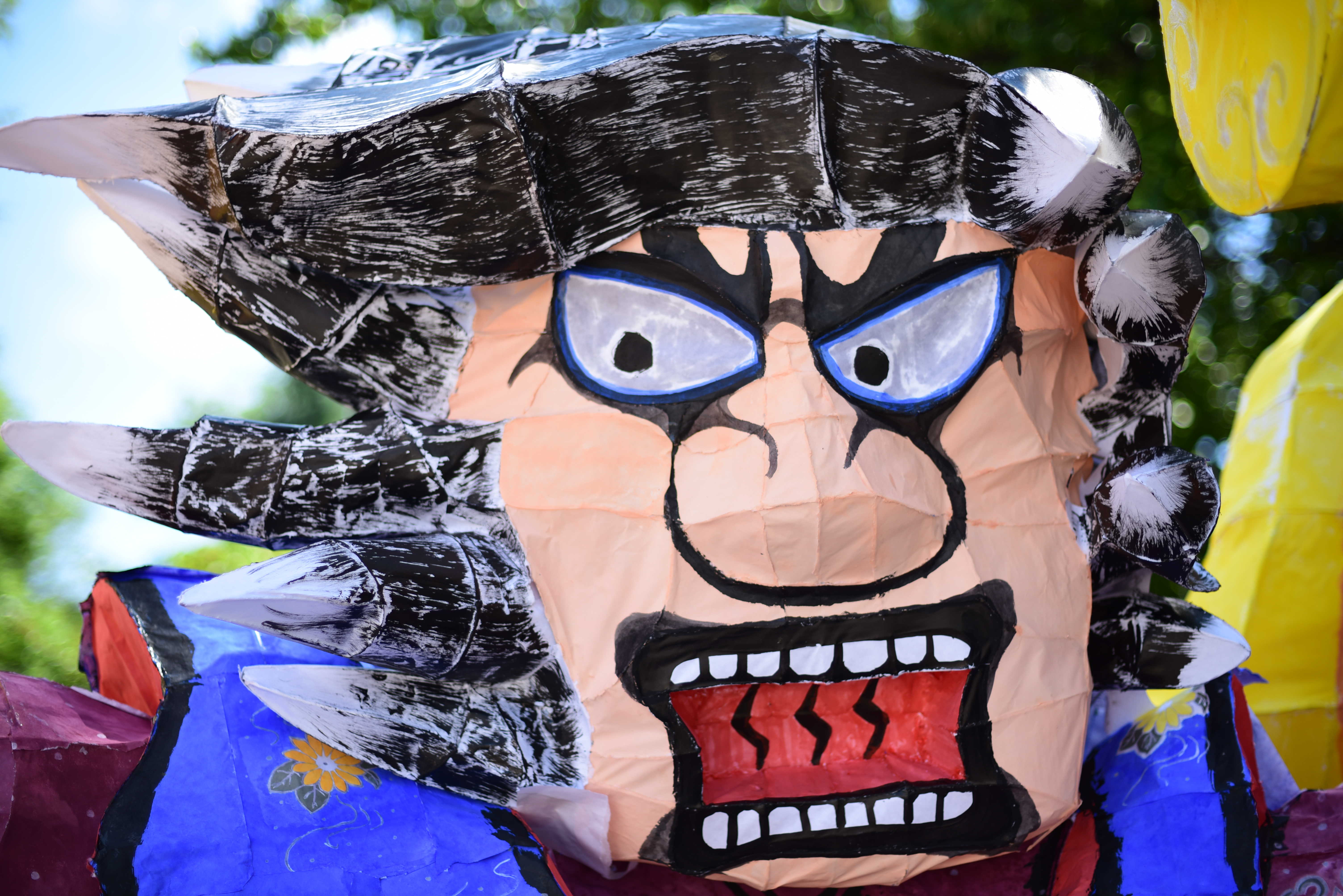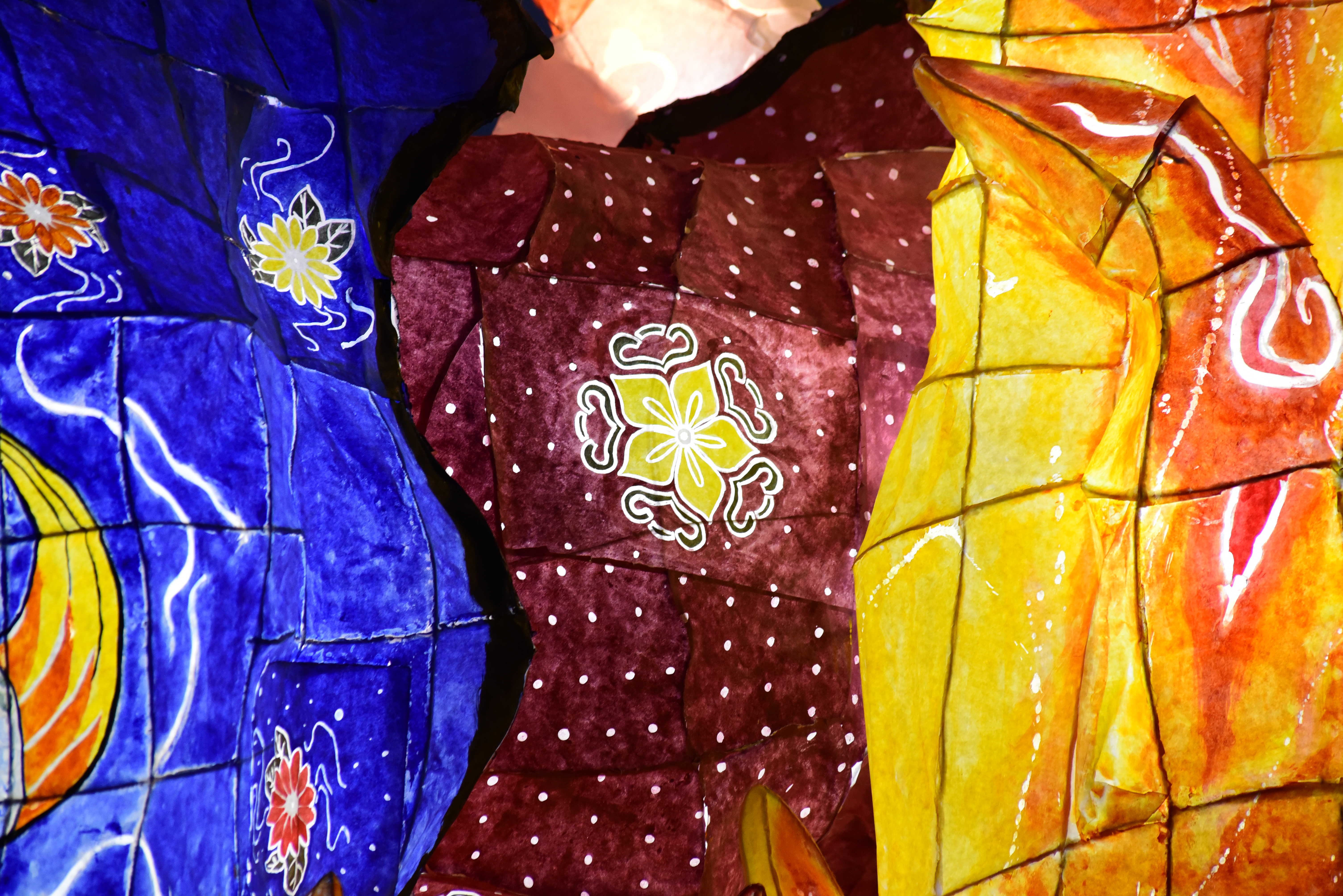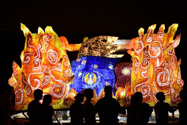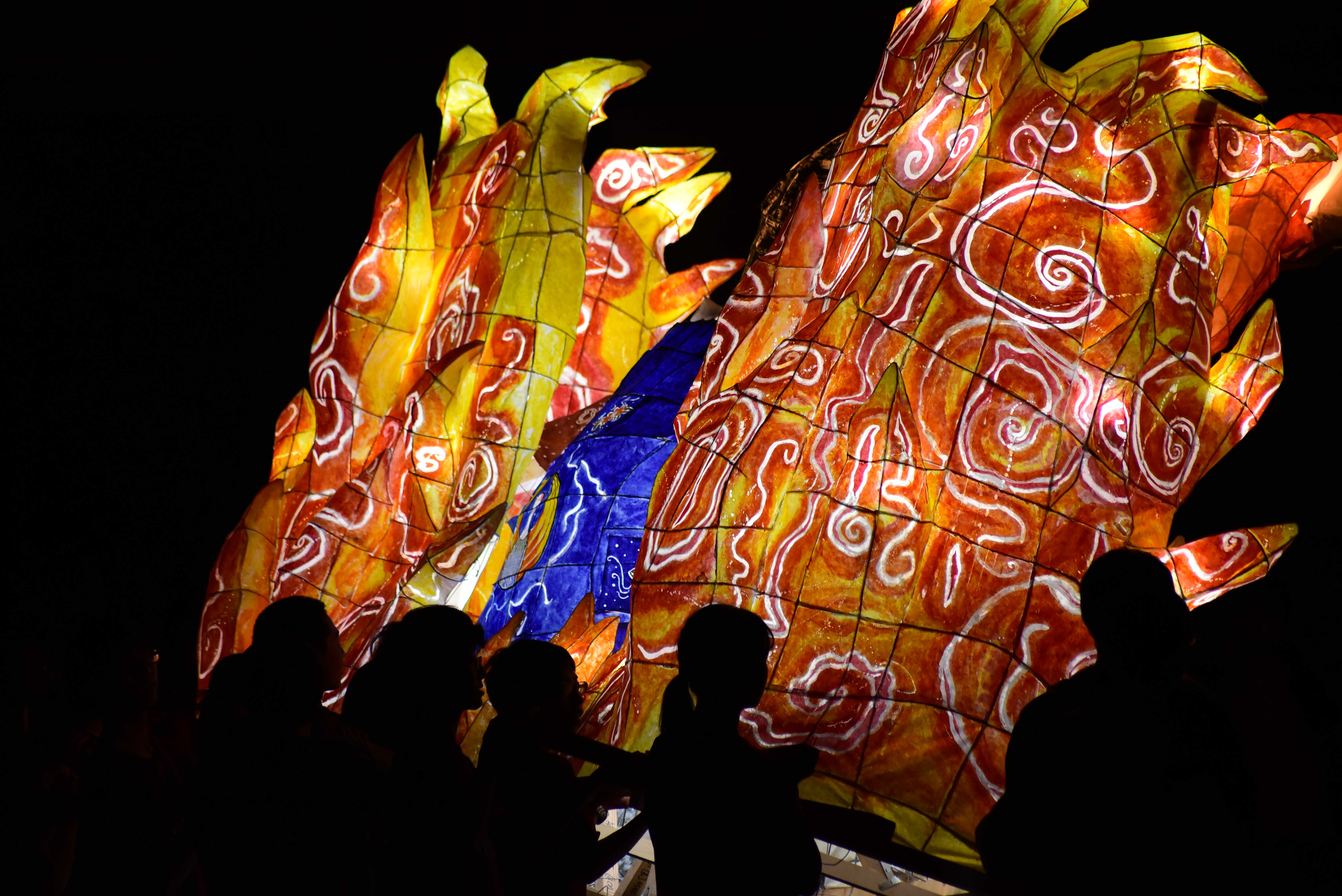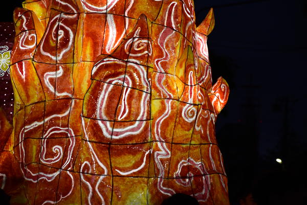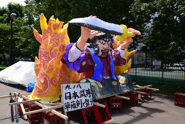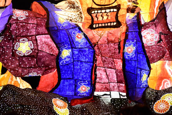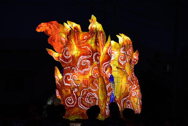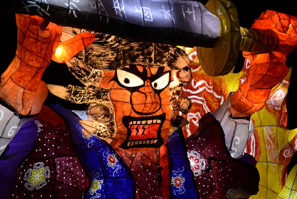 特に配色が素晴らしいと思っていて、内側には暗い寒色系の色、外側に明るい暖色系の色を持ってきているので、内側は引き締めつつも全体では大きく見せることに成功しています。 暗い色もただ暗くするだけでは形がわからなくなってしまうので、きちんとロウ点を打っていたり明るい柄を入れていたりとよく工夫されています。さらに炎がバックにあるので体の輪郭もよくわかります。 針金も不自然なところはないですし、電飾もよく光っていました。 あともう一つ「おお」と思ったのが、ギャラリーの写真を見るとわかりますが、このクラスは審査員席で前に傾けていて、審査員に対して覆いかぶさるような演出をしていました。青森ねぶた祭りを観に行くとよくわかりますが前に傾けられると迫力が倍増するんですよね。あとは北高行灯の奥行き足りなさすぎ問題に対してこの手を使うと高さを奥行きとして使うことができるので、よさそうです。 ただ、これけっこう危ない (最悪角材が折れたりパーツが外れたりして審査員席に落ちる) と思うので後輩のみなさんはやらないほうがいいと思います。現段階では禁止されていない?かもしれませんがもしかしたら今後禁止されるかも。