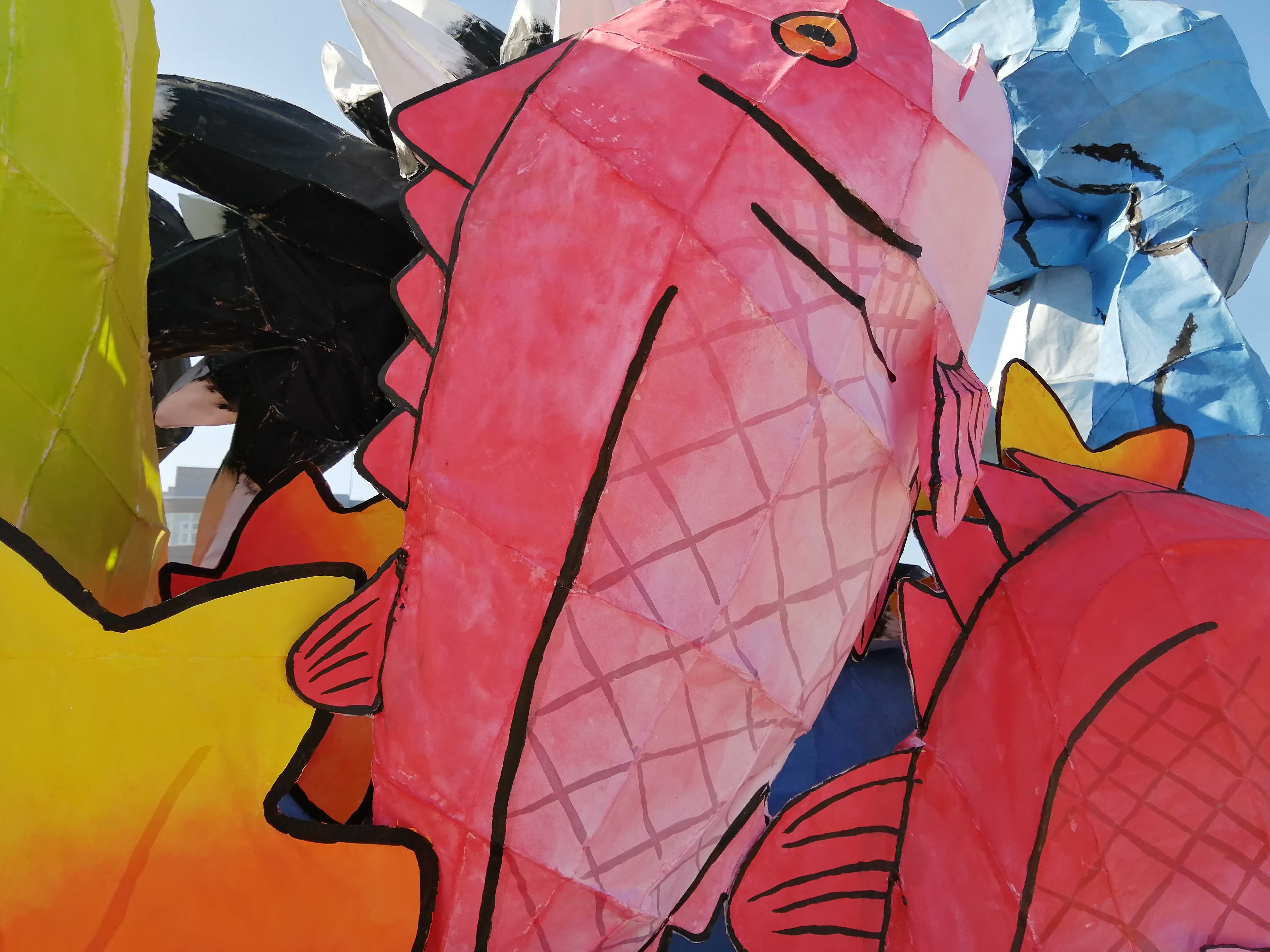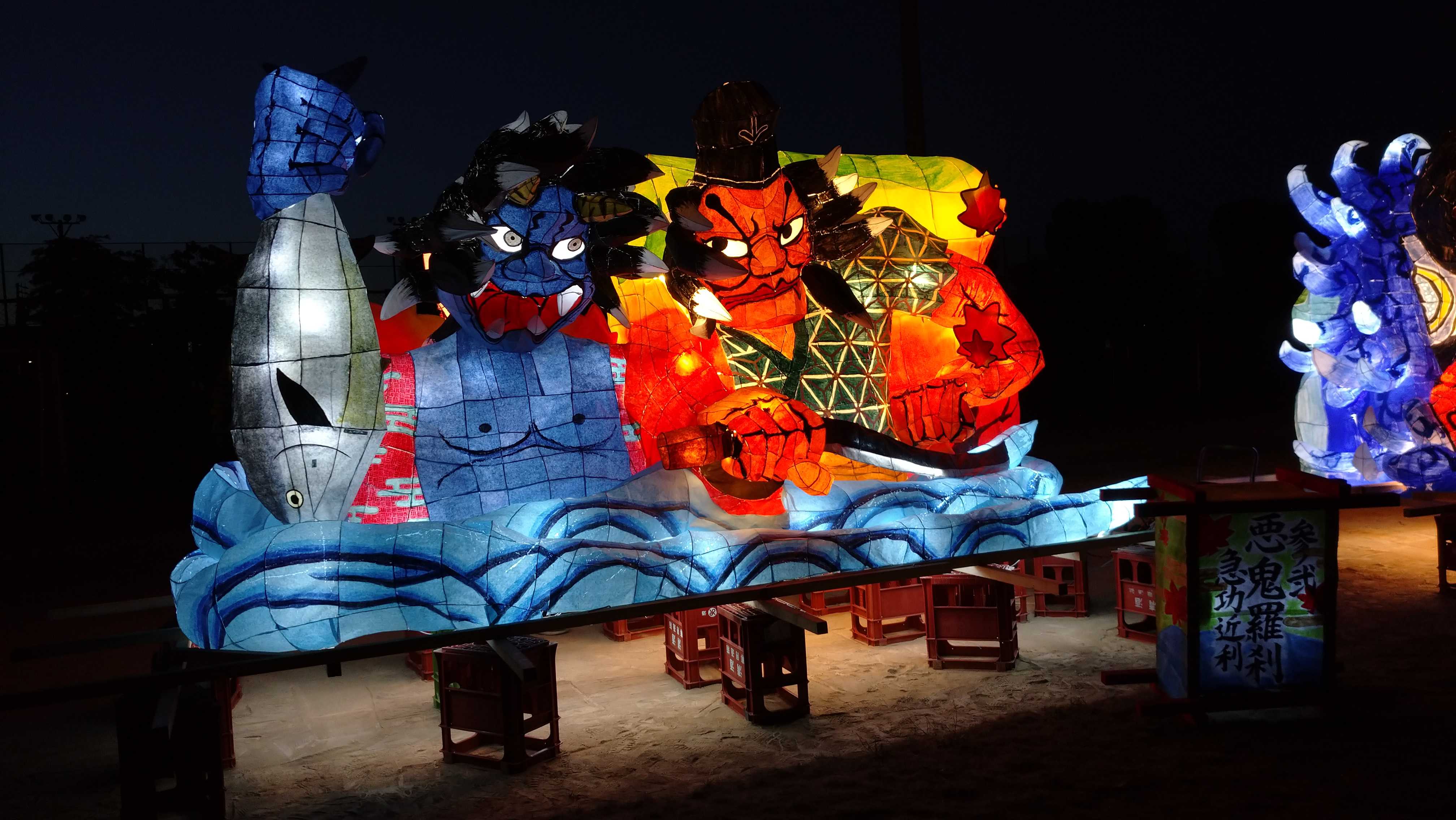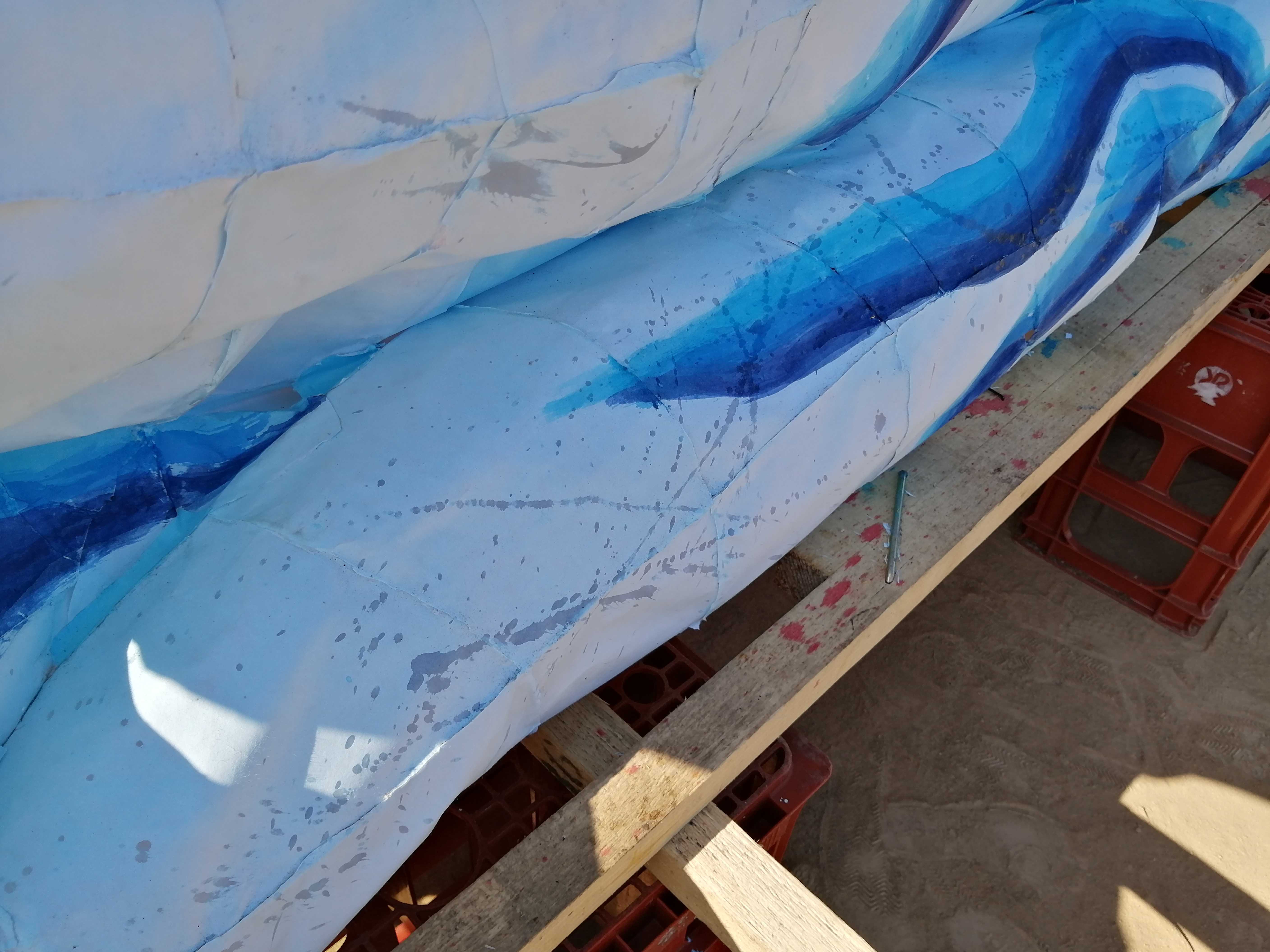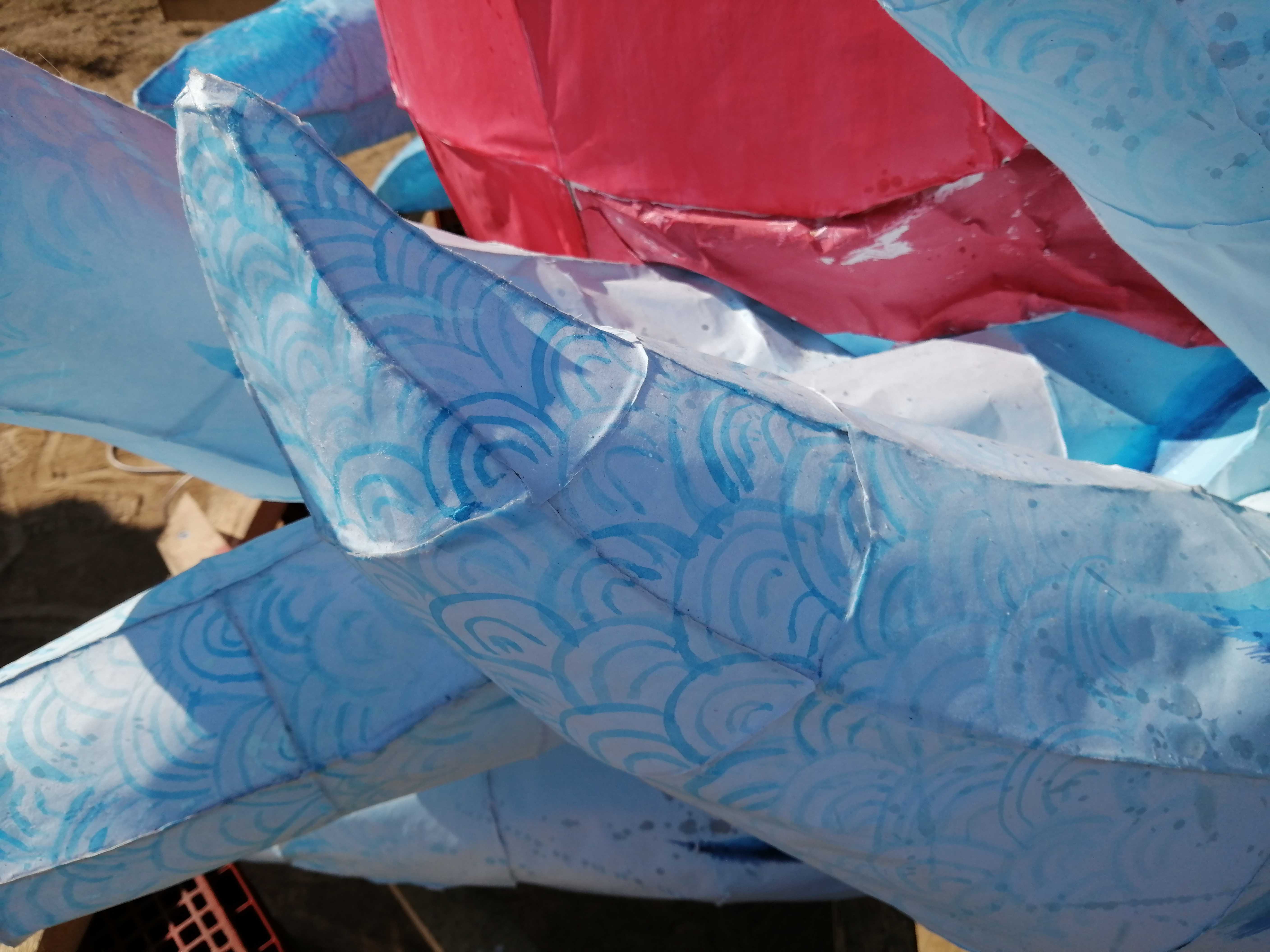 波の先に細かい柄も入れていたようですが、(少なくとも写真で見ると) 光らせたときに目立たなくなってしまっていたのがもったいなかったです。細かく同系色の柄は光を入れて遠くから見てみるという実験をやったほうがいいのかなと思いました。