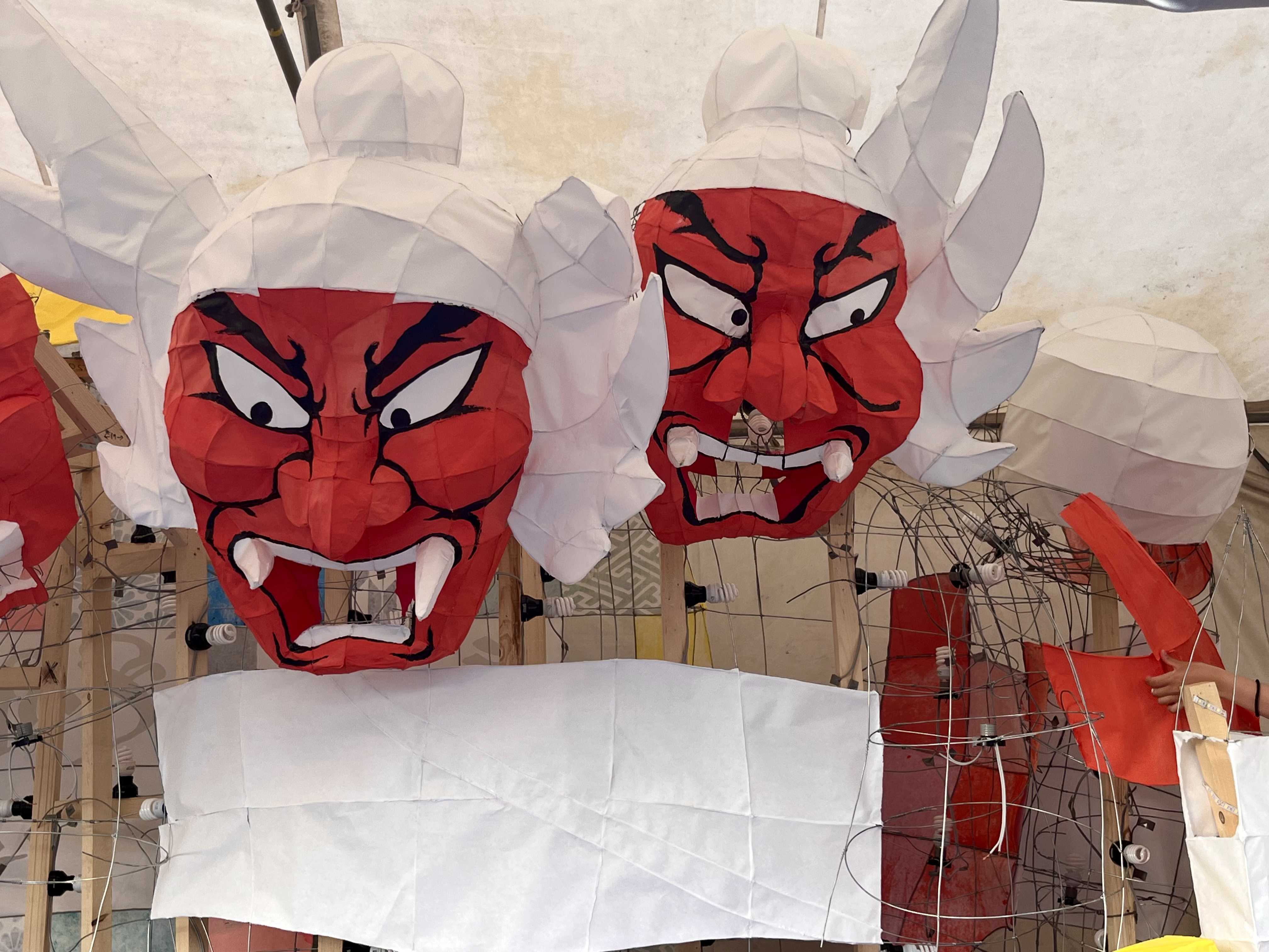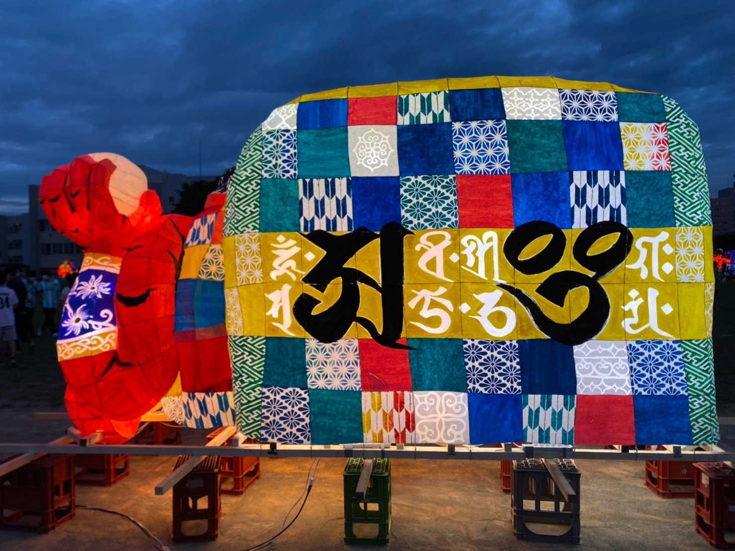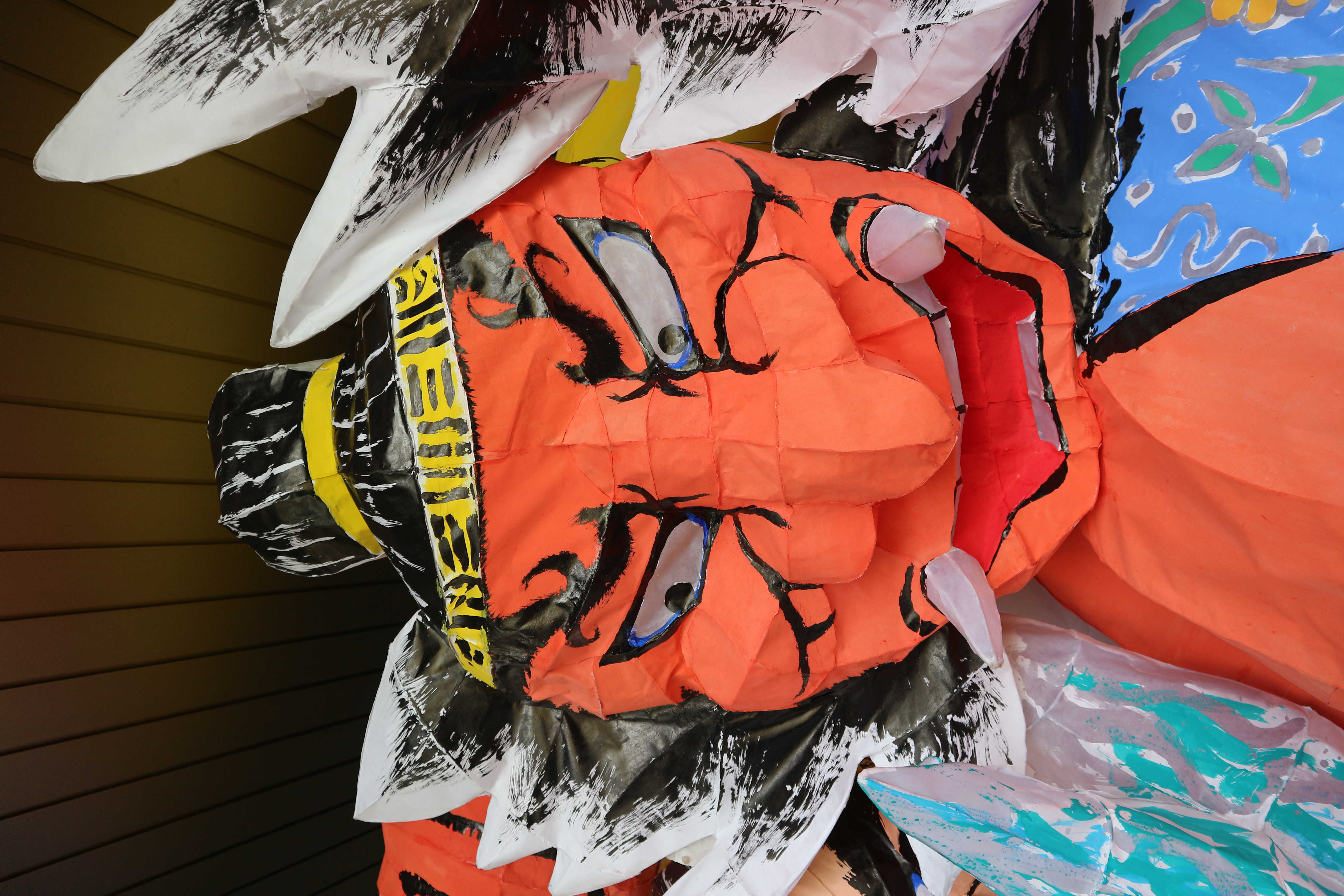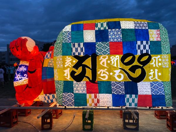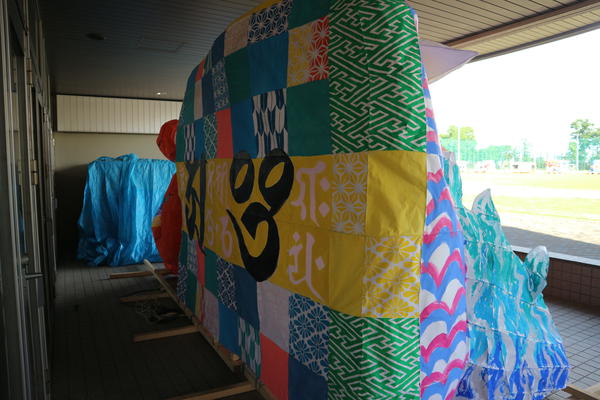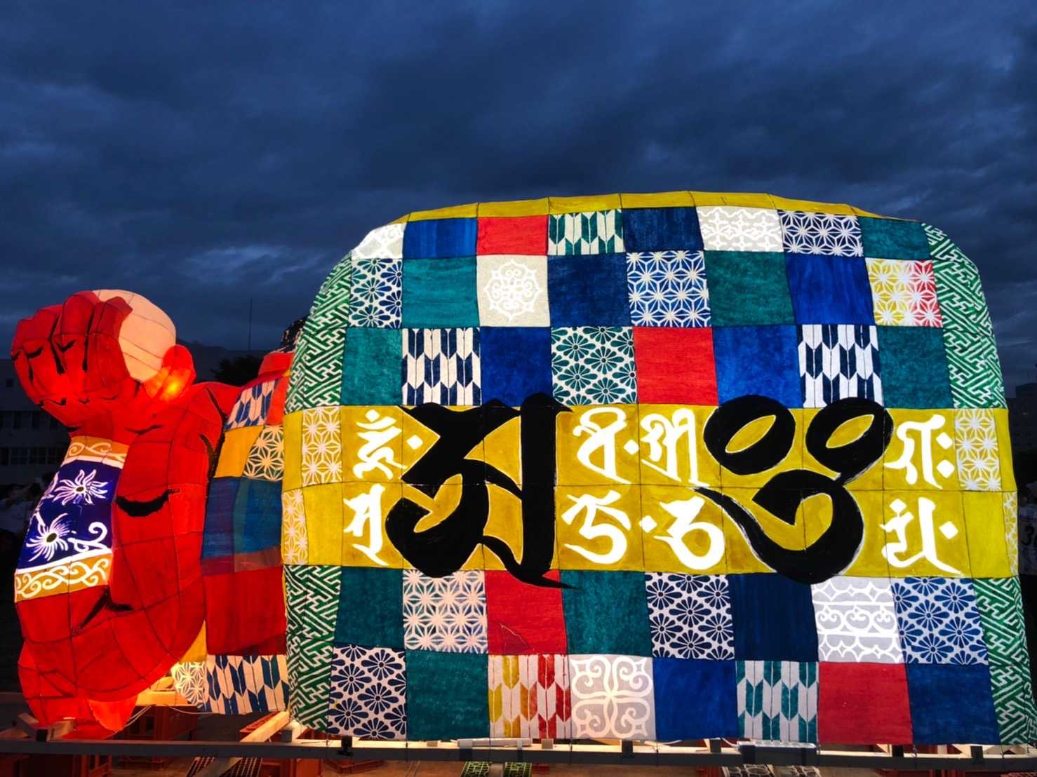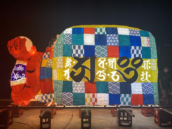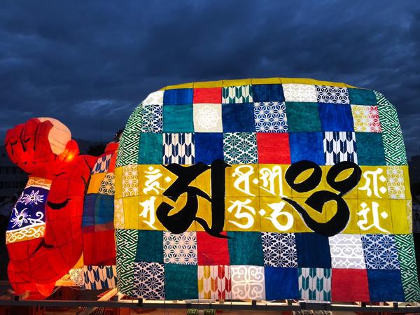 波?青い炎?もグラデーションになっていてきれい。青緑というのもなかなかない色で新鮮でした。 顔が4つもありますがどれもクオリティが高いです。 裏の梵字もかっこいい!パッチワークも丁寧で、針金で格子のサイズを厳密に決めて作ったんですよねきっと。 下絵を拝見しましたが、すごく上手いなと思う一方どう立体にしていくかが難しそうな印象で、実際できあがったものを見ても窮屈そうに感じました。作る形を各制作者間 (特に下絵担当と針金担当) でどうやって認識合わせしていくかというのも作業開始前の設計段階での課題なのかなと感じました。