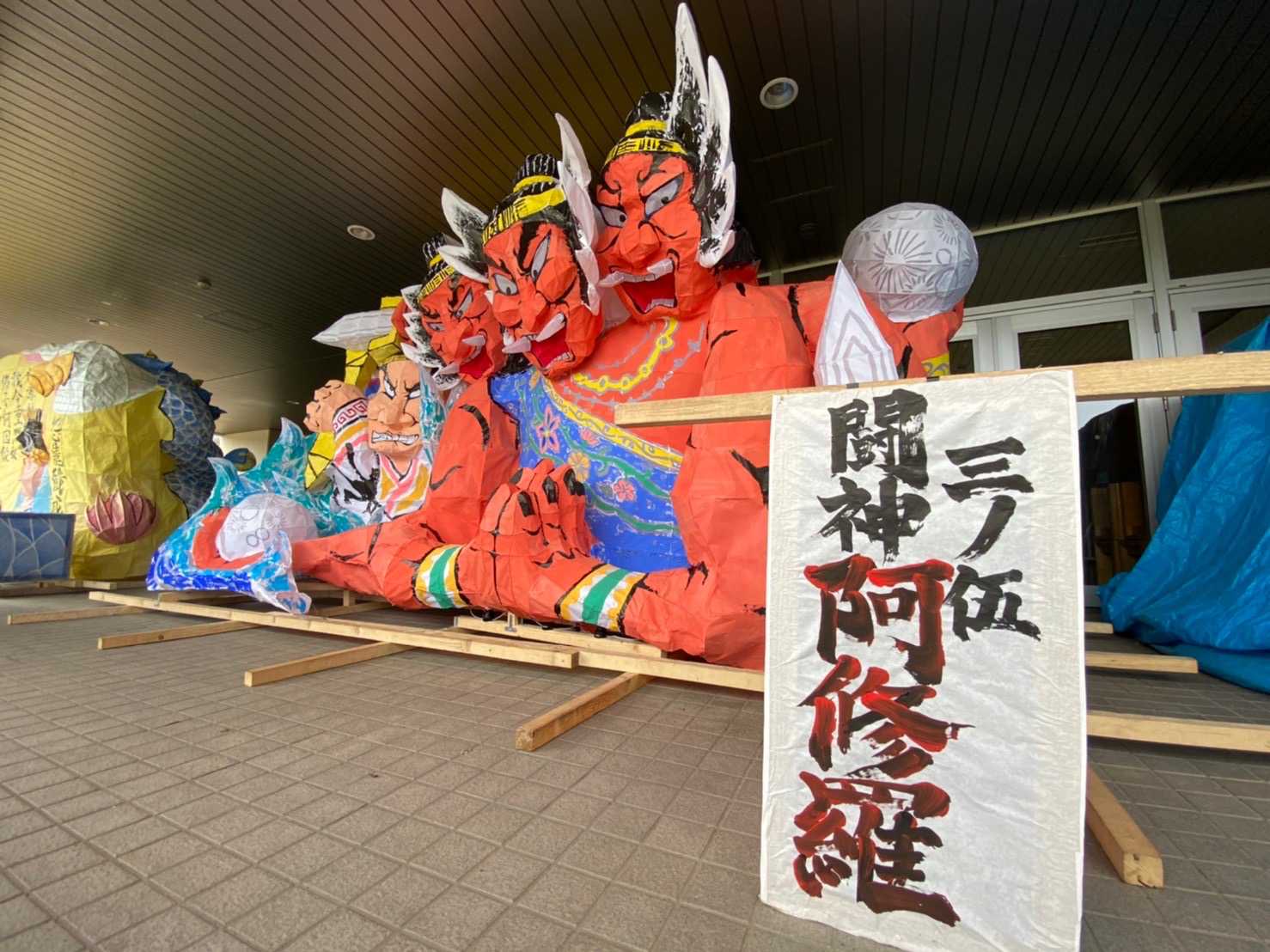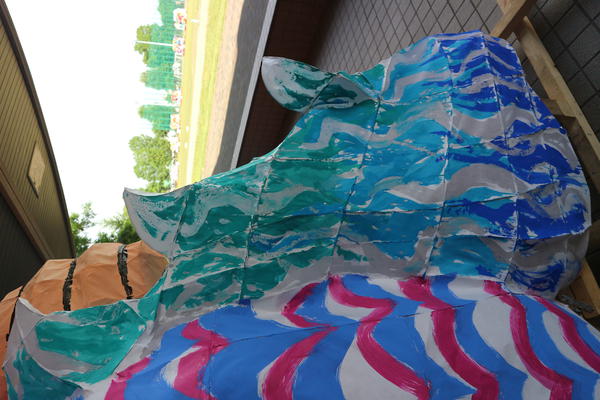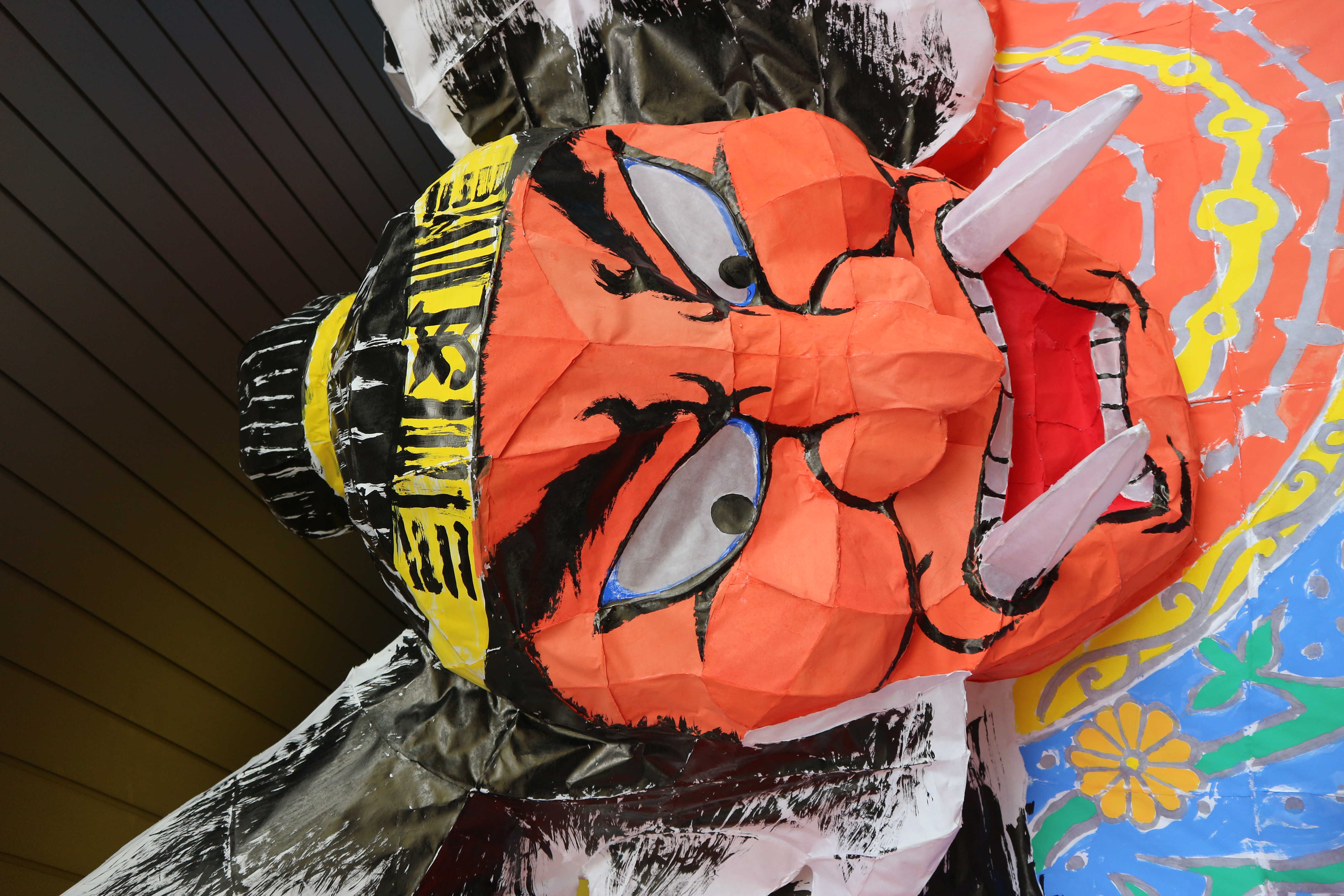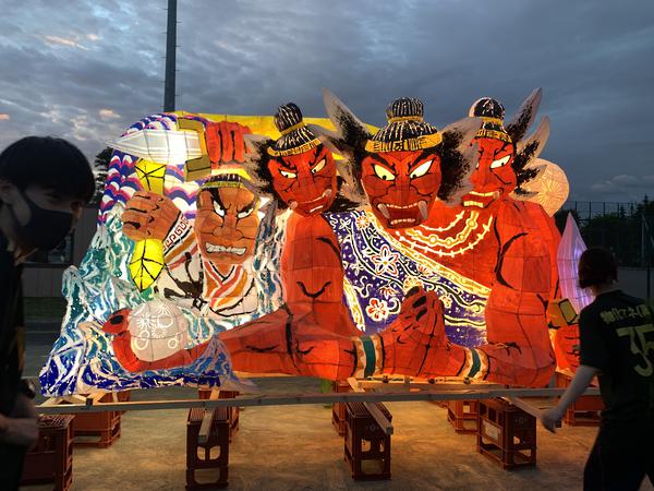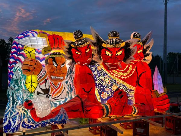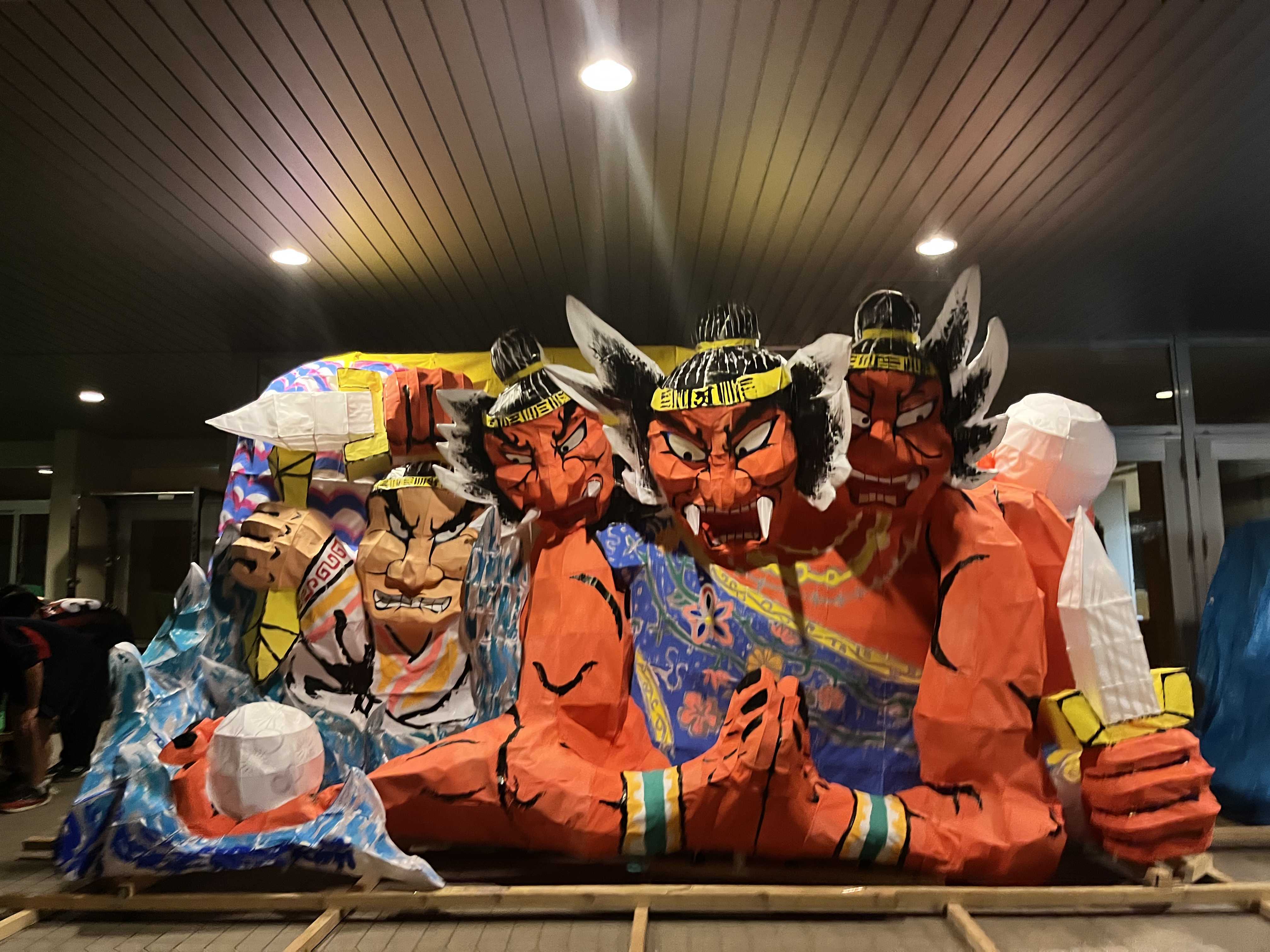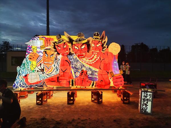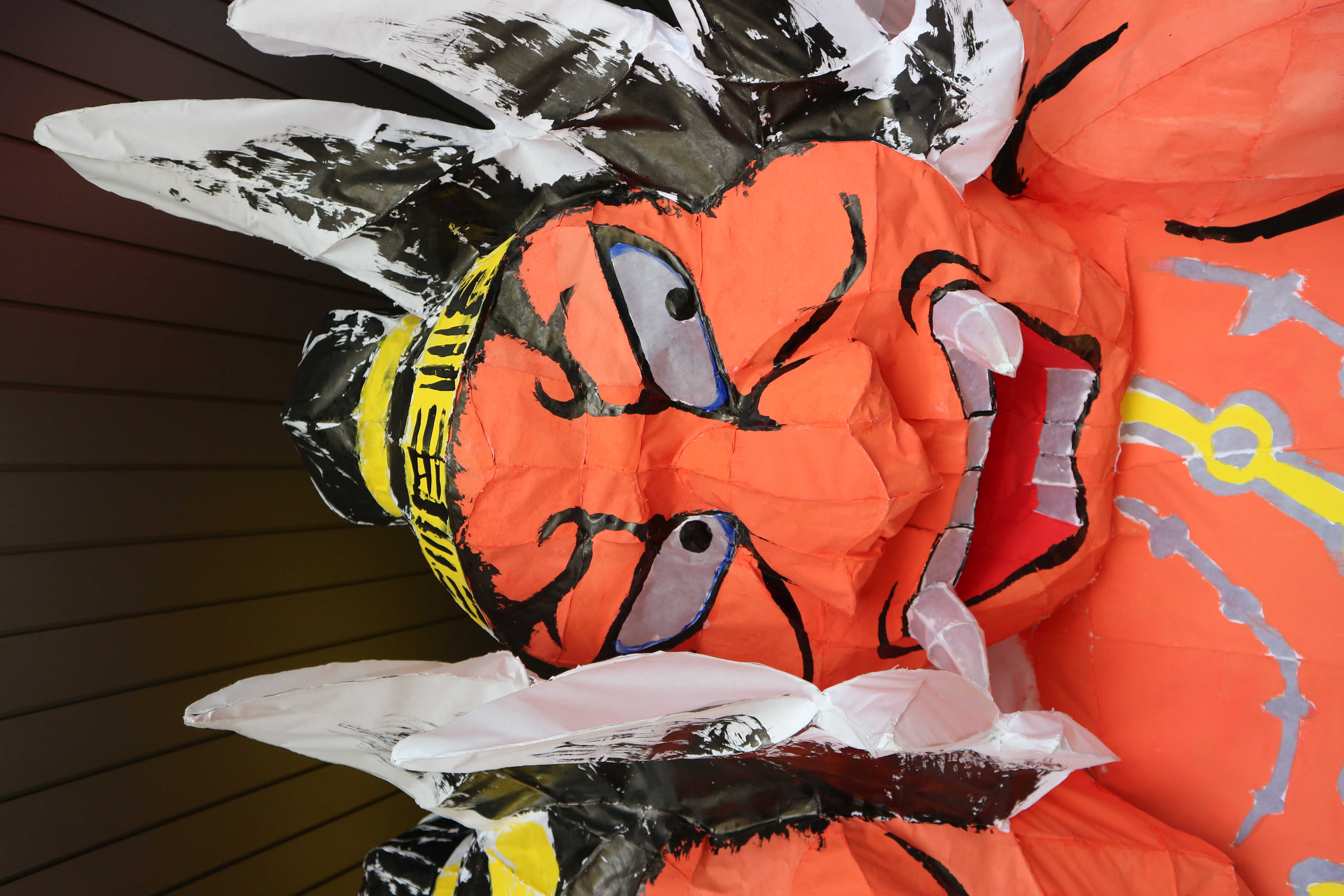 波?青い炎?もグラデーションになっていてきれい。青緑というのもなかなかない色で新鮮でした。 顔が4つもありますがどれもクオリティが高いです。 裏の梵字もかっこいい!パッチワークも丁寧で、針金で格子のサイズを厳密に決めて作ったんですよねきっと。 下絵を拝見しましたが、すごく上手いなと思う一方どう立体にしていくかが難しそうな印象で、実際できあがったものを見ても窮屈そうに感じました。作る形を各制作者間 (特に下絵担当と針金担当) でどうやって認識合わせしていくかというのも作業開始前の設計段階での課題なのかなと感じました。