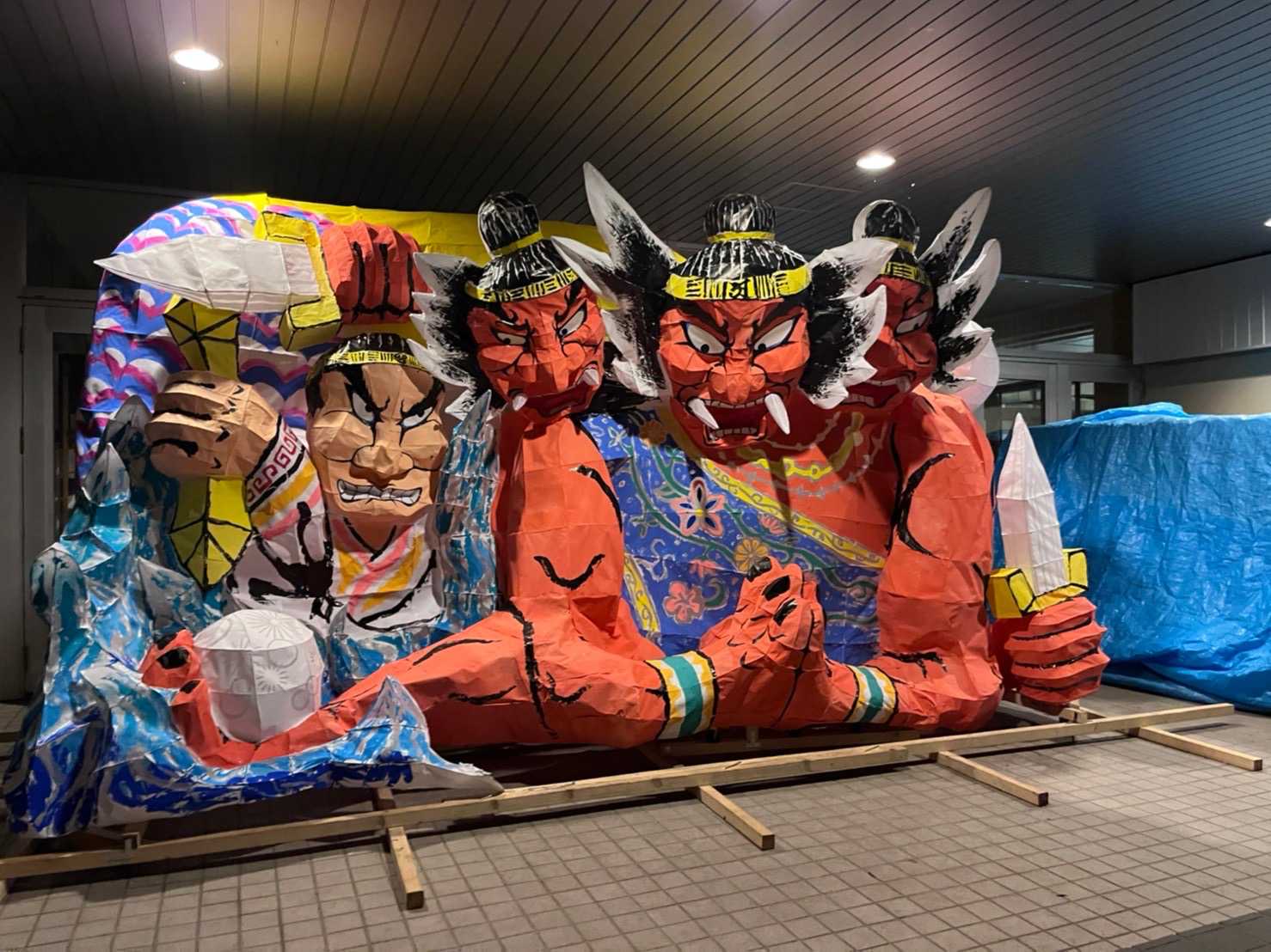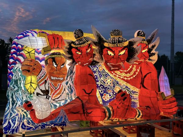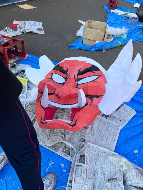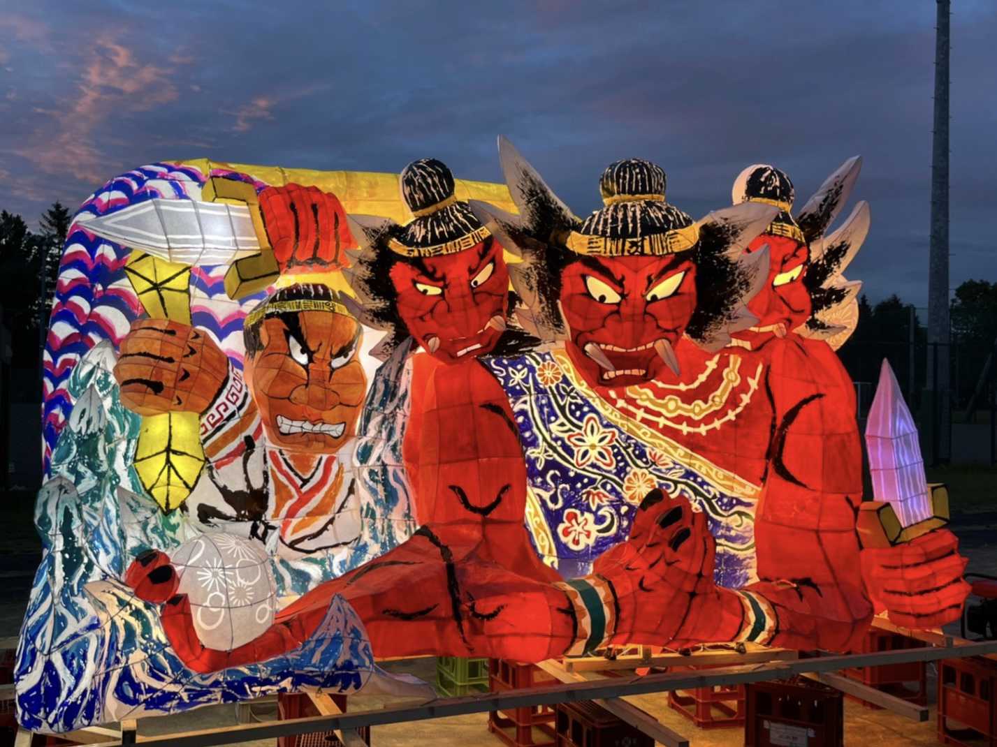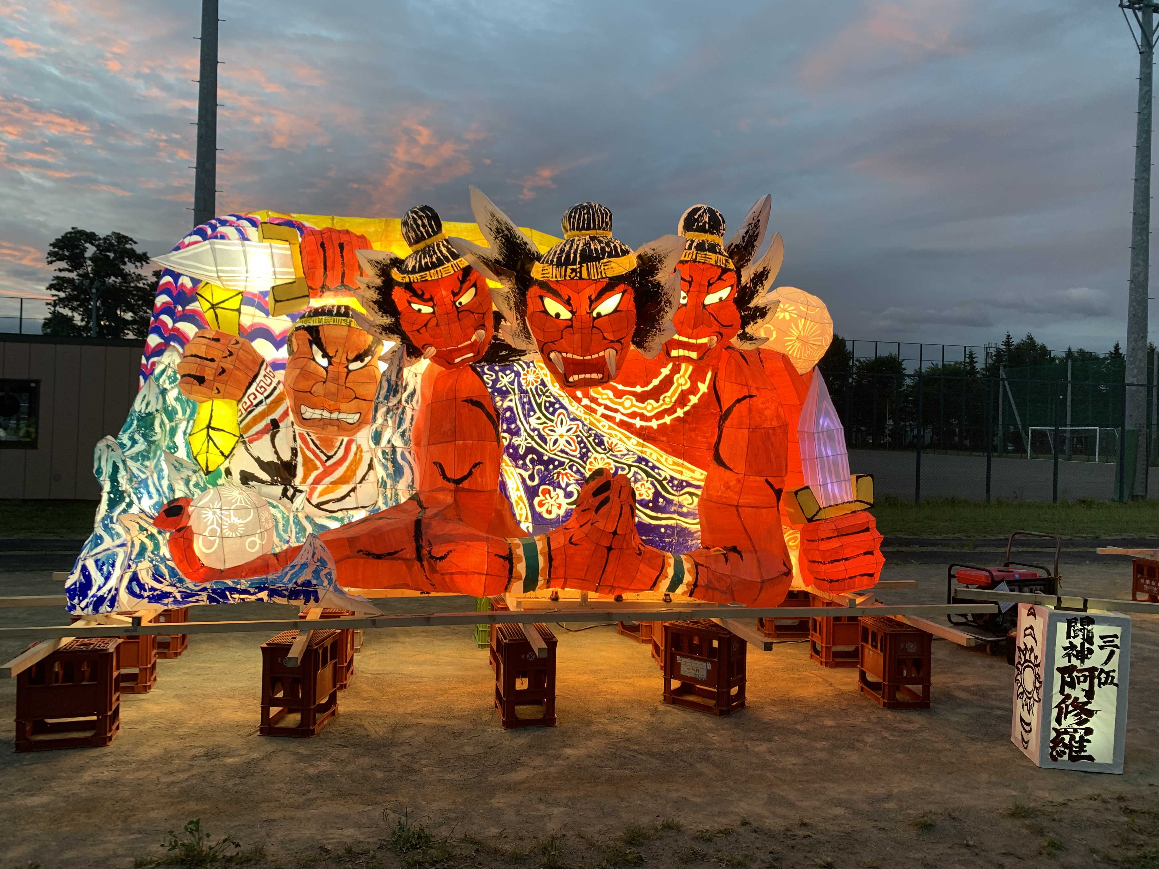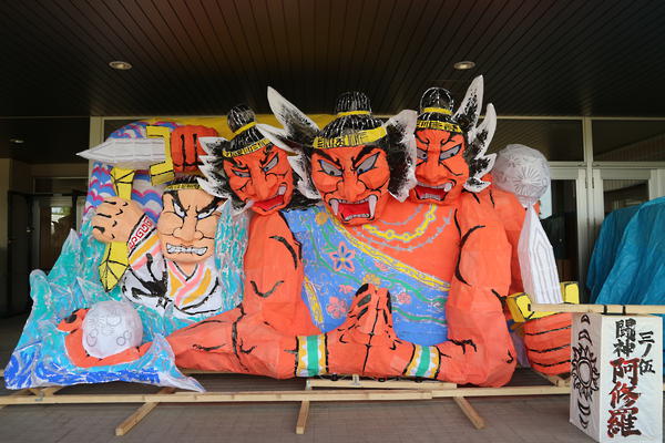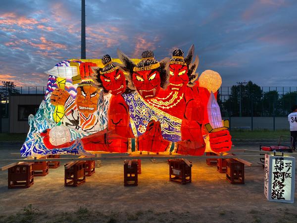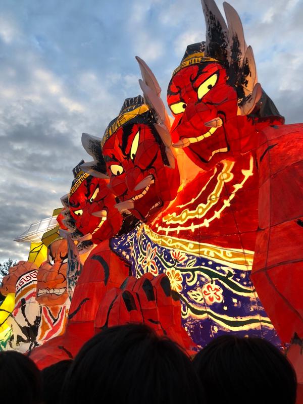 波?青い炎?もグラデーションになっていてきれい。青緑というのもなかなかない色で新鮮でした。 顔が4つもありますがどれもクオリティが高いです。 裏の梵字もかっこいい!パッチワークも丁寧で、針金で格子のサイズを厳密に決めて作ったんですよねきっと。 下絵を拝見しましたが、すごく上手いなと思う一方どう立体にしていくかが難しそうな印象で、実際できあがったものを見ても窮屈そうに感じました。作る形を各制作者間 (特に下絵担当と針金担当) でどうやって認識合わせしていくかというのも作業開始前の設計段階での課題なのかなと感じました。