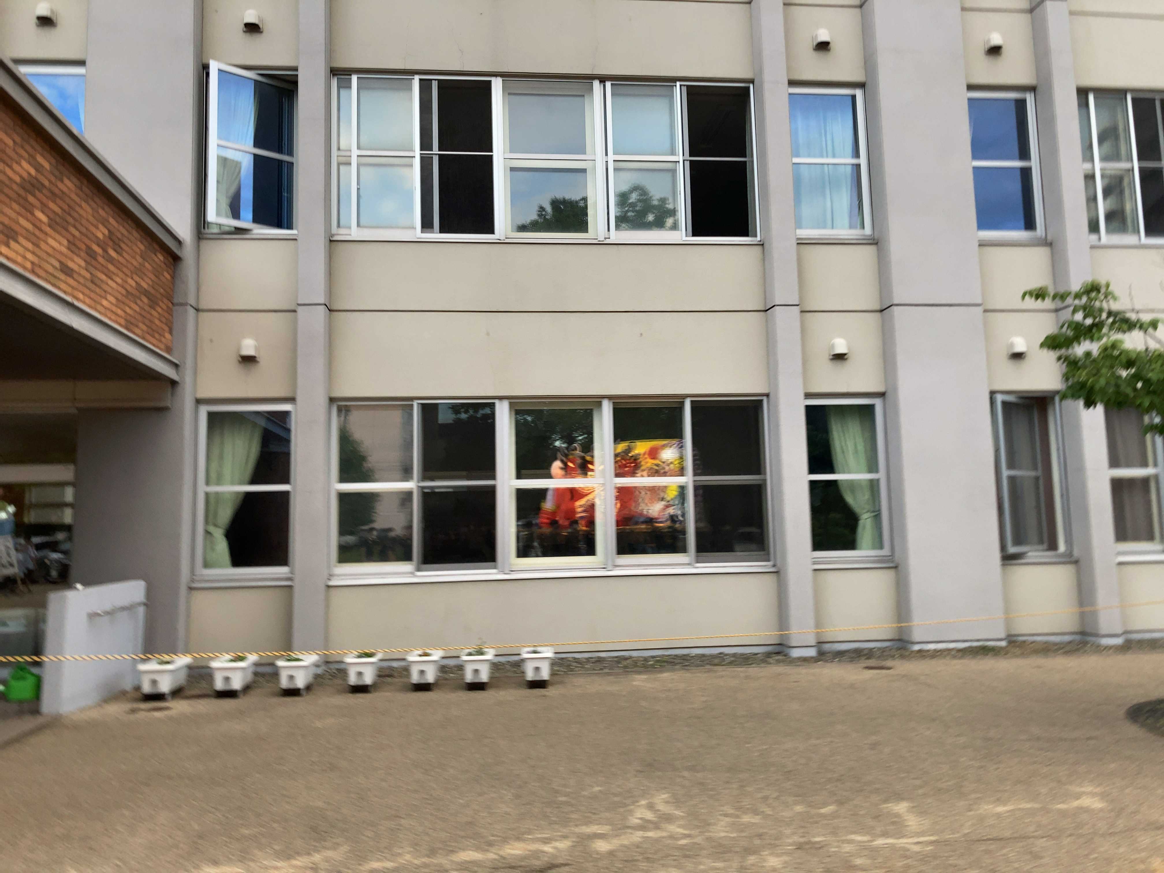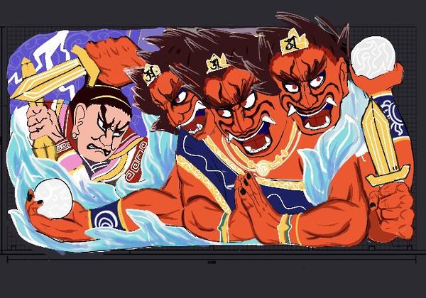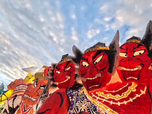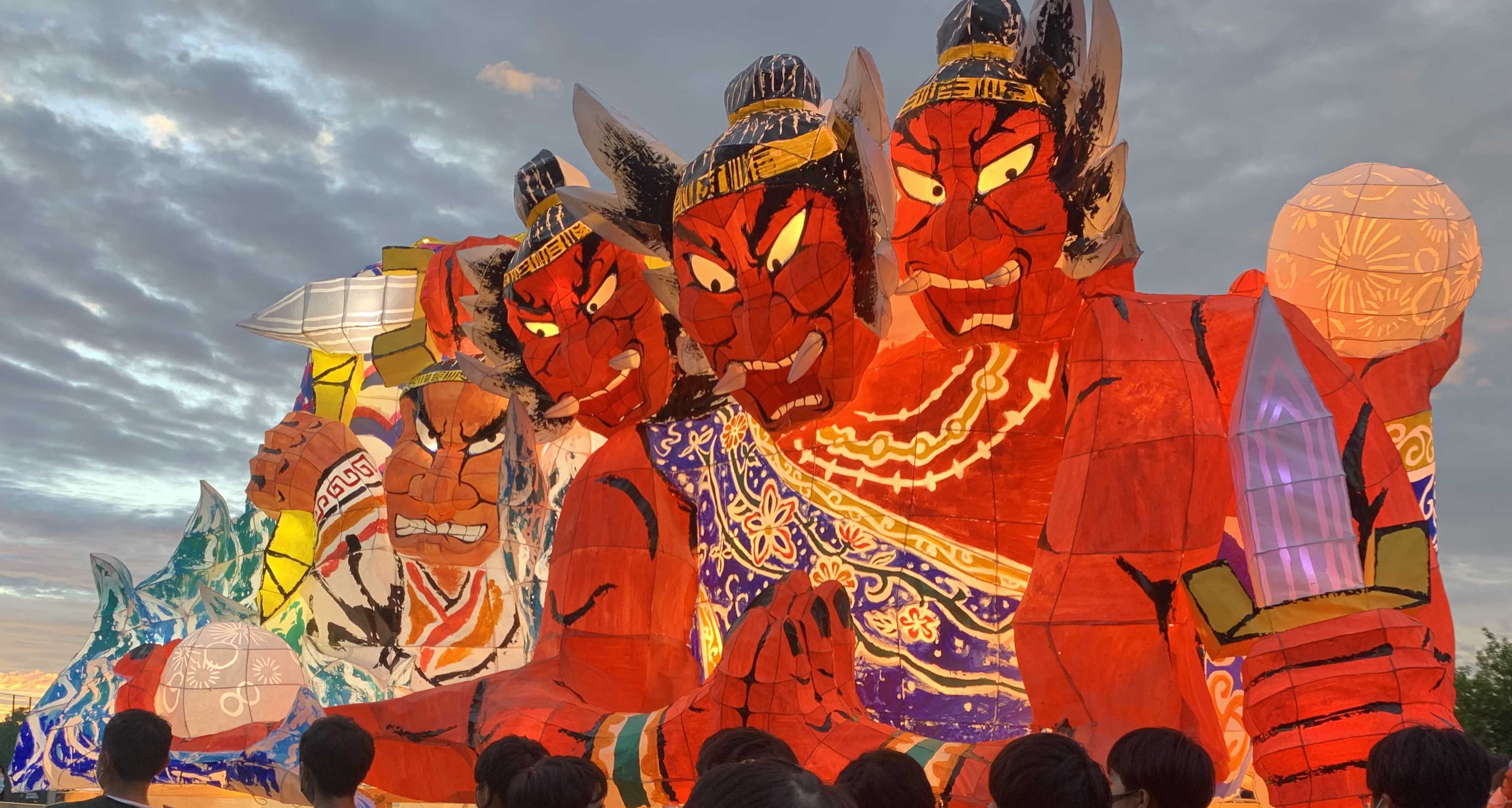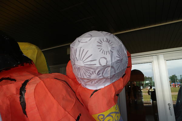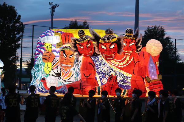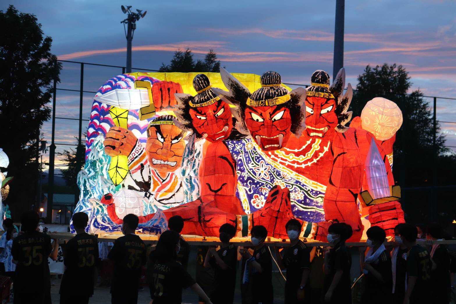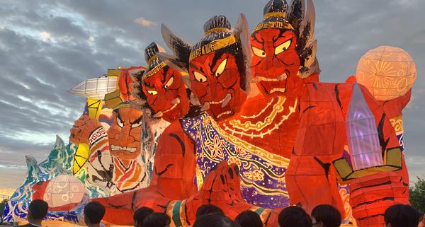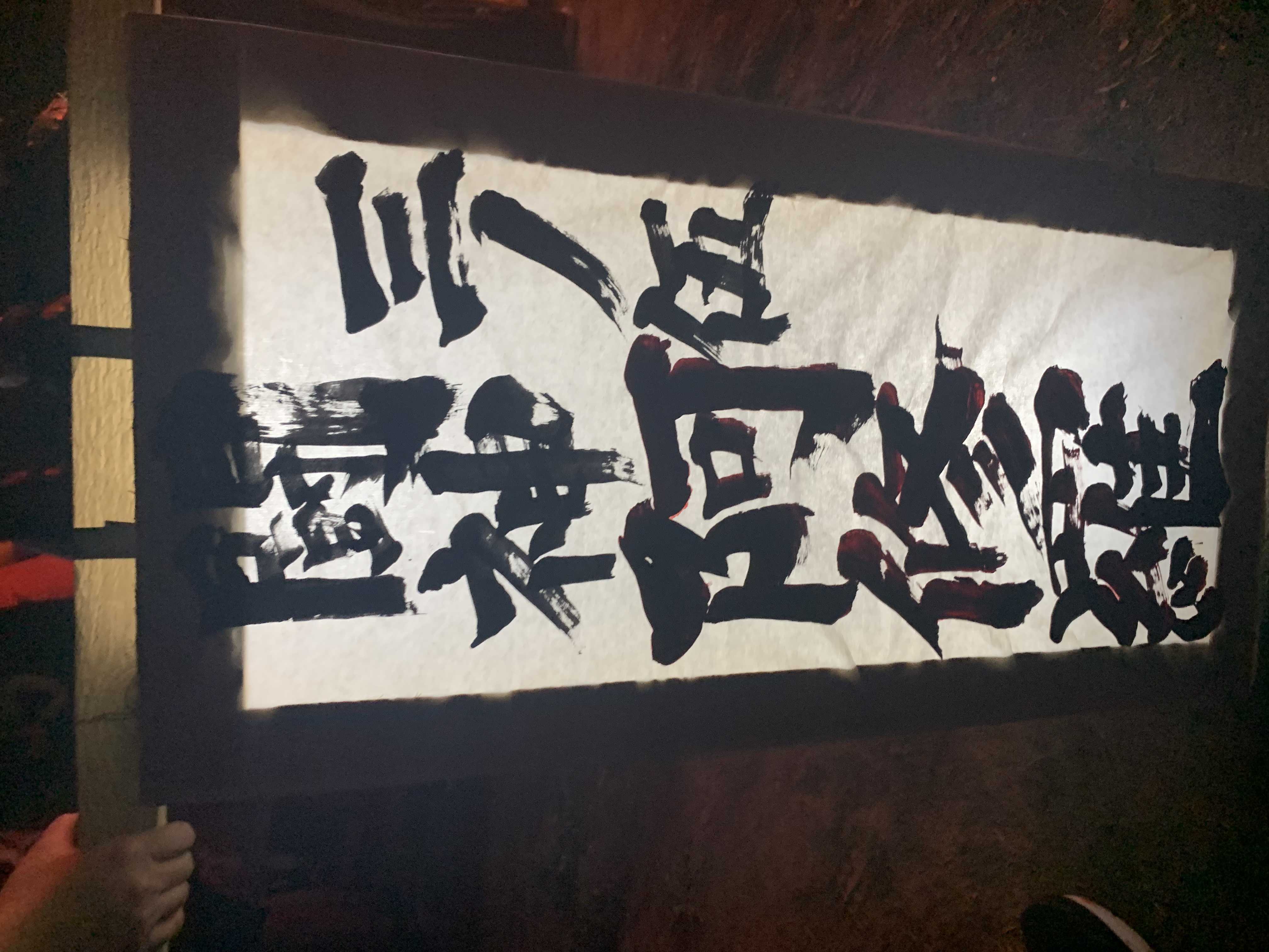 波?青い炎?もグラデーションになっていてきれい。青緑というのもなかなかない色で新鮮でした。 顔が4つもありますがどれもクオリティが高いです。 裏の梵字もかっこいい!パッチワークも丁寧で、針金で格子のサイズを厳密に決めて作ったんですよねきっと。 下絵を拝見しましたが、すごく上手いなと思う一方どう立体にしていくかが難しそうな印象で、実際できあがったものを見ても窮屈そうに感じました。作る形を各制作者間 (特に下絵担当と針金担当) でどうやって認識合わせしていくかというのも作業開始前の設計段階での課題なのかなと感じました。