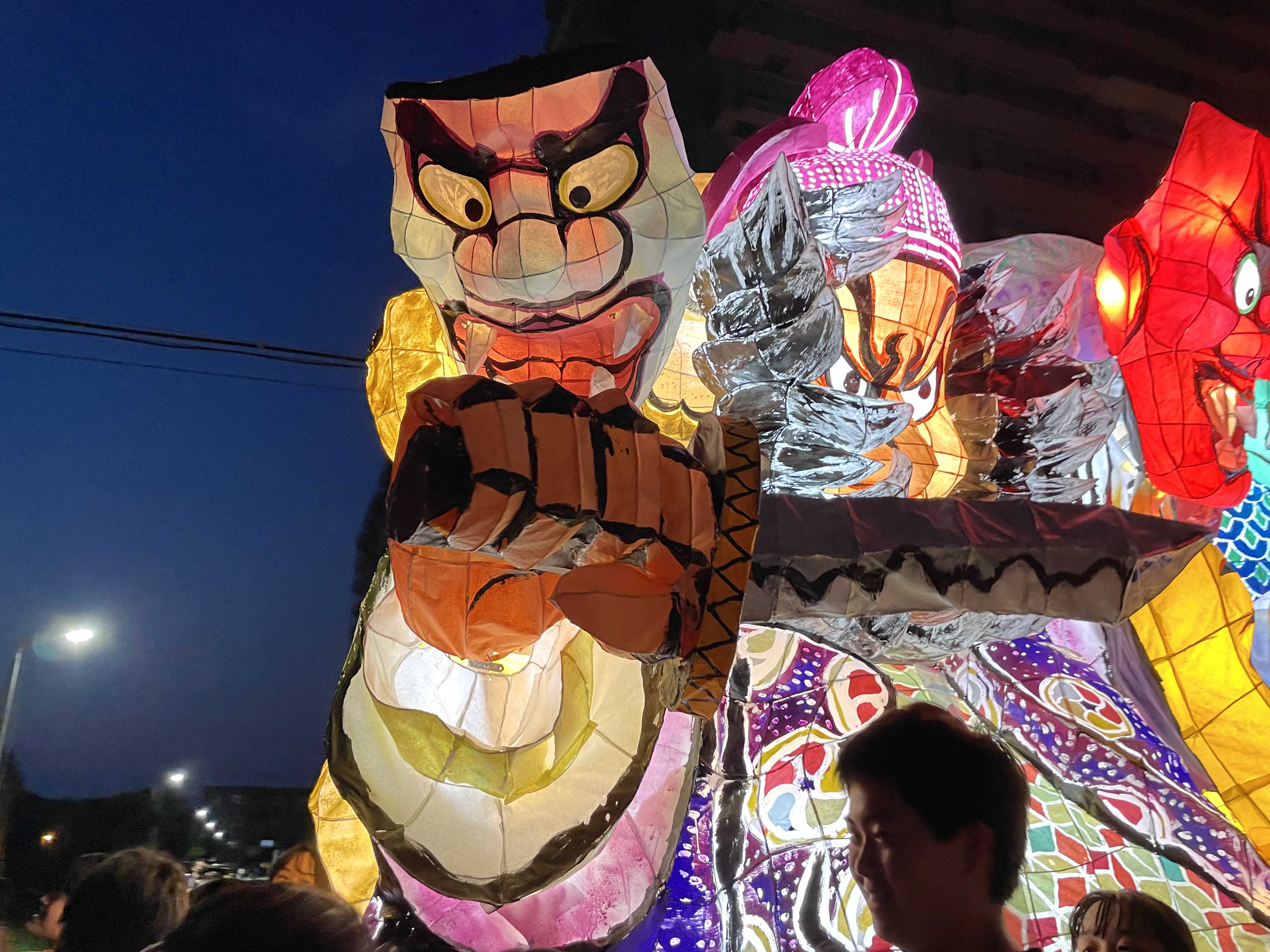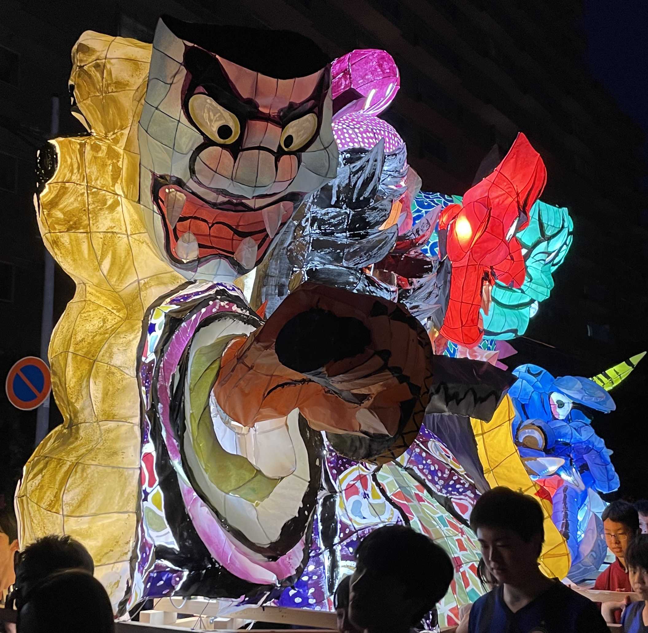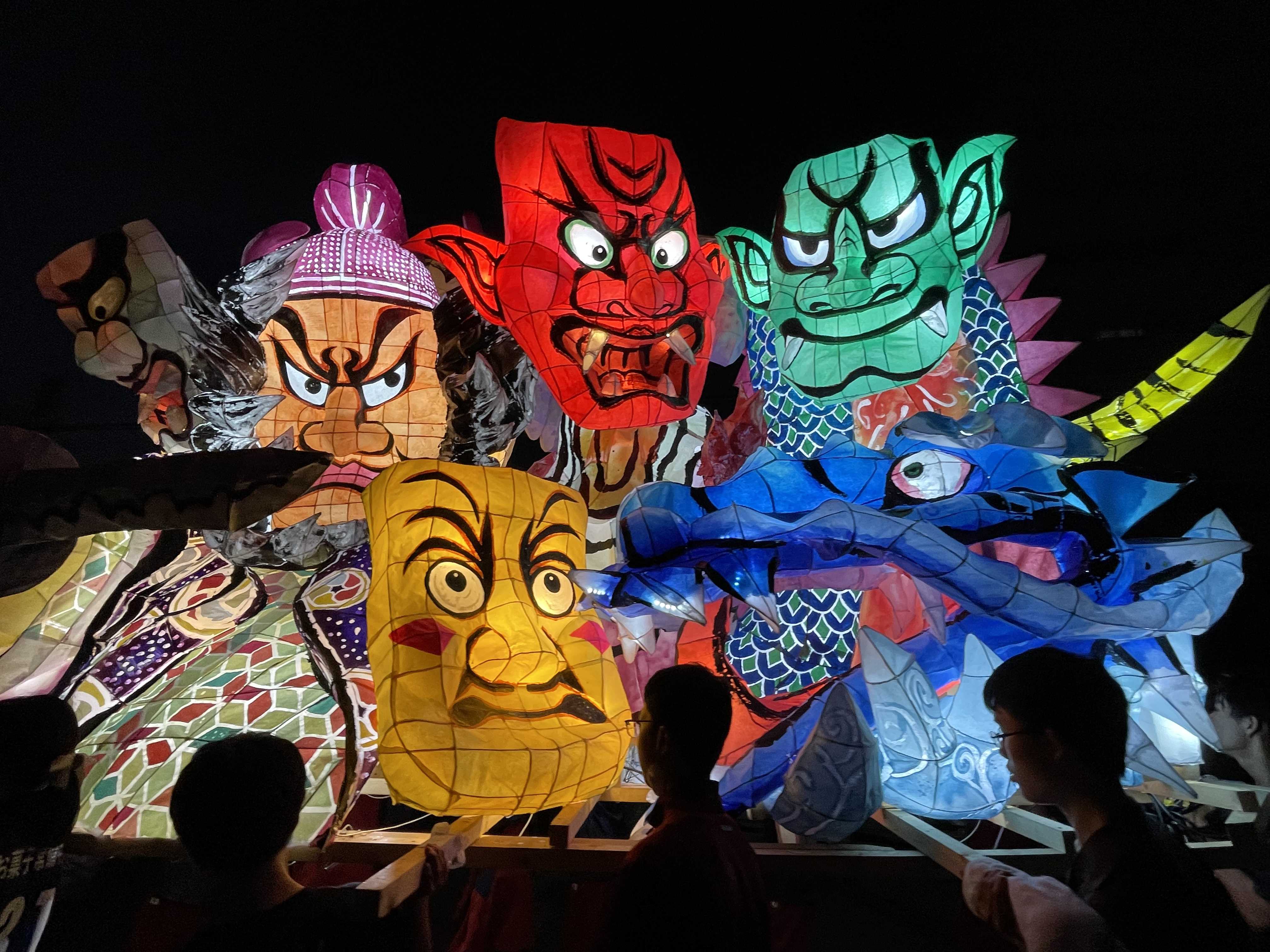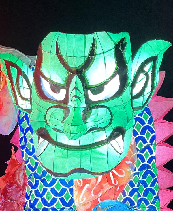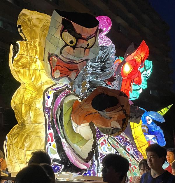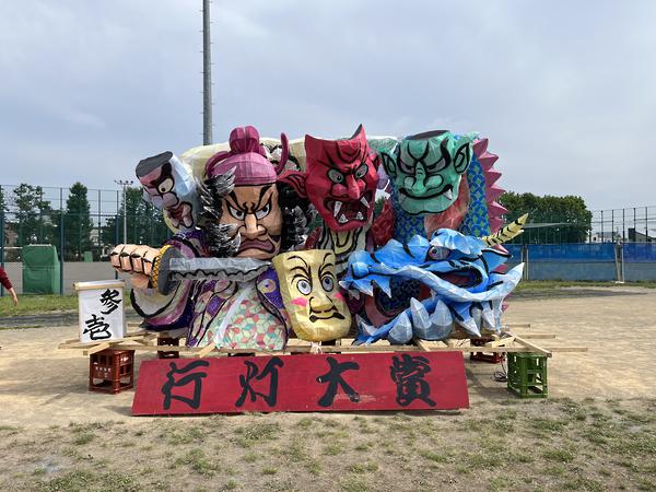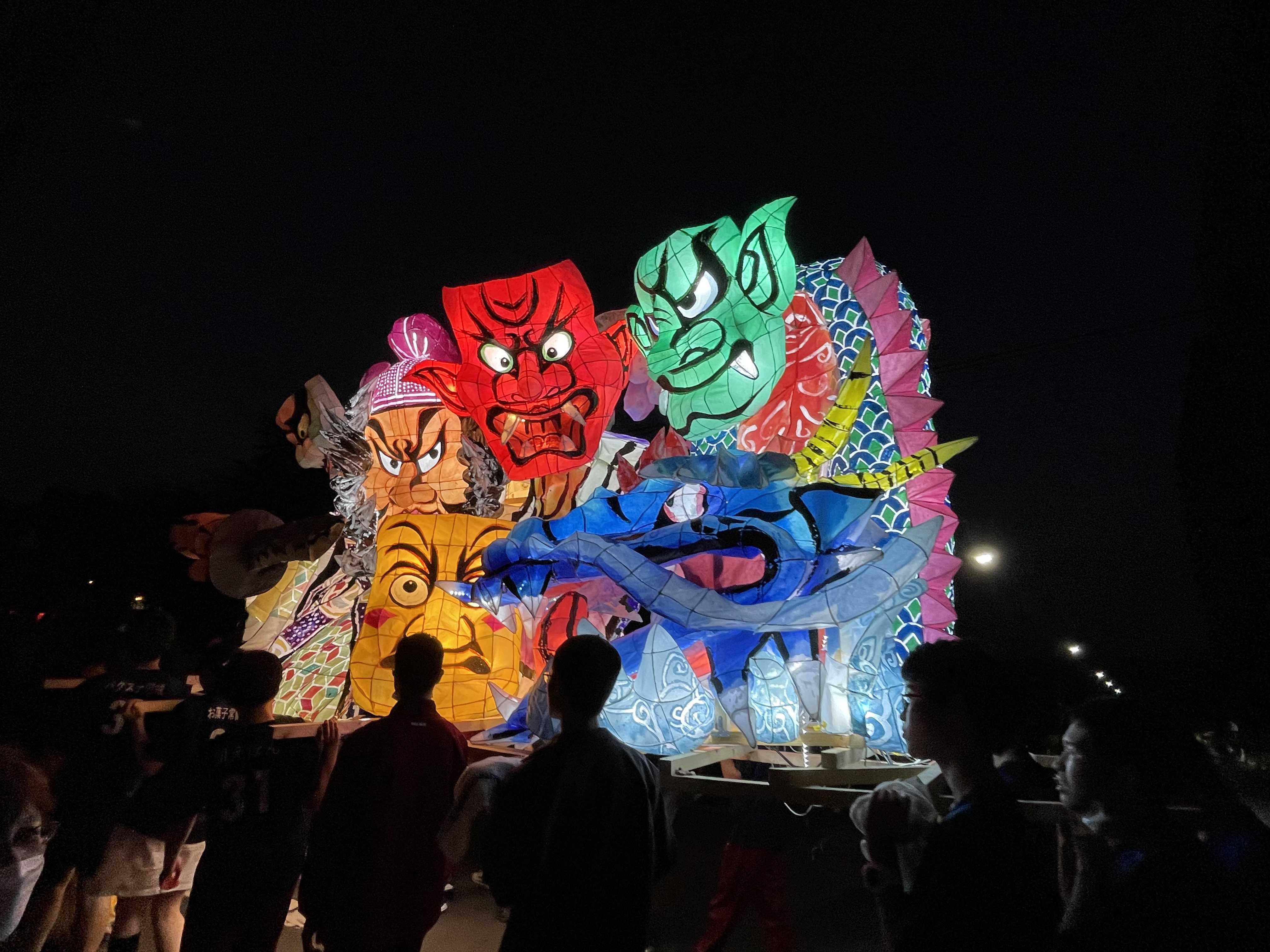 色鮮やかで、5つもある顔もいいし、丁寧に作られているし、一部光らせられなかったところがあるとはいえ納得の大賞だったと思います。 また、実物を見れていないので間違っていたら申し訳ないのですが、前面から見て中央部分が後ろまで空洞になっているんですかね?縦横比がねぶたほどない北高行灯においてこの決断は難しかったんじゃないかと思いますが、これのおかげで中央にある赤い面により立体感を持たせることができているんじゃないかと思います (写真でしか見れていないのでおそらく)。空けすぎるとスカスカになってしまうというリスクがありますがこの行灯はちょうどいいバランスになっていました。表面積も増えるし針金を作り込んだり紙を貼りにくいところも増えるしで難易度が高かったんじゃないかと思います。すごい!