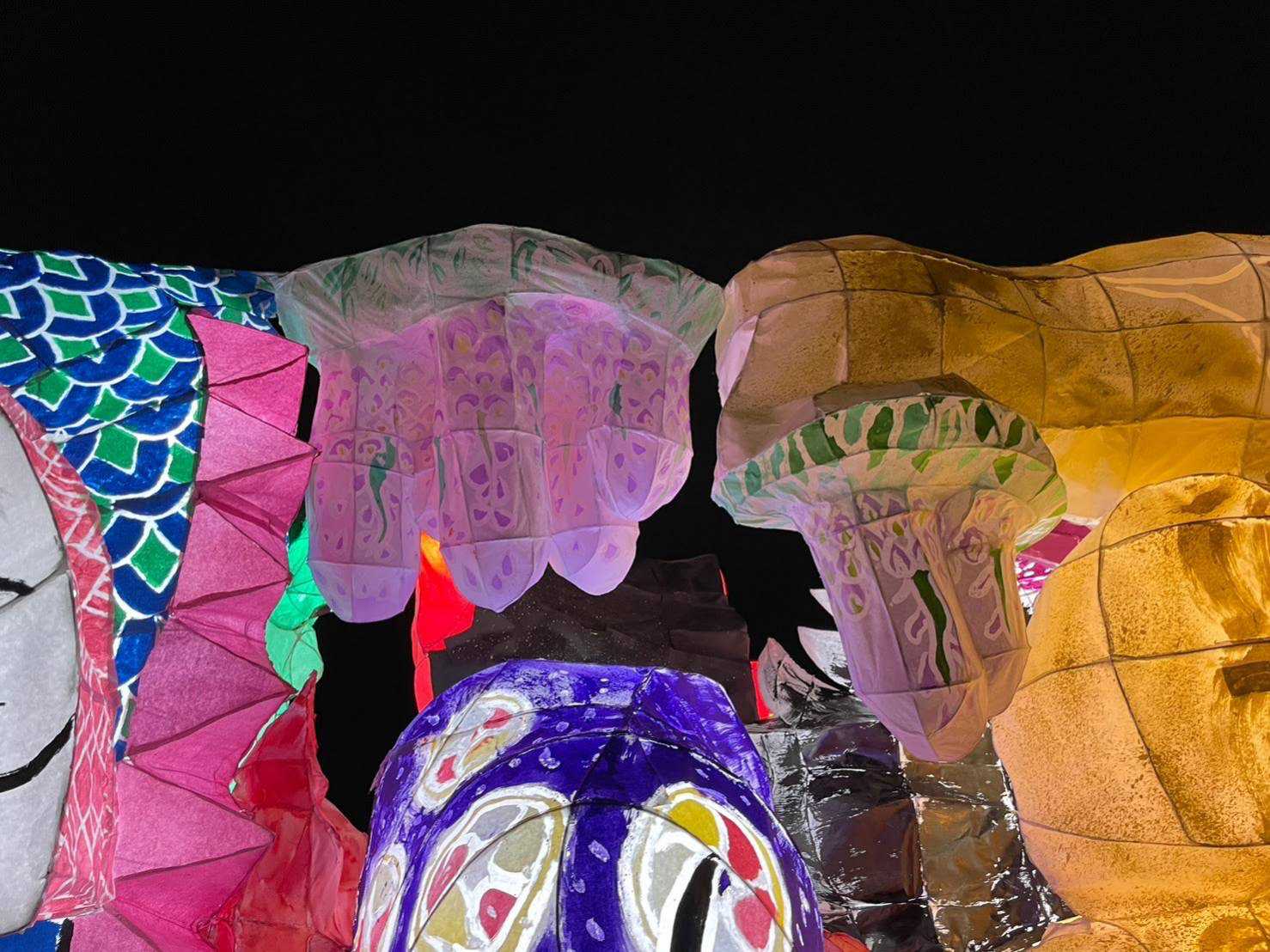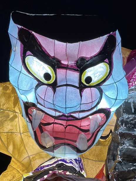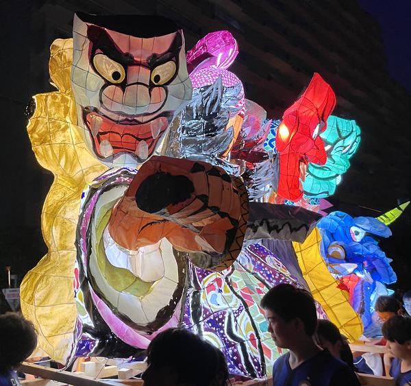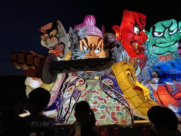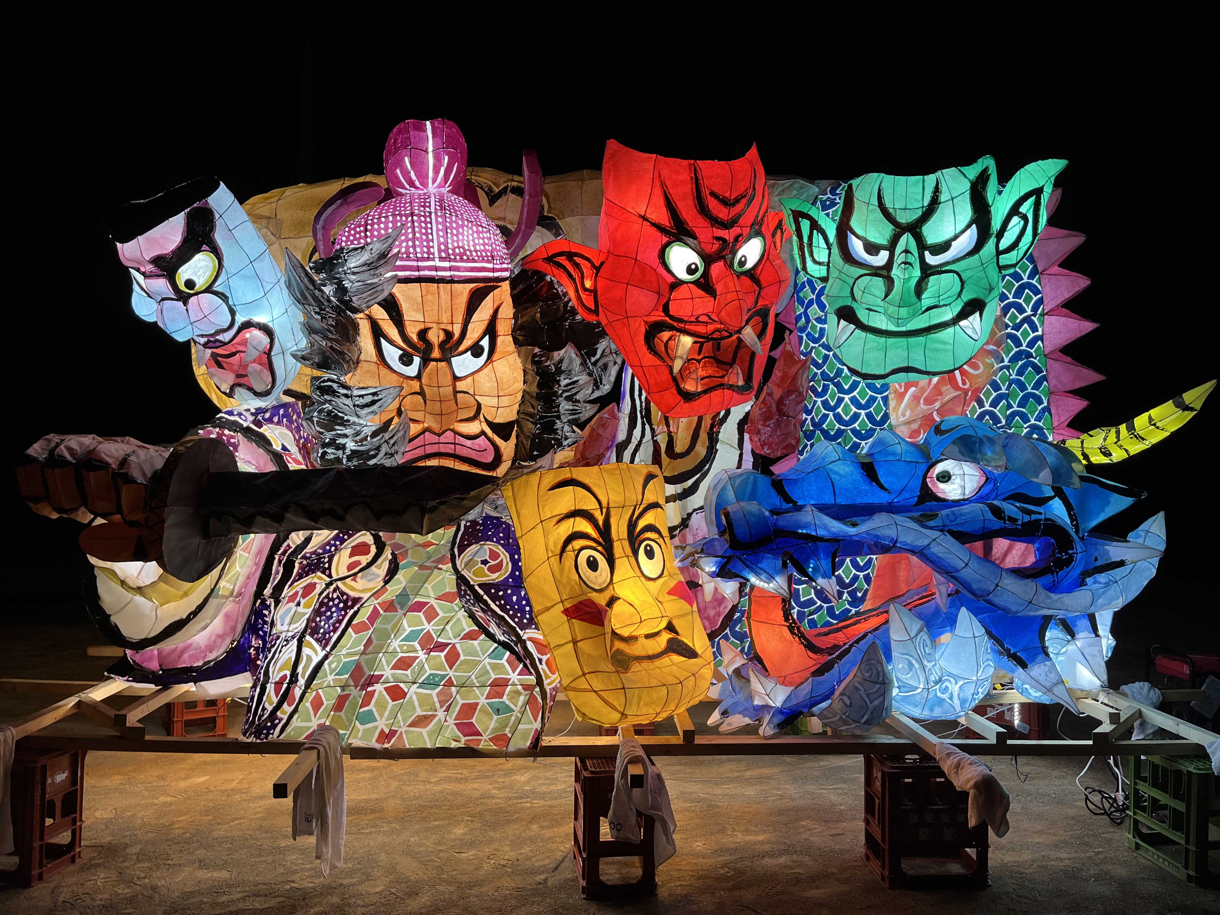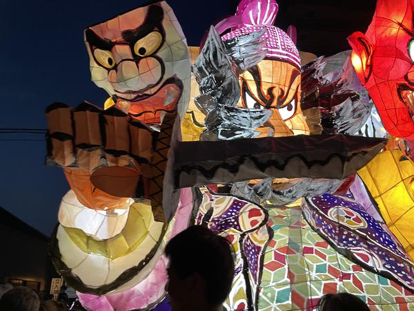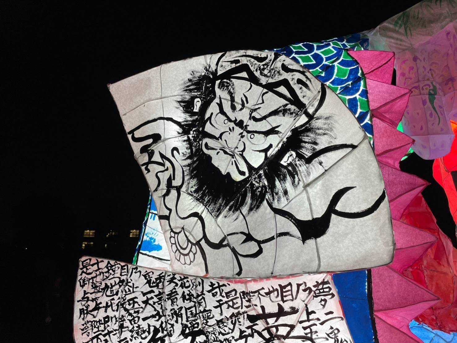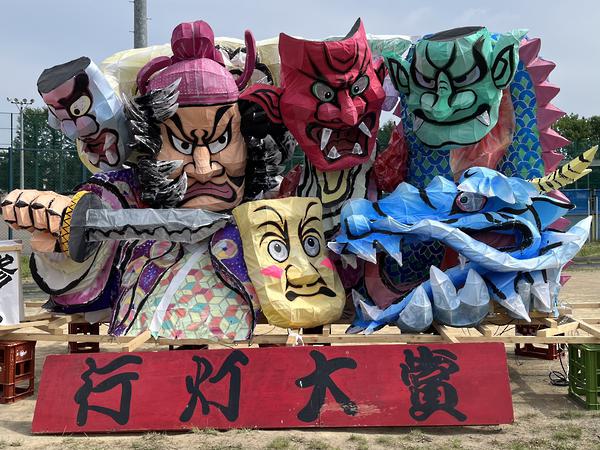 色鮮やかで、5つもある顔もいいし、丁寧に作られているし、一部光らせられなかったところがあるとはいえ納得の大賞だったと思います。 また、実物を見れていないので間違っていたら申し訳ないのですが、前面から見て中央部分が後ろまで空洞になっているんですかね?縦横比がねぶたほどない北高行灯においてこの決断は難しかったんじゃないかと思いますが、これのおかげで中央にある赤い面により立体感を持たせることができているんじゃないかと思います (写真でしか見れていないのでおそらく)。空けすぎるとスカスカになってしまうというリスクがありますがこの行灯はちょうどいいバランスになっていました。表面積も増えるし針金を作り込んだり紙を貼りにくいところも増えるしで難易度が高かったんじゃないかと思います。すごい!