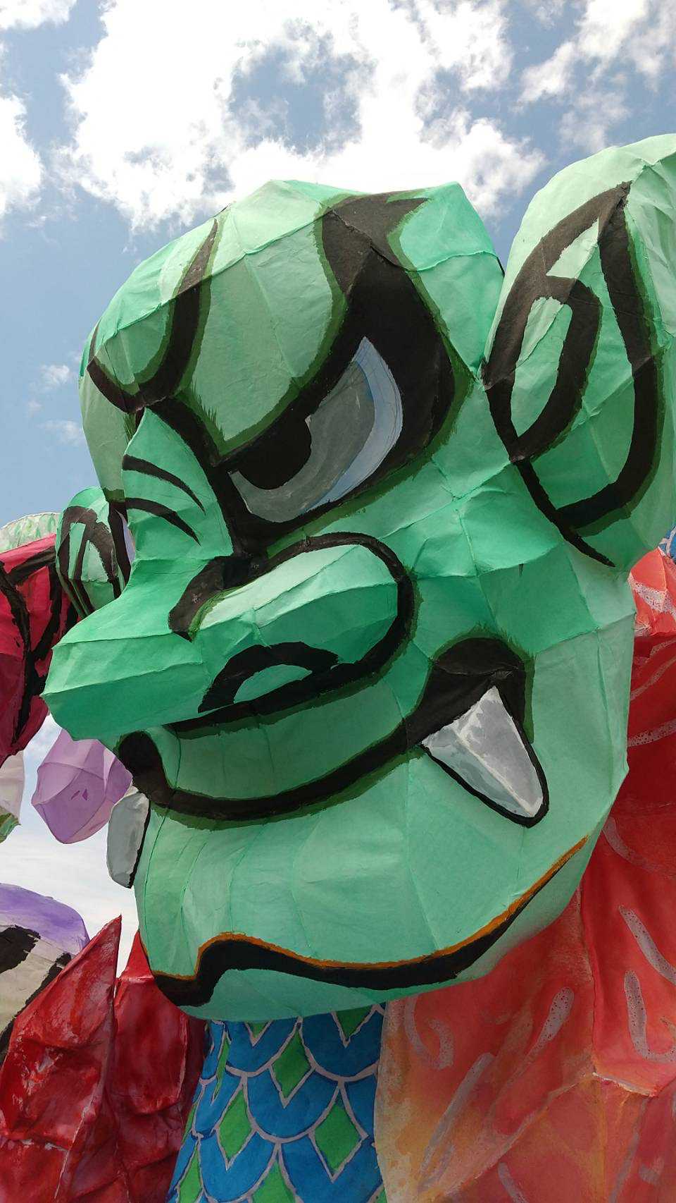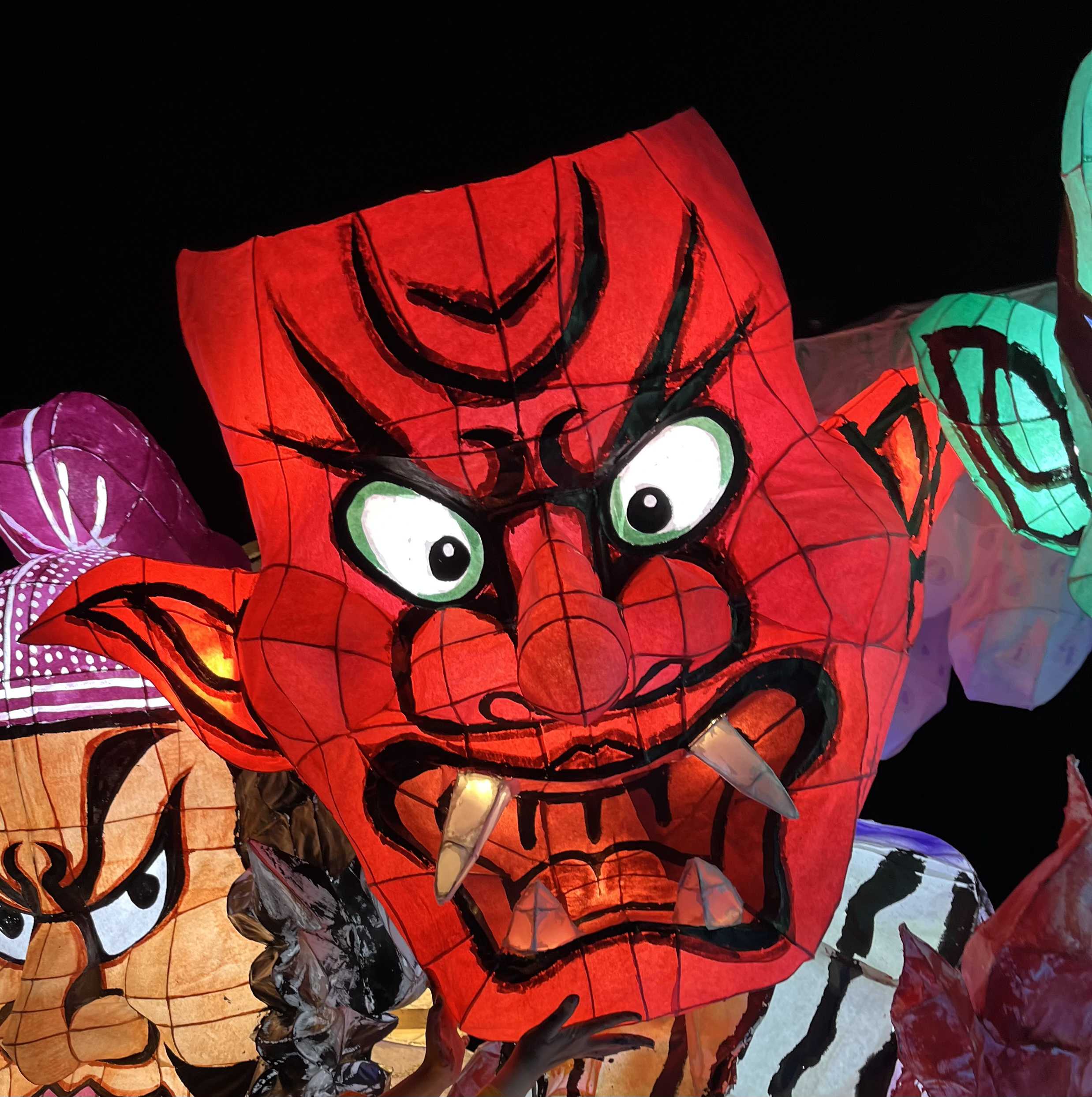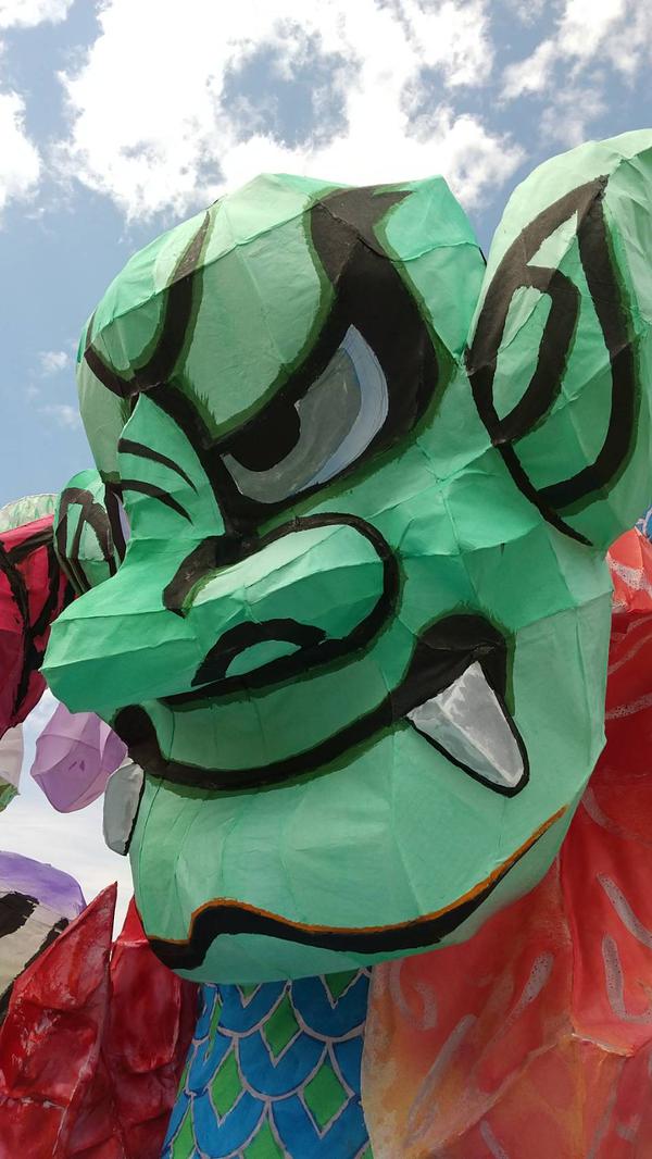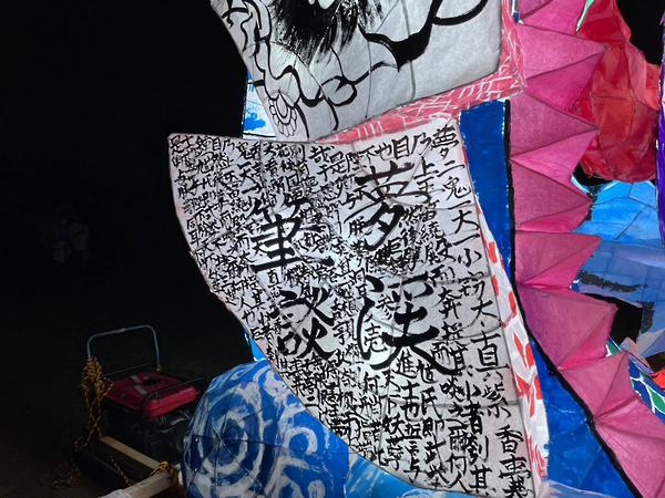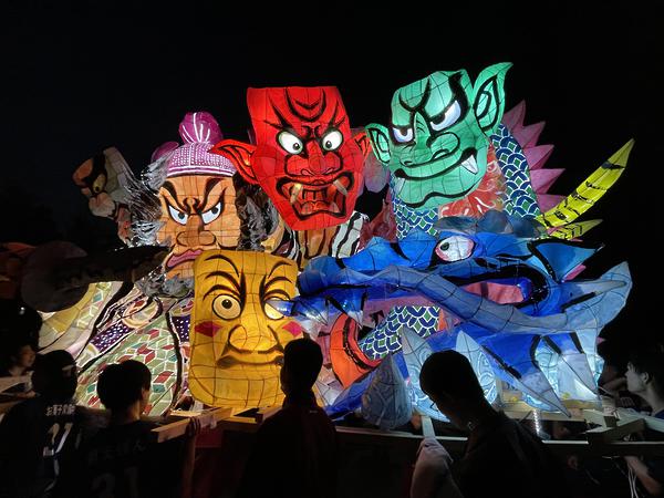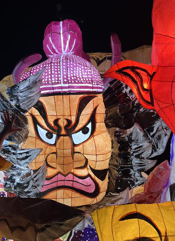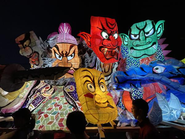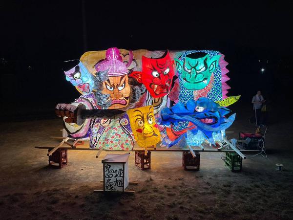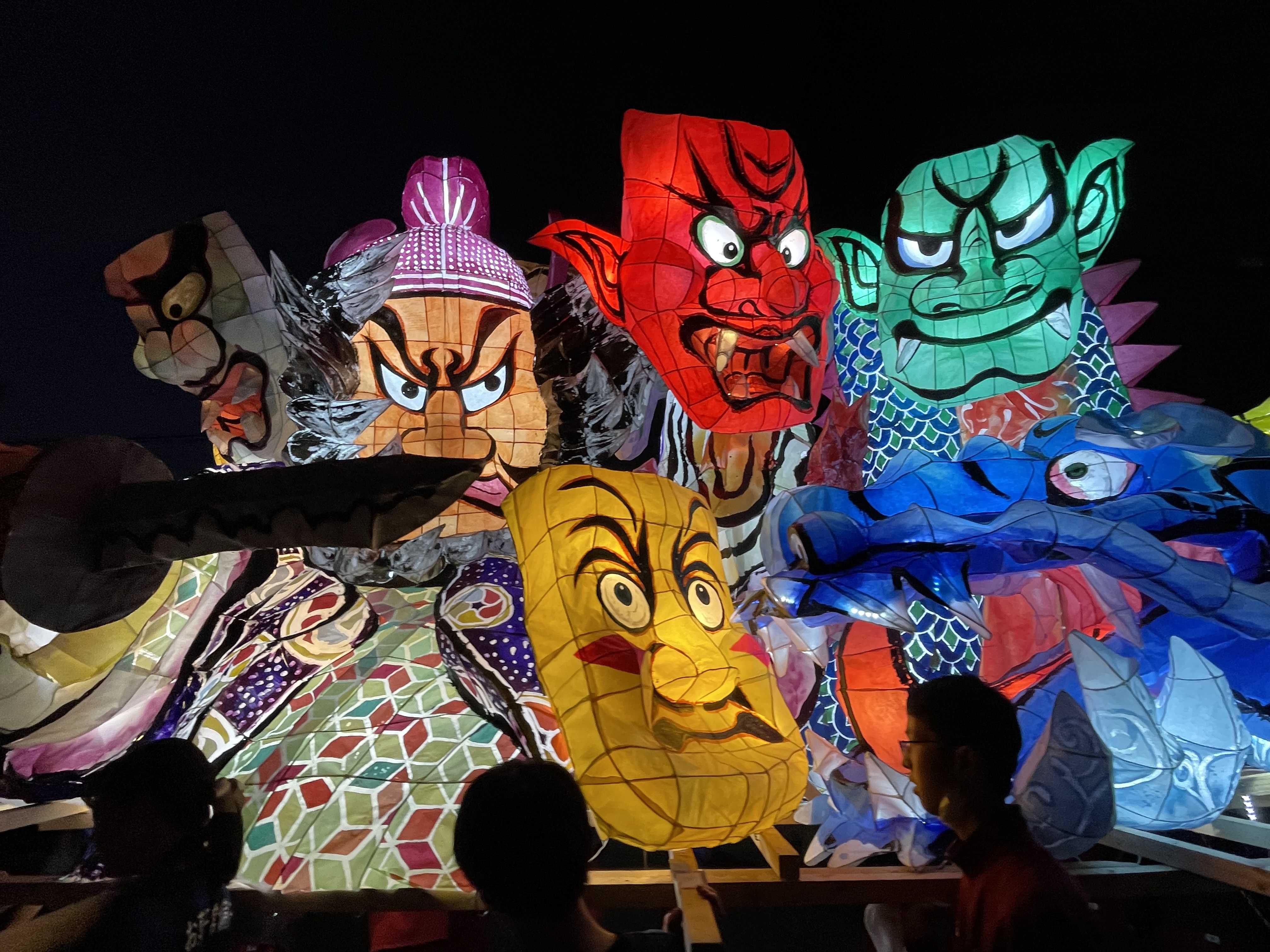 色鮮やかで、5つもある顔もいいし、丁寧に作られているし、一部光らせられなかったところがあるとはいえ納得の大賞だったと思います。 また、実物を見れていないので間違っていたら申し訳ないのですが、前面から見て中央部分が後ろまで空洞になっているんですかね?縦横比がねぶたほどない北高行灯においてこの決断は難しかったんじゃないかと思いますが、これのおかげで中央にある赤い面により立体感を持たせることができているんじゃないかと思います (写真でしか見れていないのでおそらく)。空けすぎるとスカスカになってしまうというリスクがありますがこの行灯はちょうどいいバランスになっていました。表面積も増えるし針金を作り込んだり紙を貼りにくいところも増えるしで難易度が高かったんじゃないかと思います。すごい!
