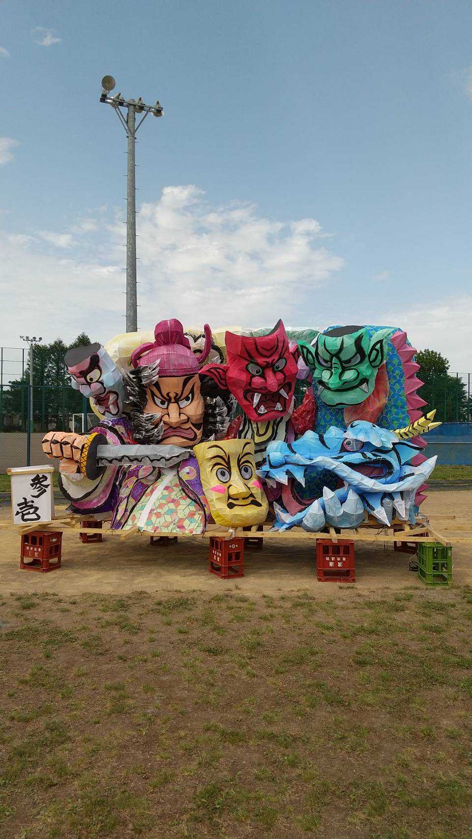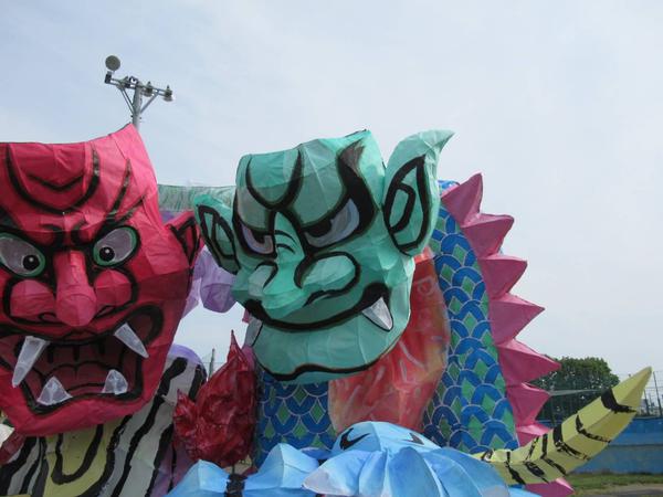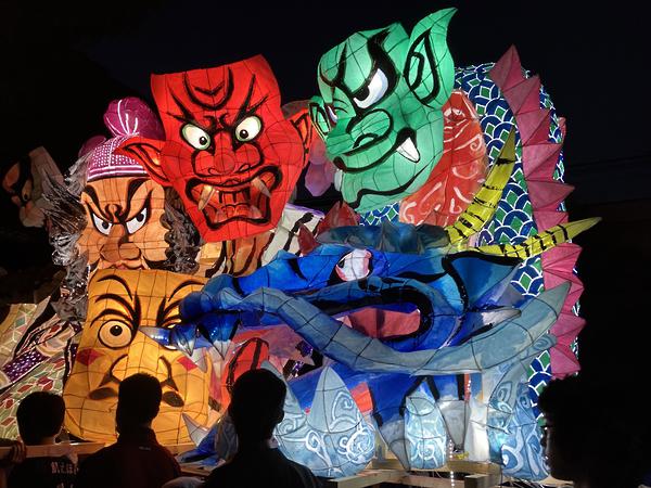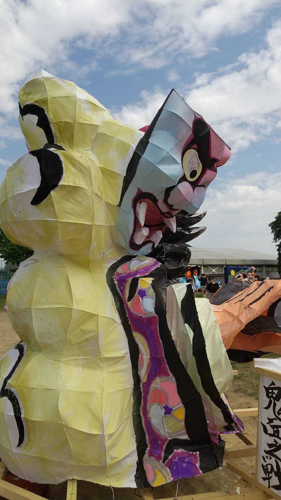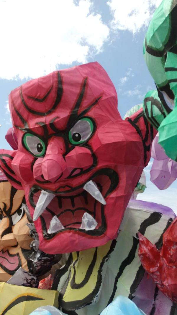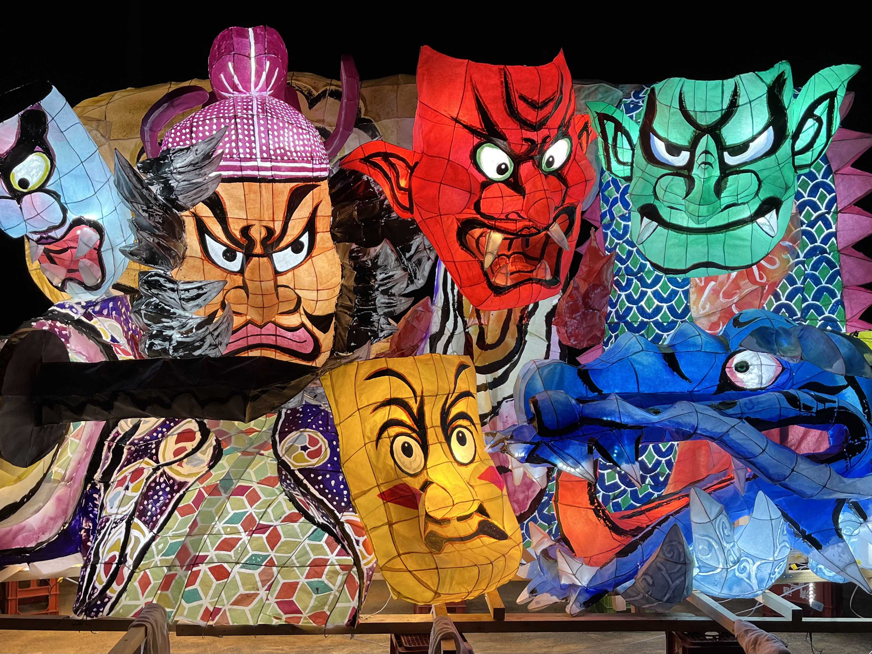 色鮮やかで、5つもある顔もいいし、丁寧に作られているし、一部光らせられなかったところがあるとはいえ納得の大賞だったと思います。 また、実物を見れていないので間違っていたら申し訳ないのですが、前面から見て中央部分が後ろまで空洞になっているんですかね?縦横比がねぶたほどない北高行灯においてこの決断は難しかったんじゃないかと思いますが、これのおかげで中央にある赤い面により立体感を持たせることができているんじゃないかと思います (写真でしか見れていないのでおそらく)。空けすぎるとスカスカになってしまうというリスクがありますがこの行灯はちょうどいいバランスになっていました。表面積も増えるし針金を作り込んだり紙を貼りにくいところも増えるしで難易度が高かったんじゃないかと思います。すごい!