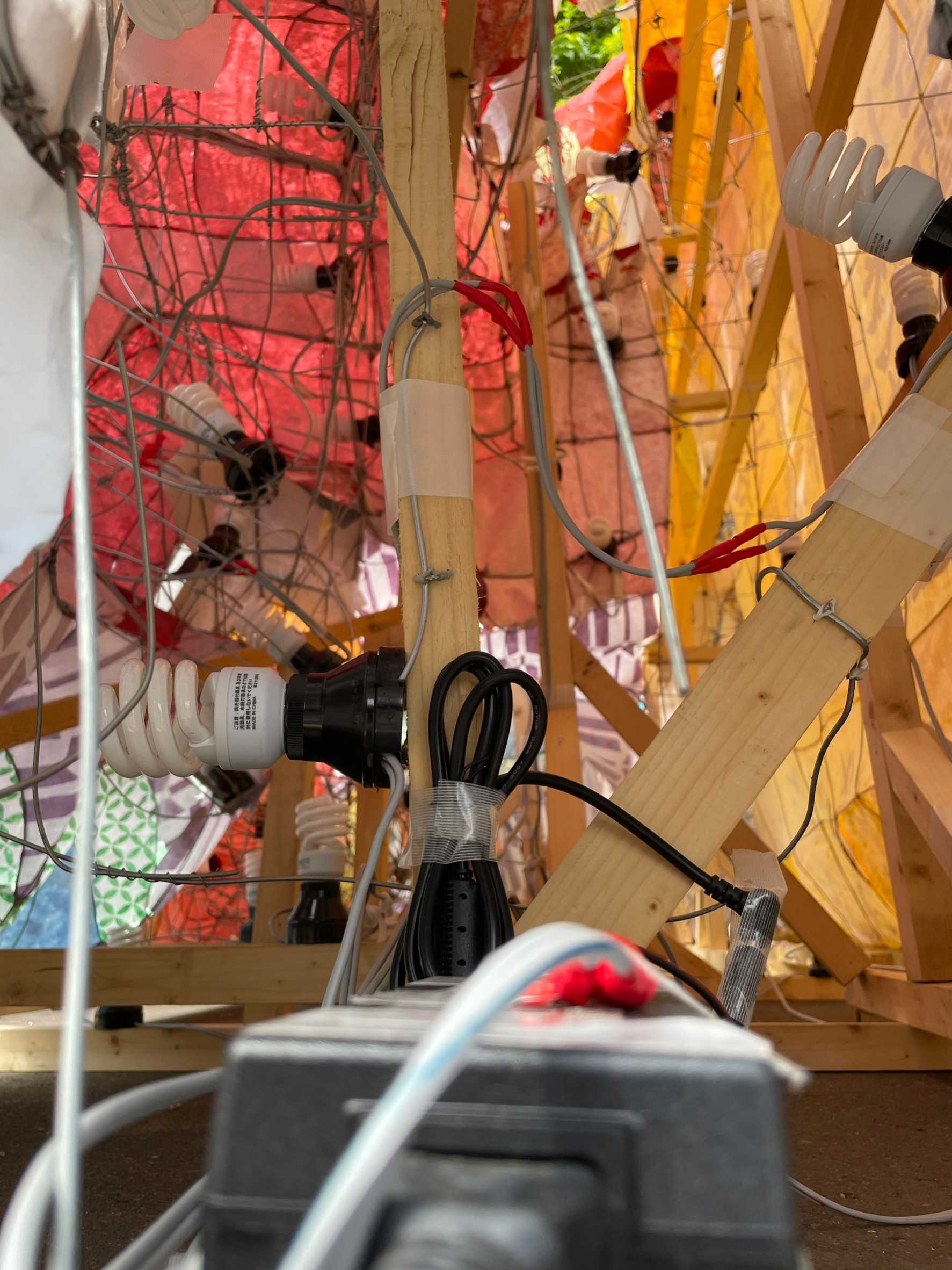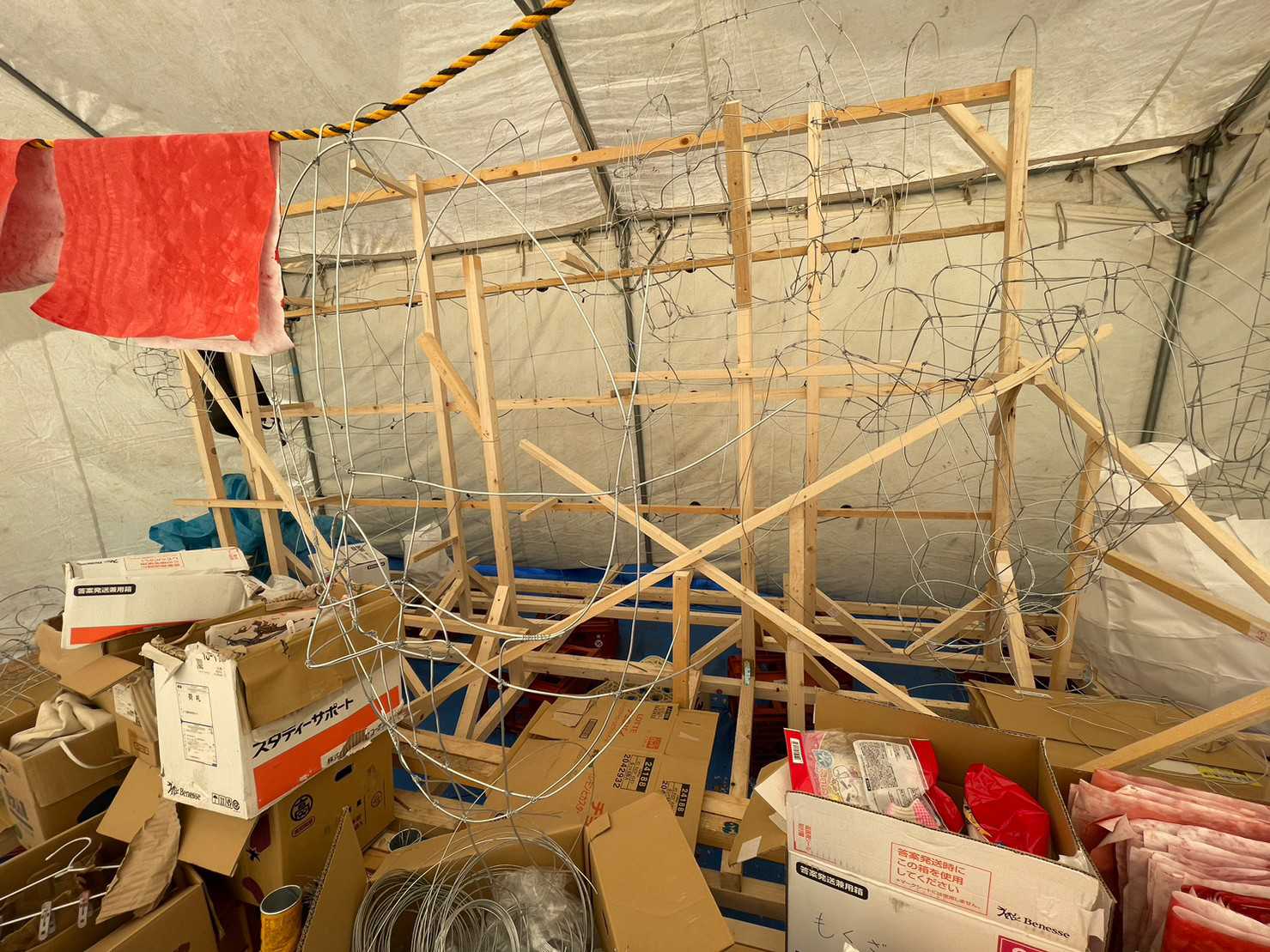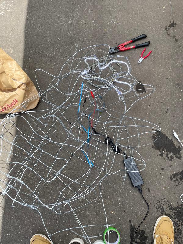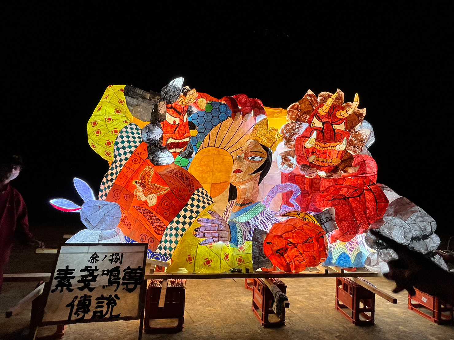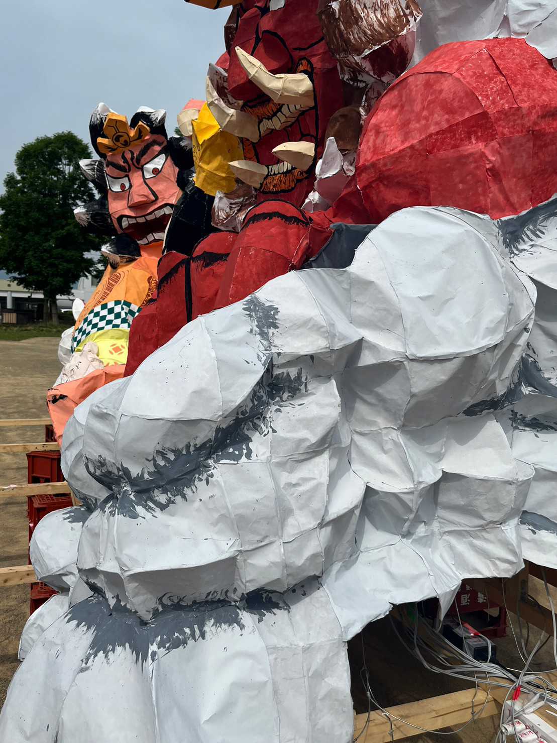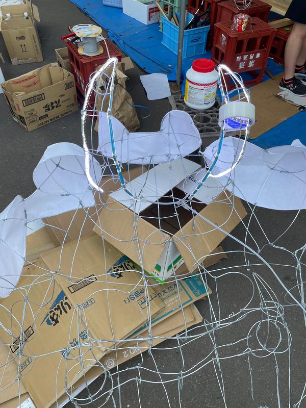 - 制作中の写真を拝見しましたが、鬼 (雷神?) の角と人間 (素戔嗚尊?) の冠に入れているのはLEDテープですよね。まったく違和感なく光っているように見えるので素晴らしいです。