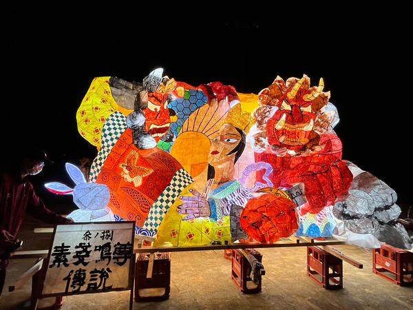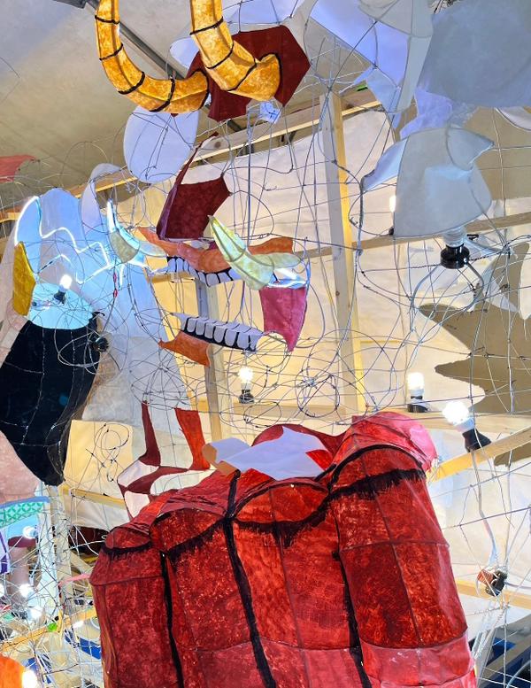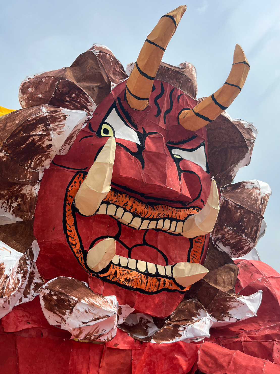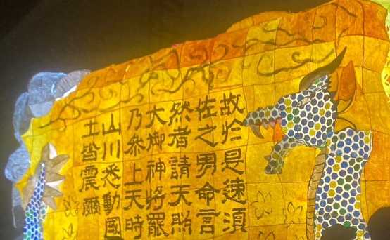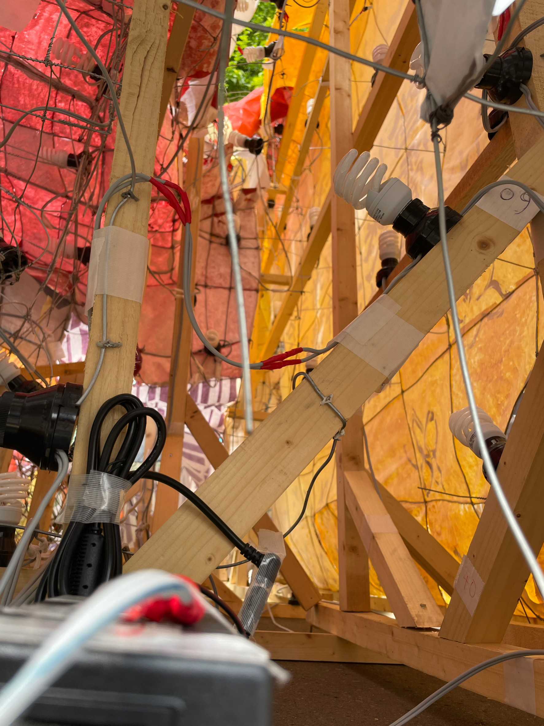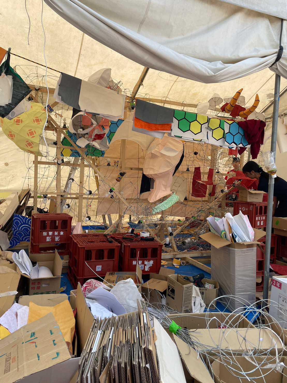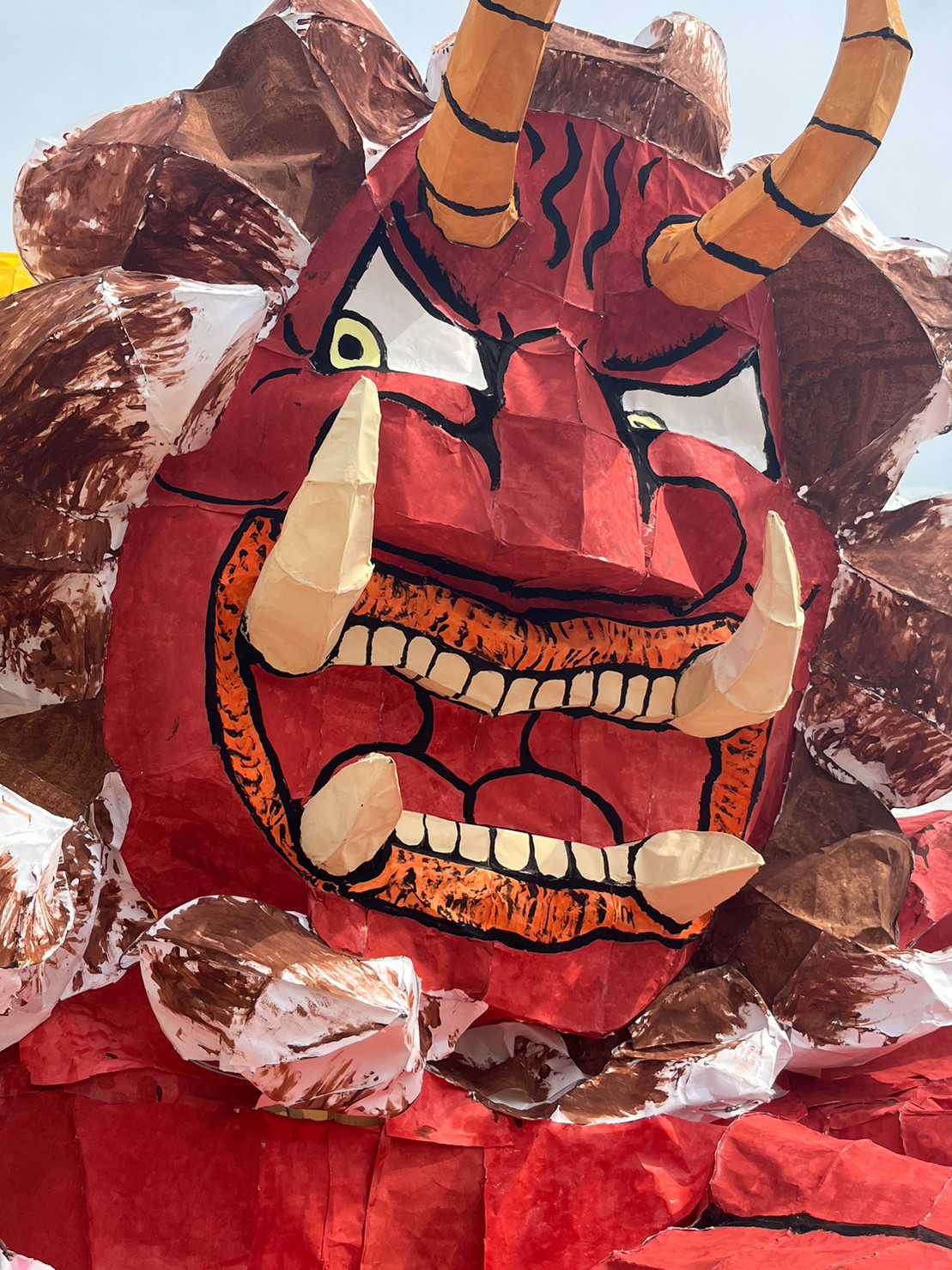 - 制作中の写真を拝見しましたが、鬼 (雷神?) の角と人間 (素戔嗚尊?) の冠に入れているのはLEDテープですよね。まったく違和感なく光っているように見えるので素晴らしいです。