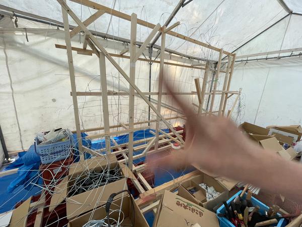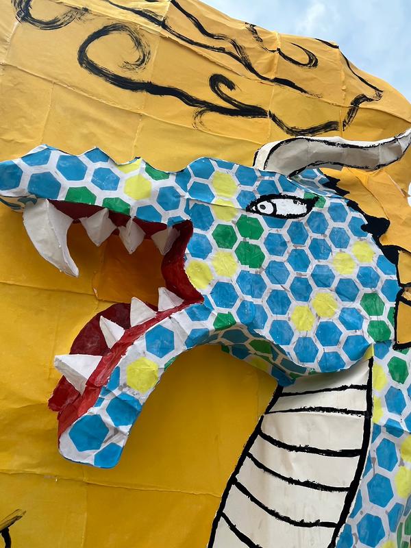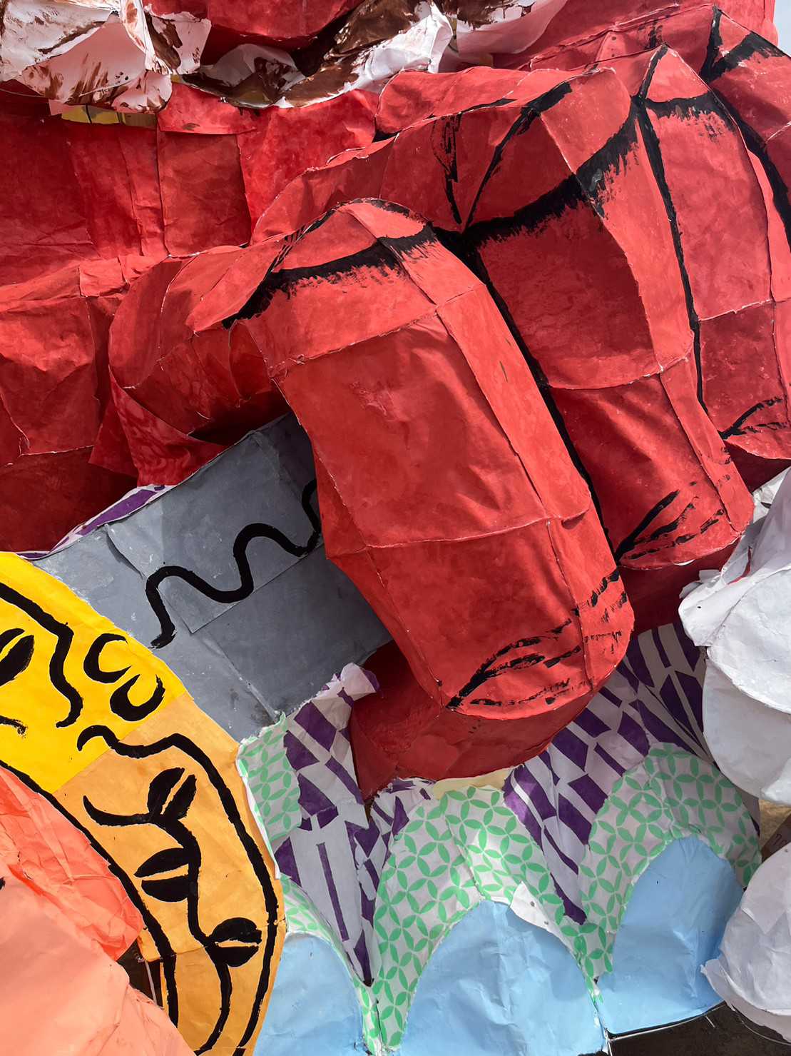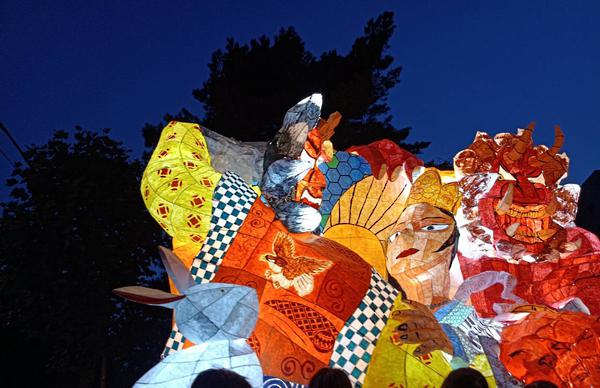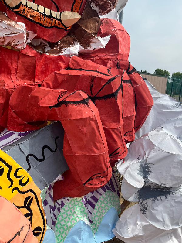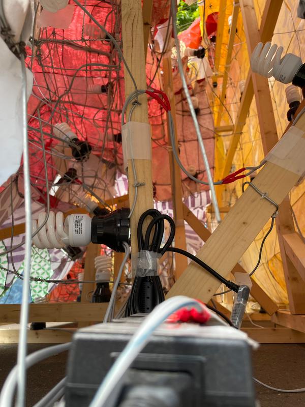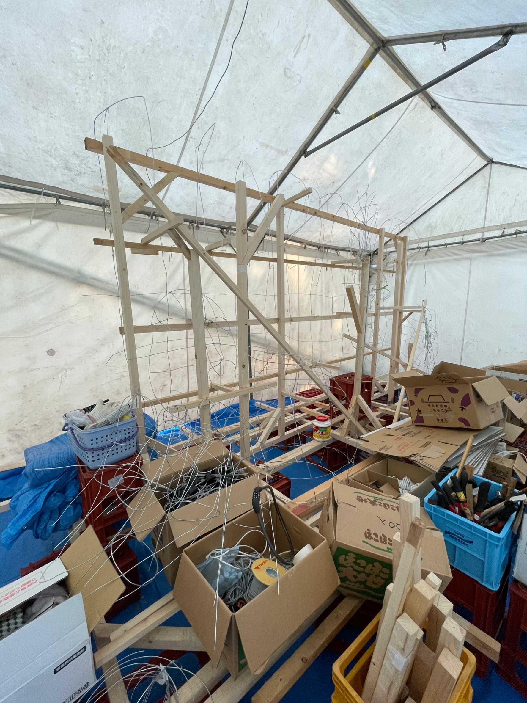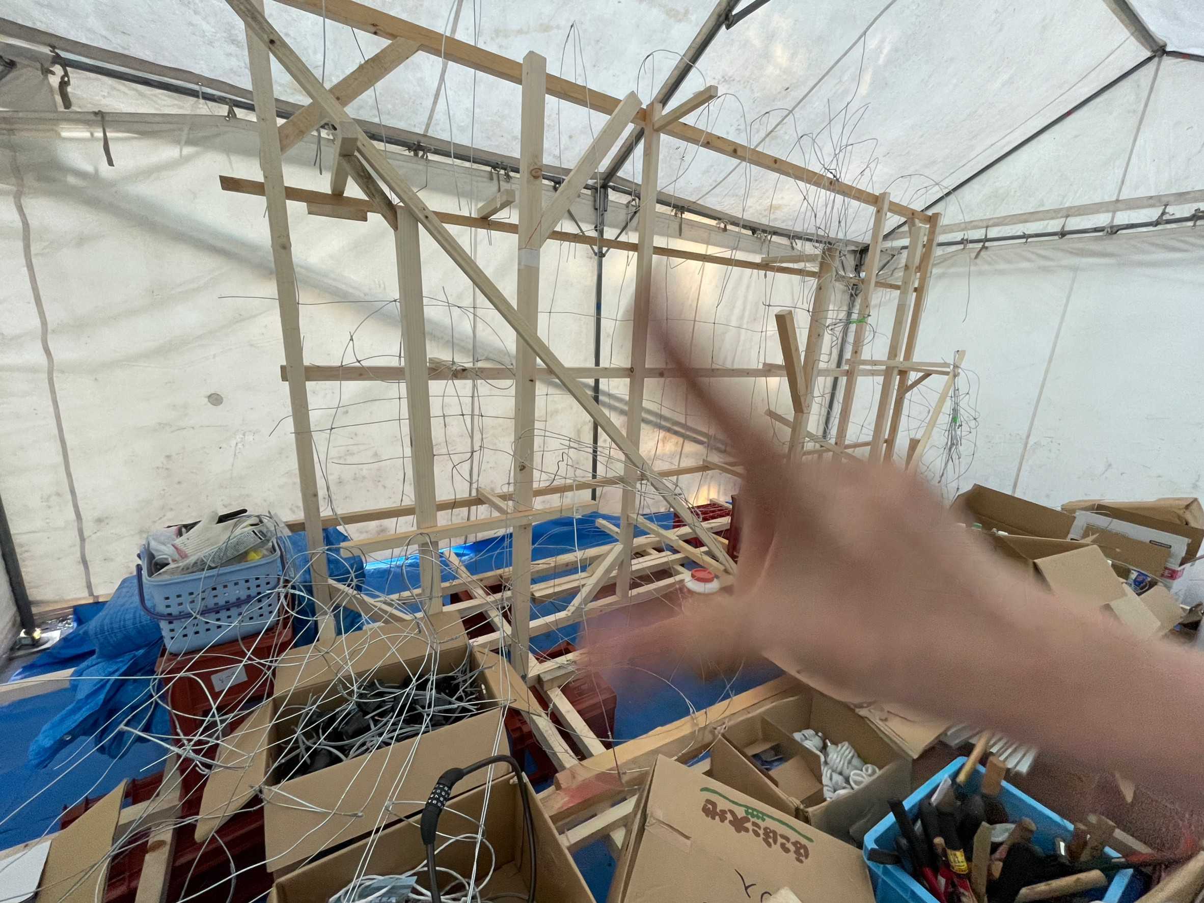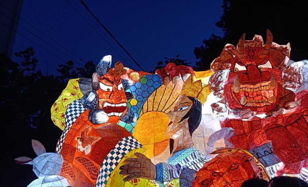 - 制作中の写真を拝見しましたが、鬼 (雷神?) の角と人間 (素戔嗚尊?) の冠に入れているのはLEDテープですよね。まったく違和感なく光っているように見えるので素晴らしいです。