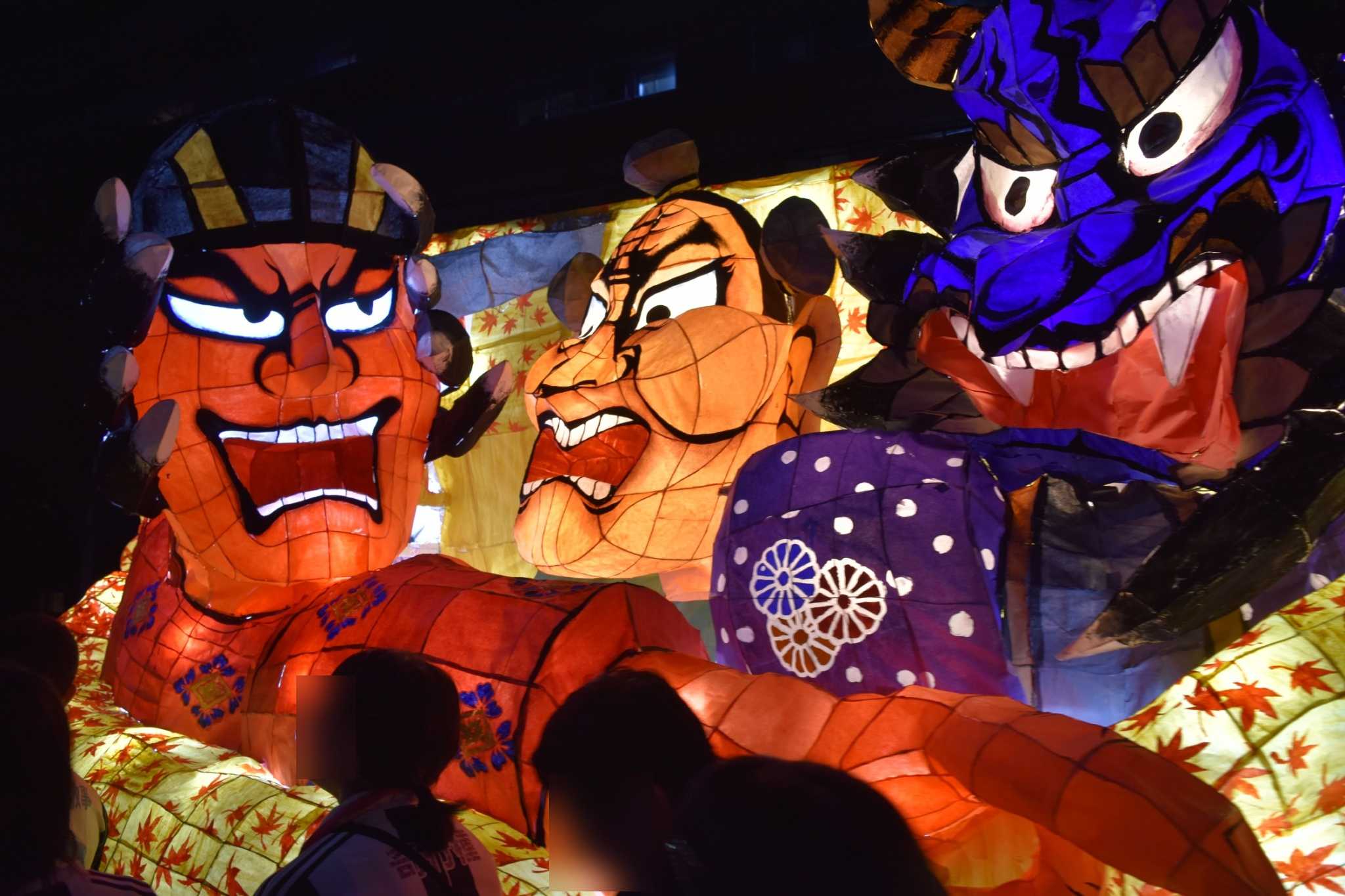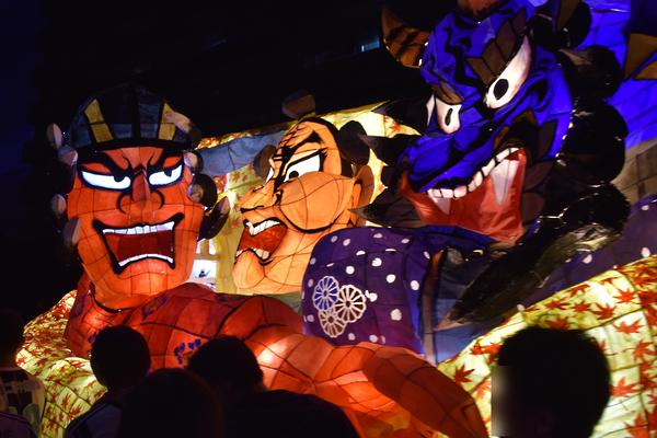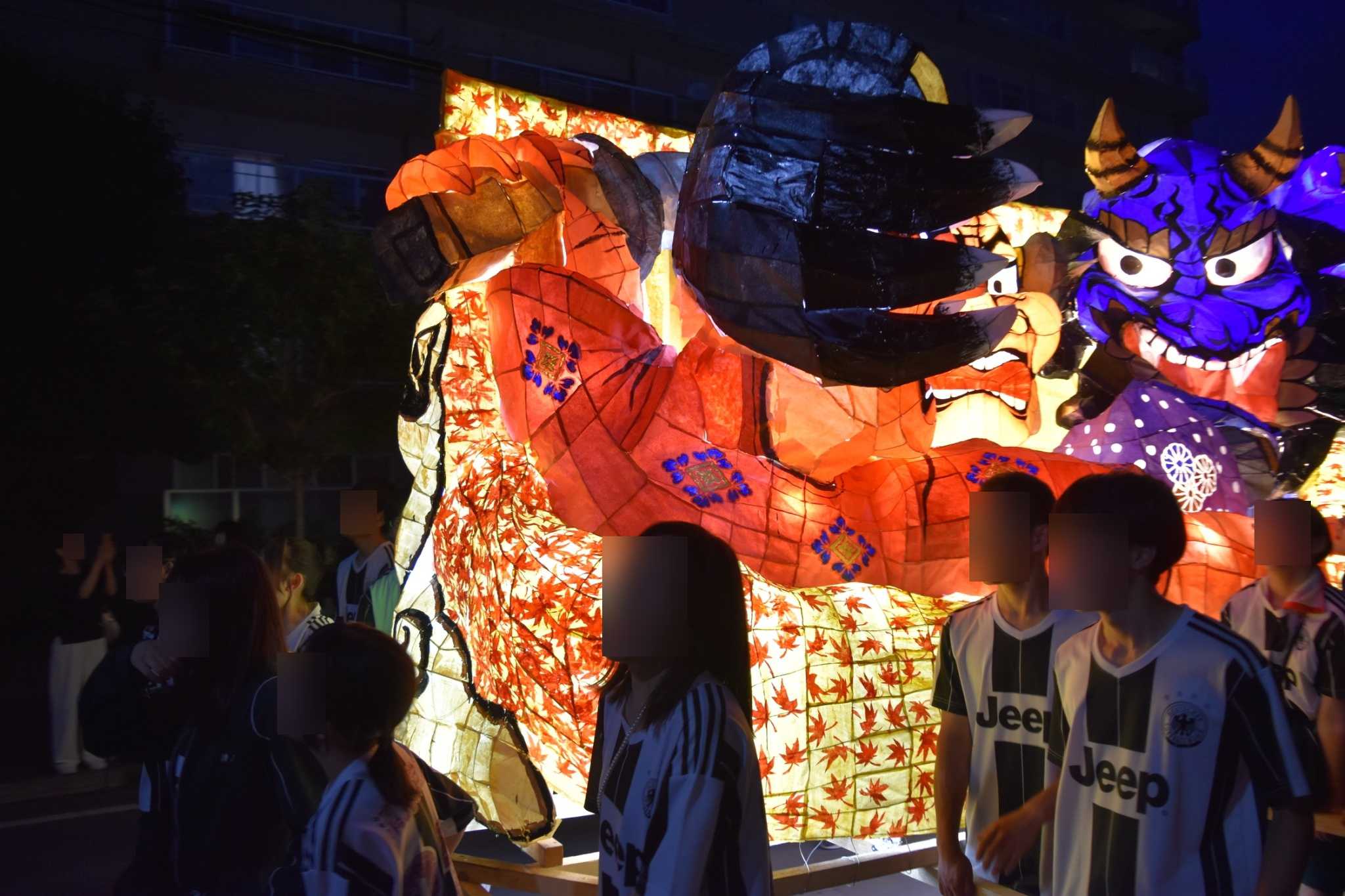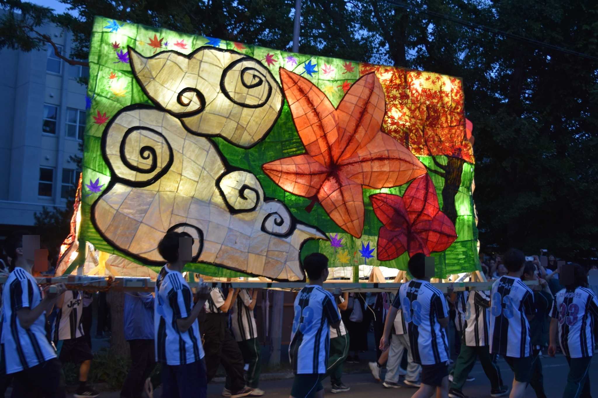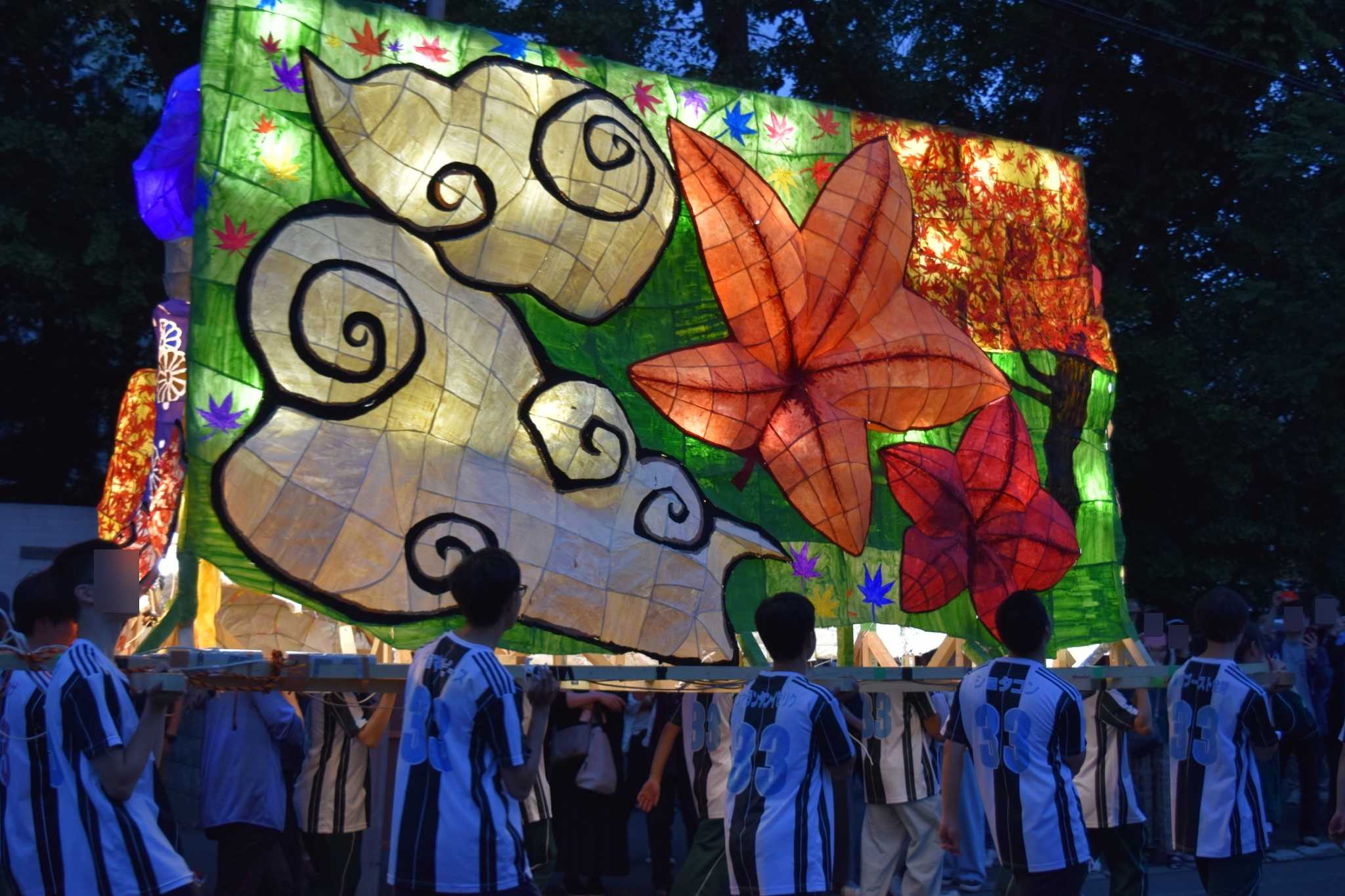 裏の壁も鮮やかですね。単なる壁かと思いきや横を通して前面の紅葉とつながっており、包みこむように作られているところに工夫を感じました。これなら壁のデメリット (行灯本体と分断されること) も抑えられていいなと感心しました。