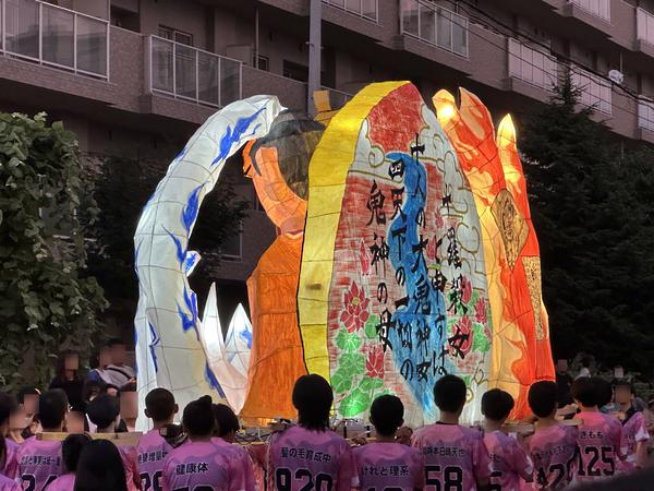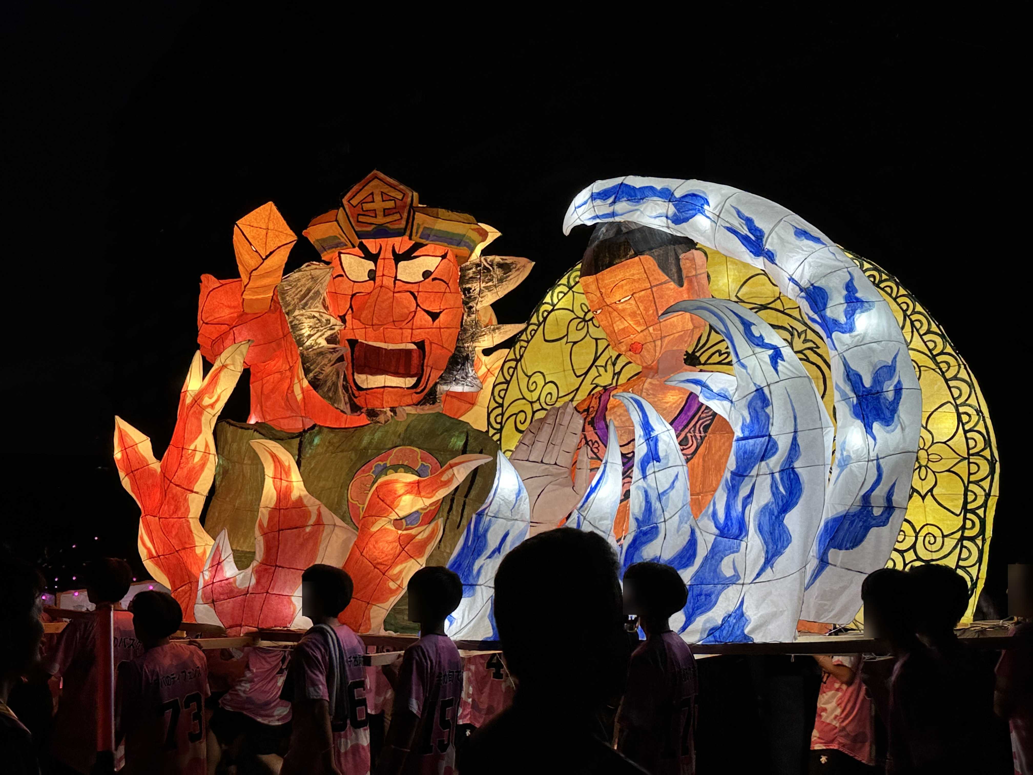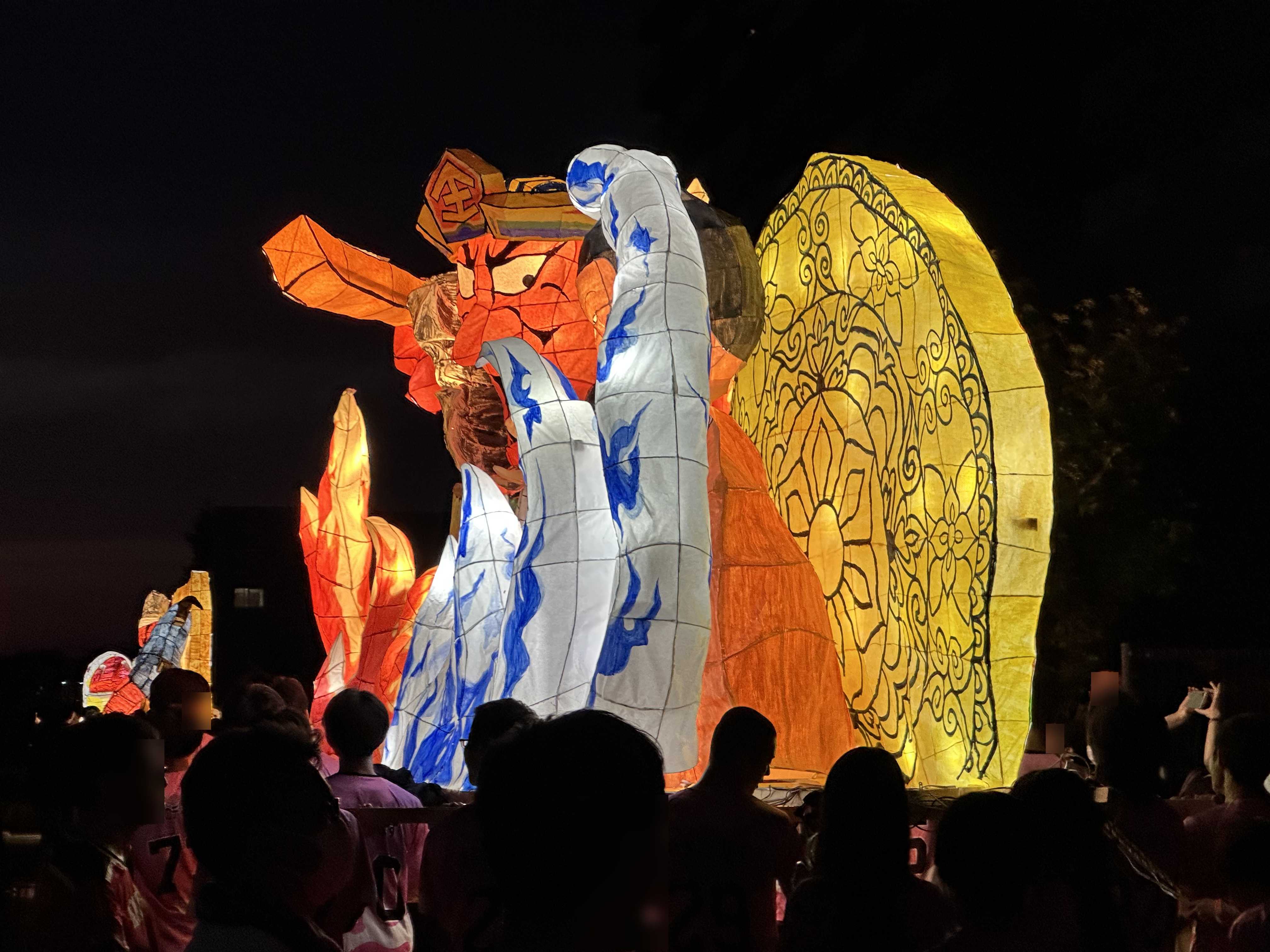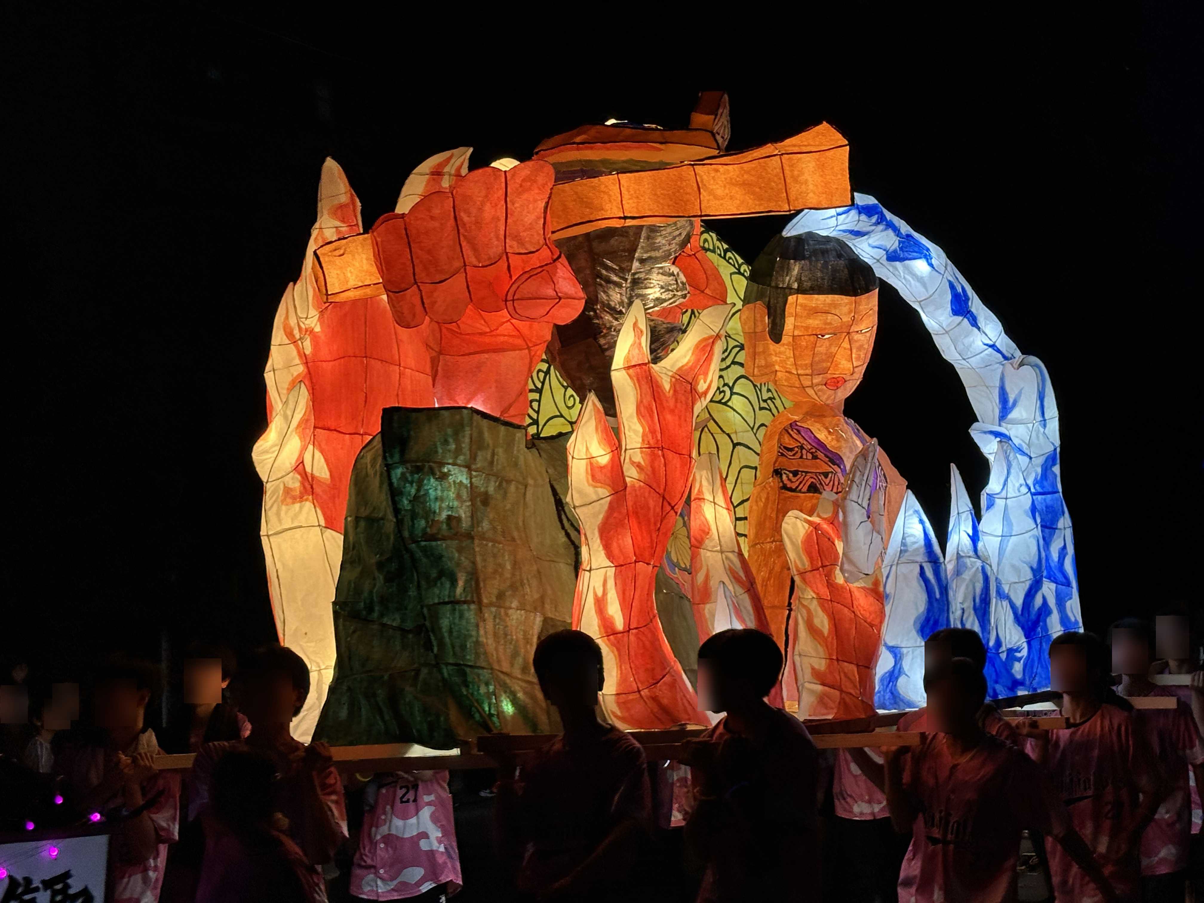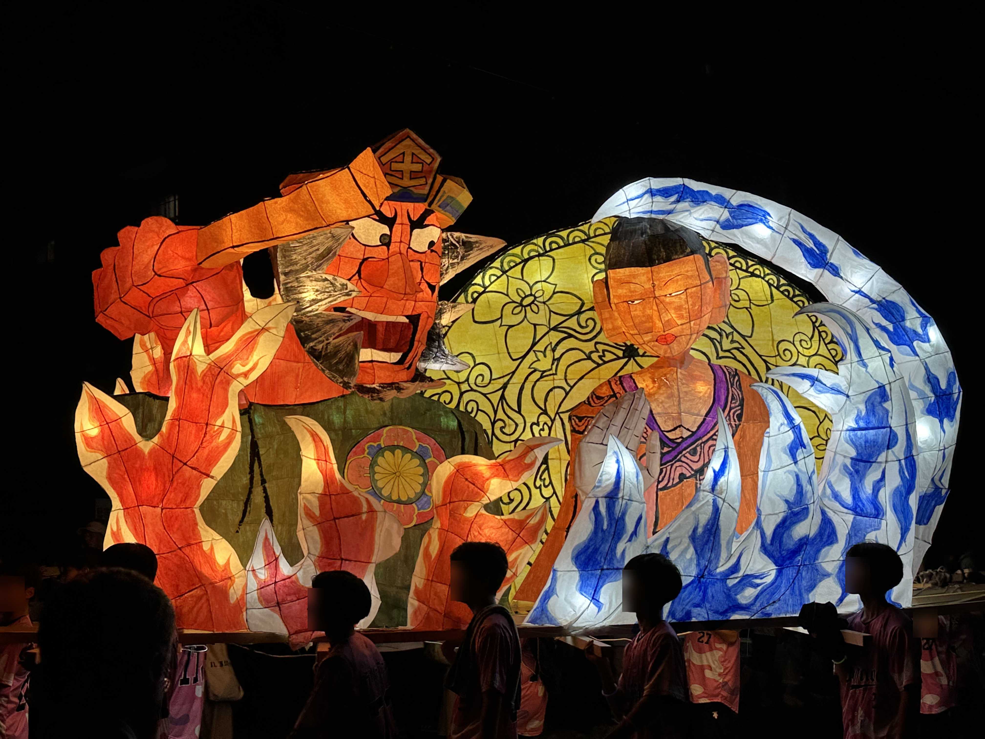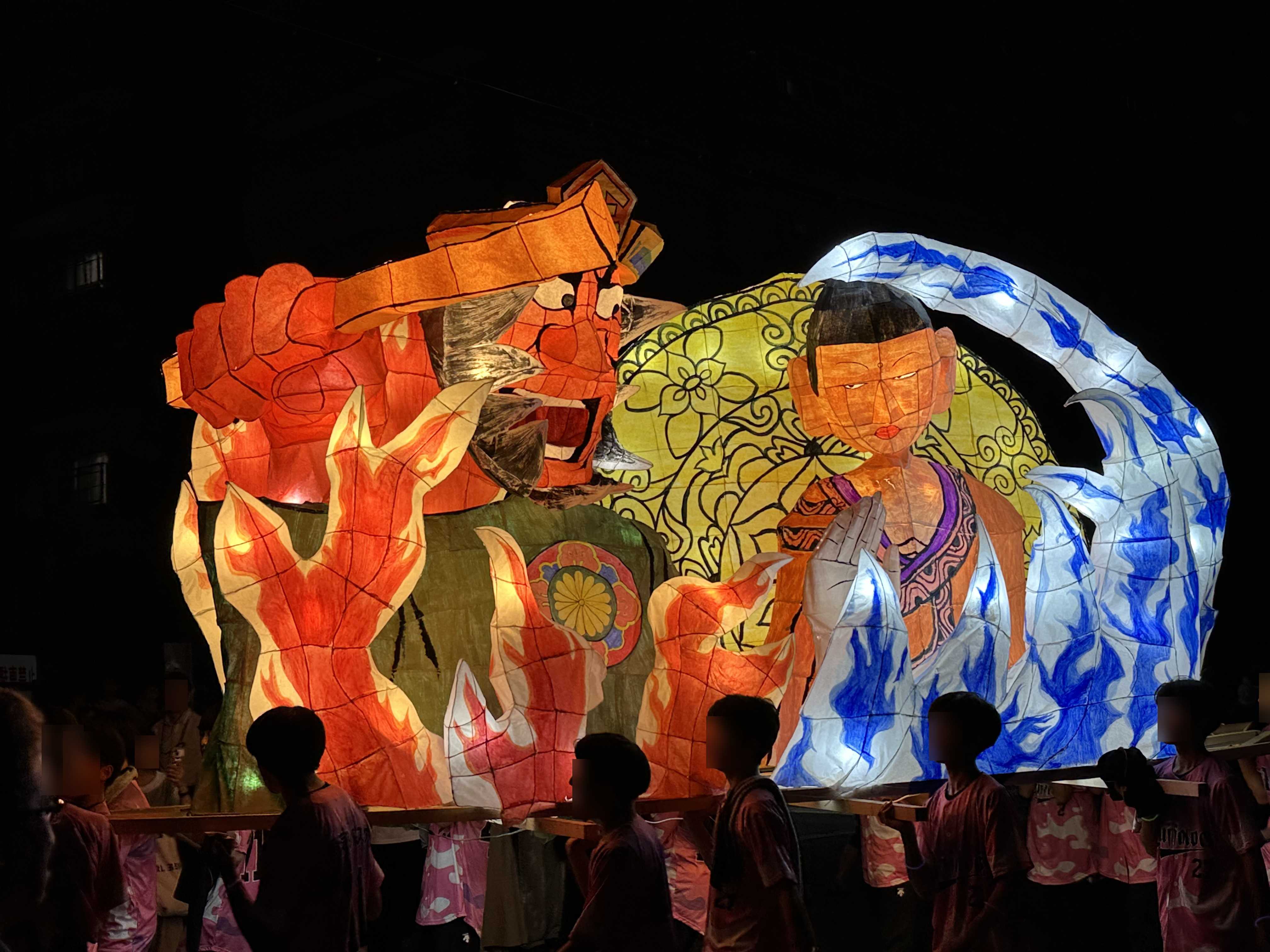閻魔大王と仏の激しさを増す戦い。そんな場面を切り取った行灯は地獄と天国、閻魔大王と仏などの様々な対比を鮮やかな色や構図で表現しています。言葉では言い尽くせない魅力がつまった二年七組力作の行灯をぜひお楽しみください。