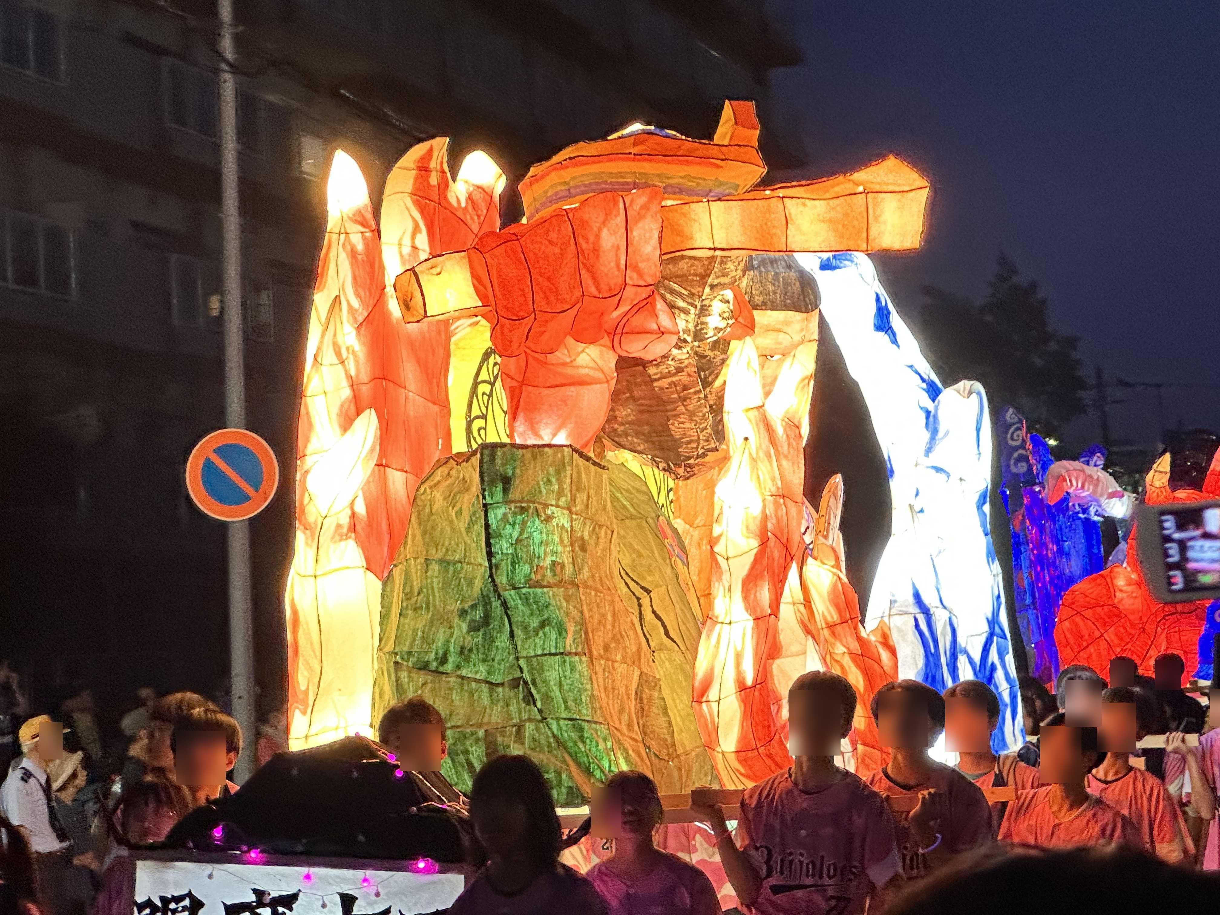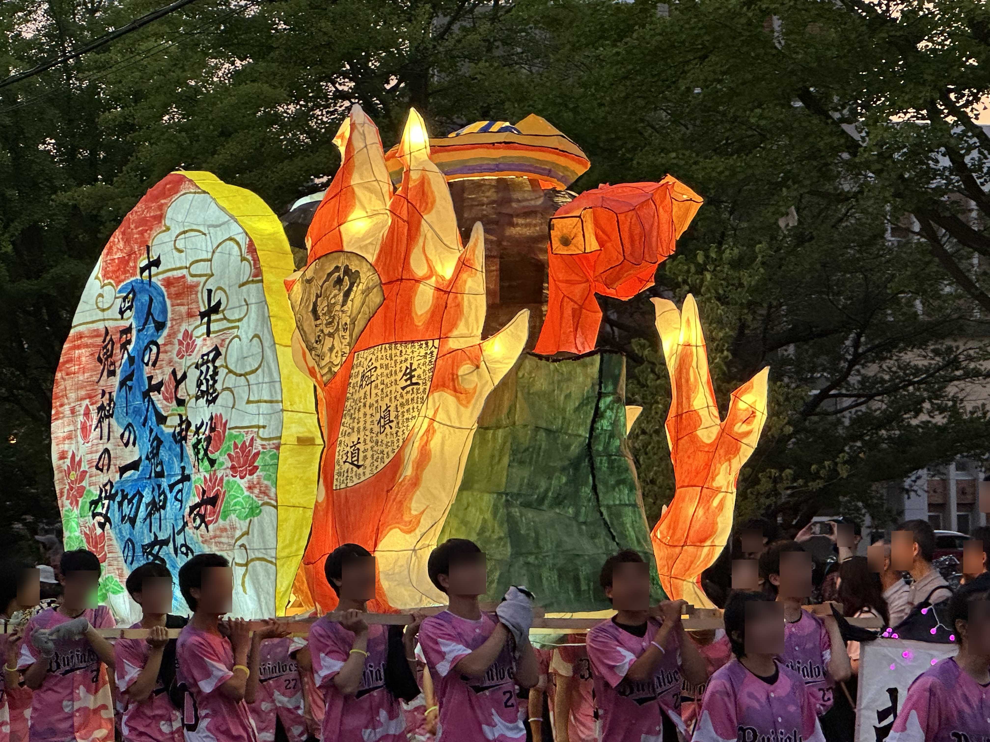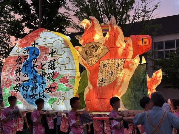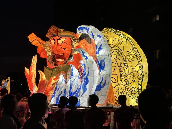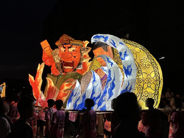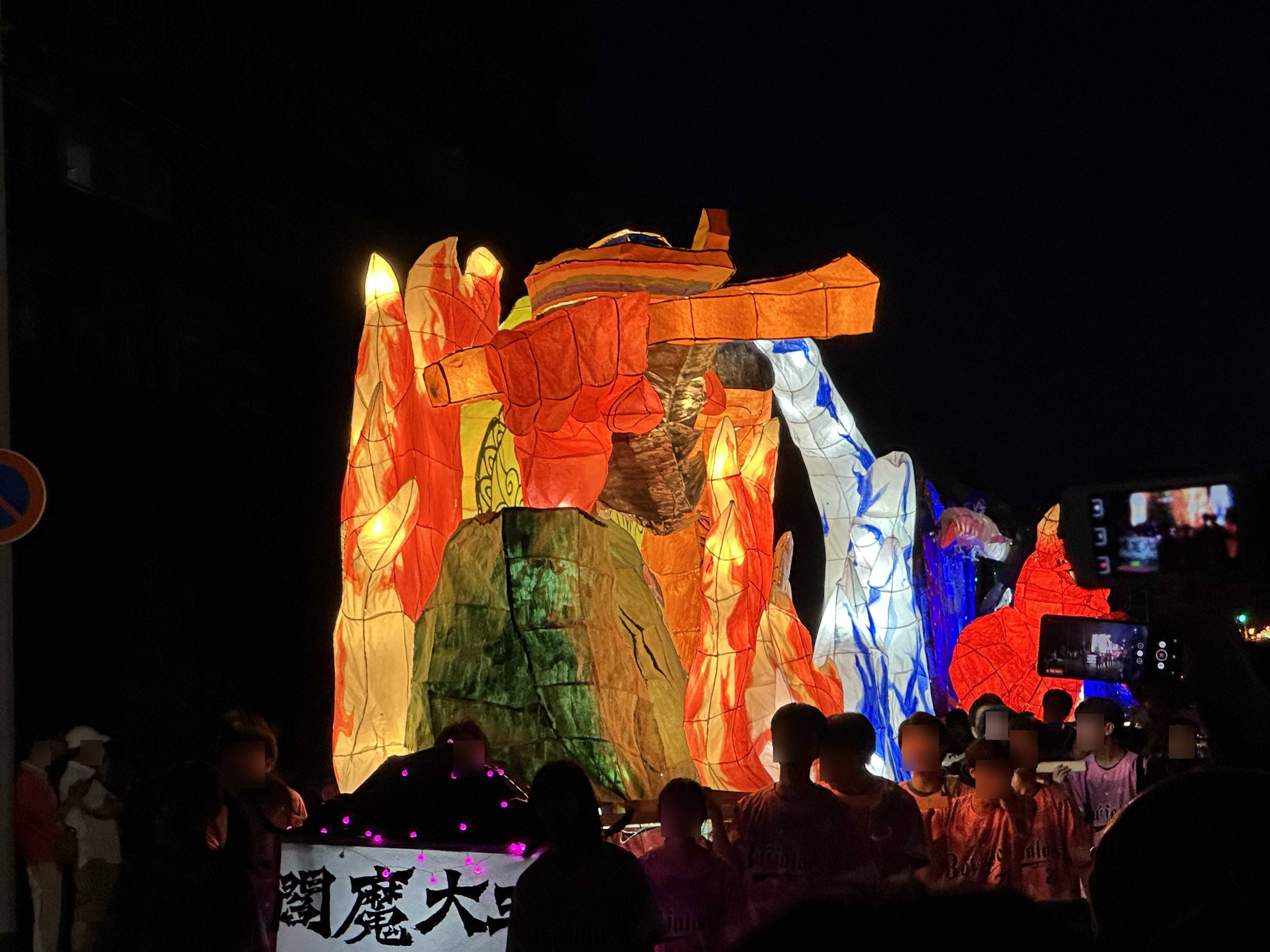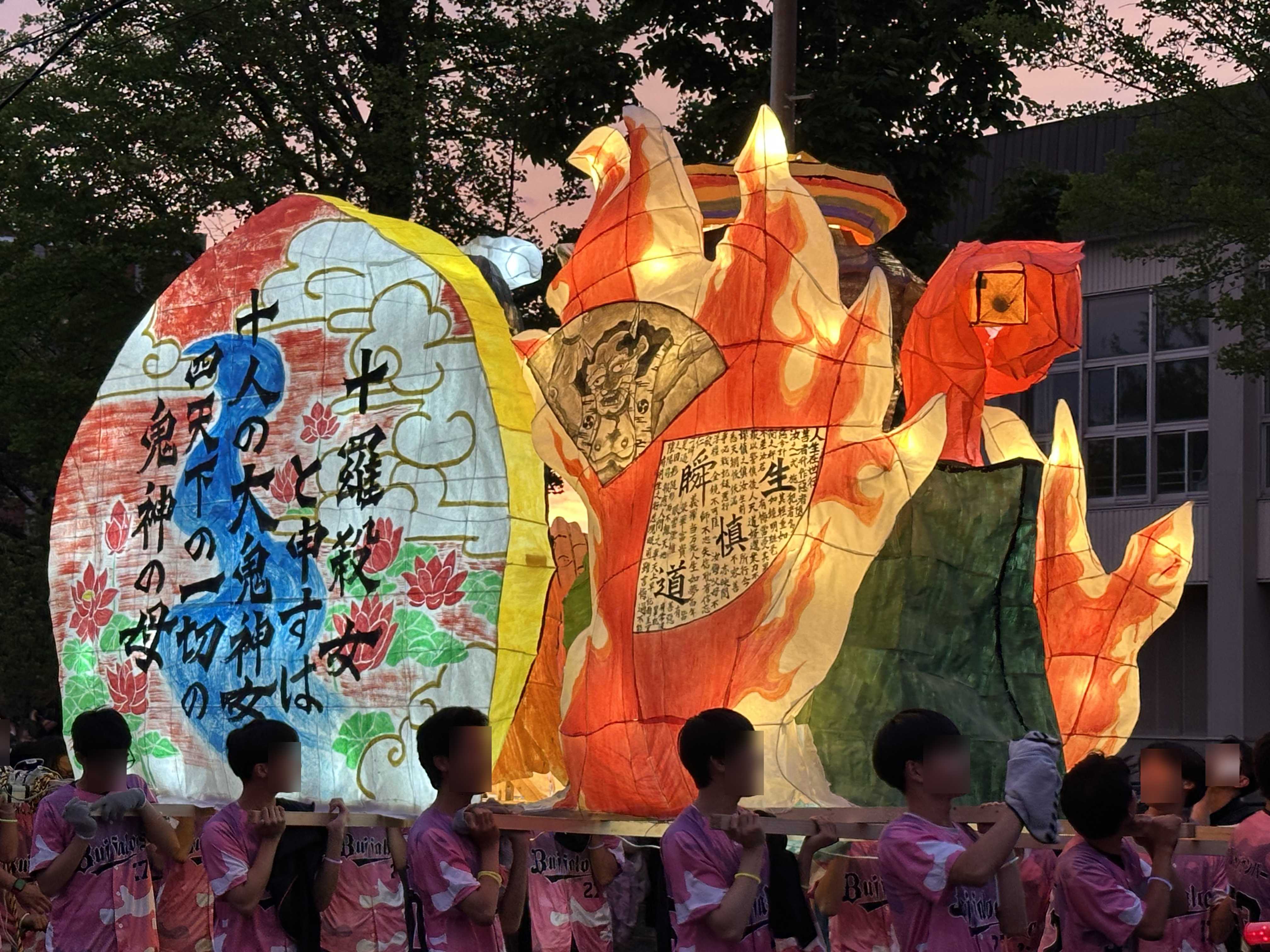 閻魔大王と仏の激しさを増す戦い。そんな場面を切り取った行灯は地獄と天国、閻魔大王と仏などの様々な対比を鮮やかな色や構図で表現しています。言葉では言い尽くせない魅力がつまった二年七組力作の行灯をぜひお楽しみください。