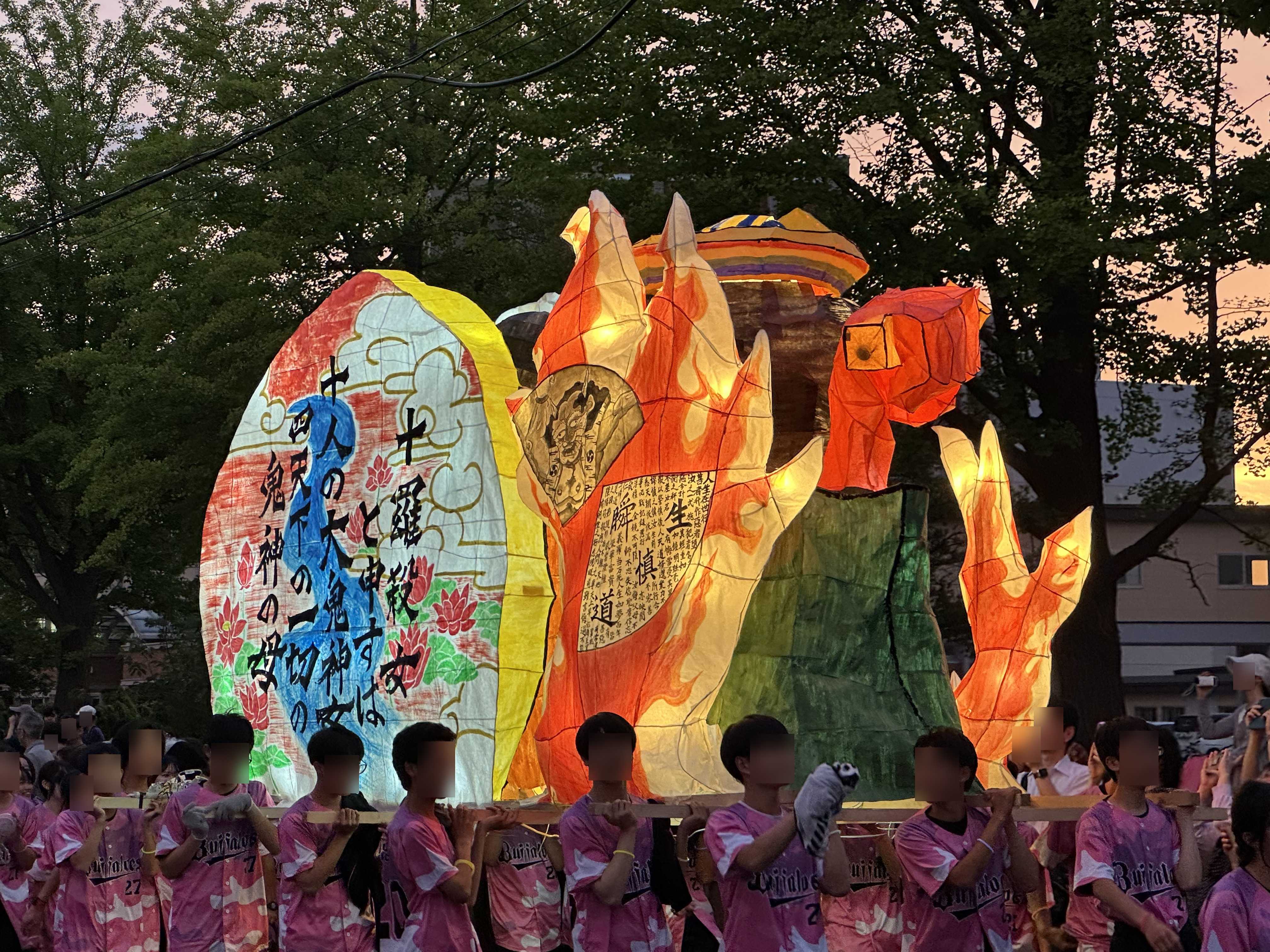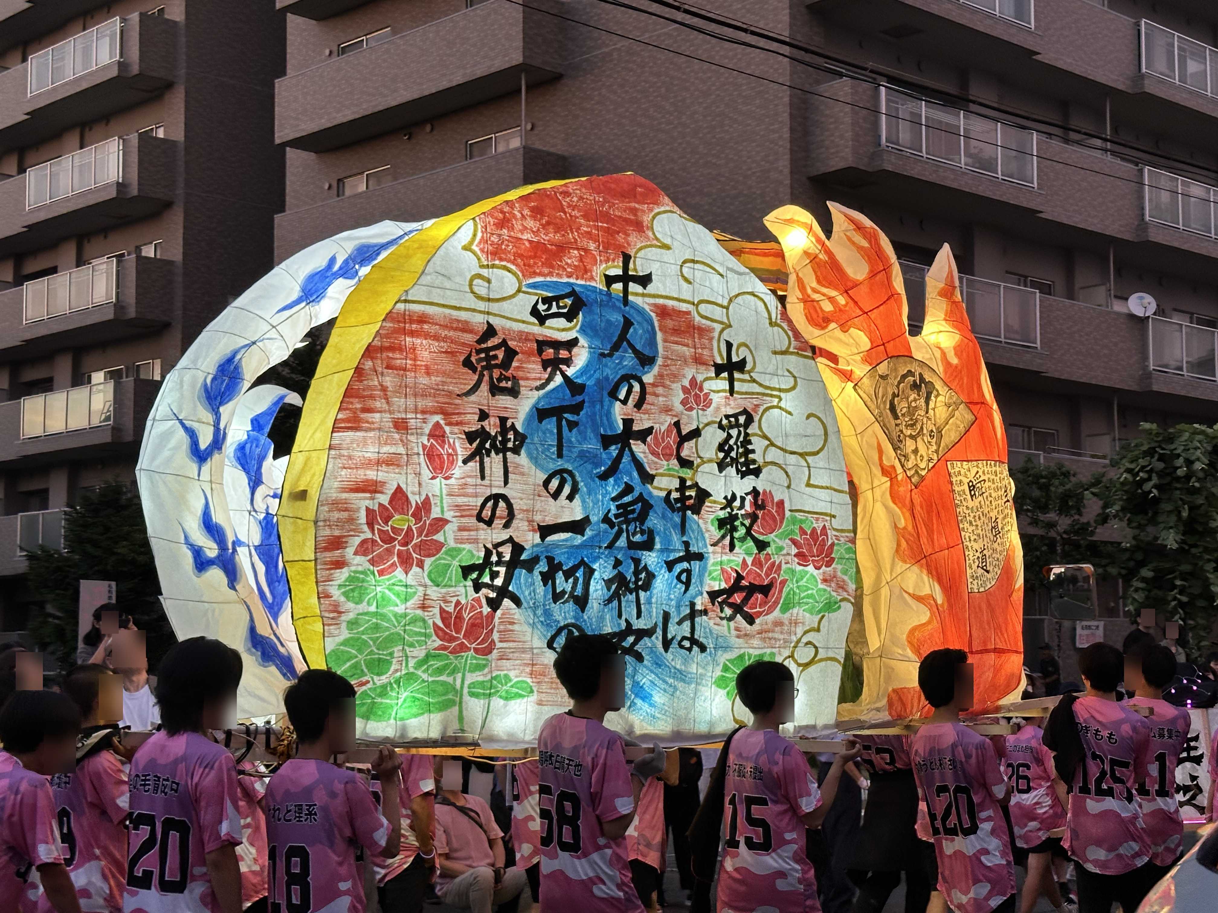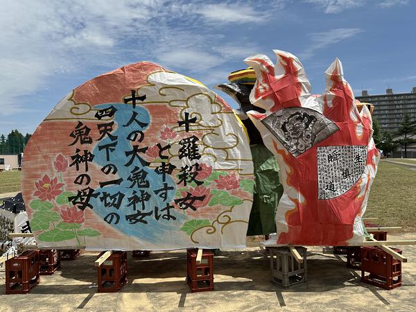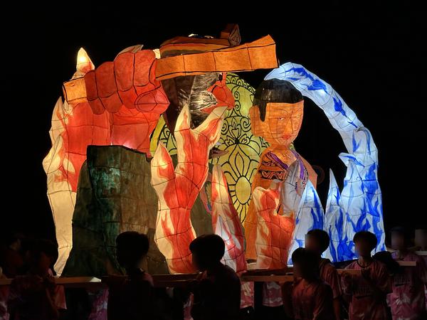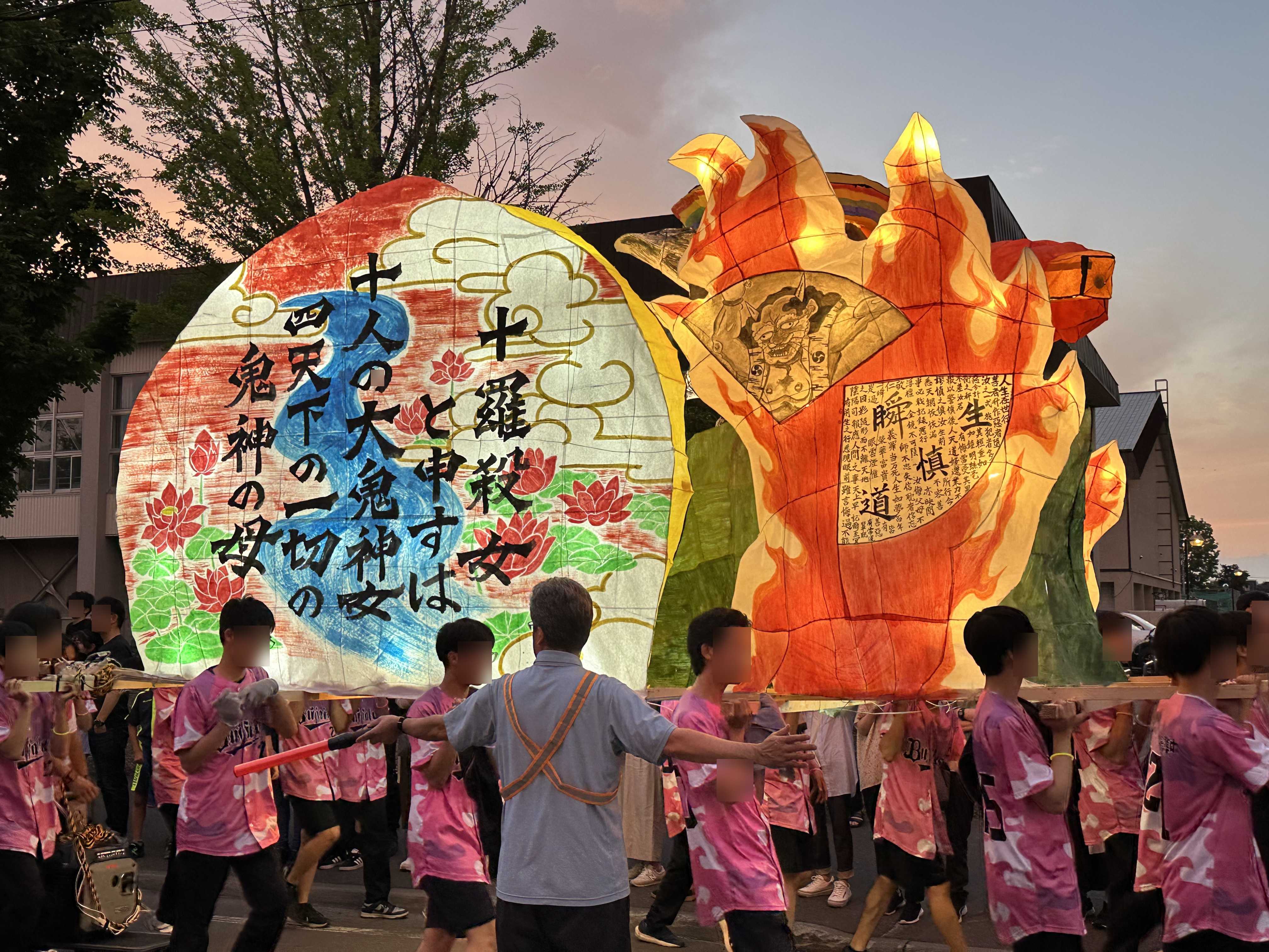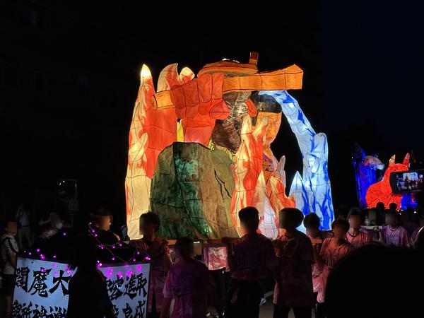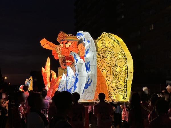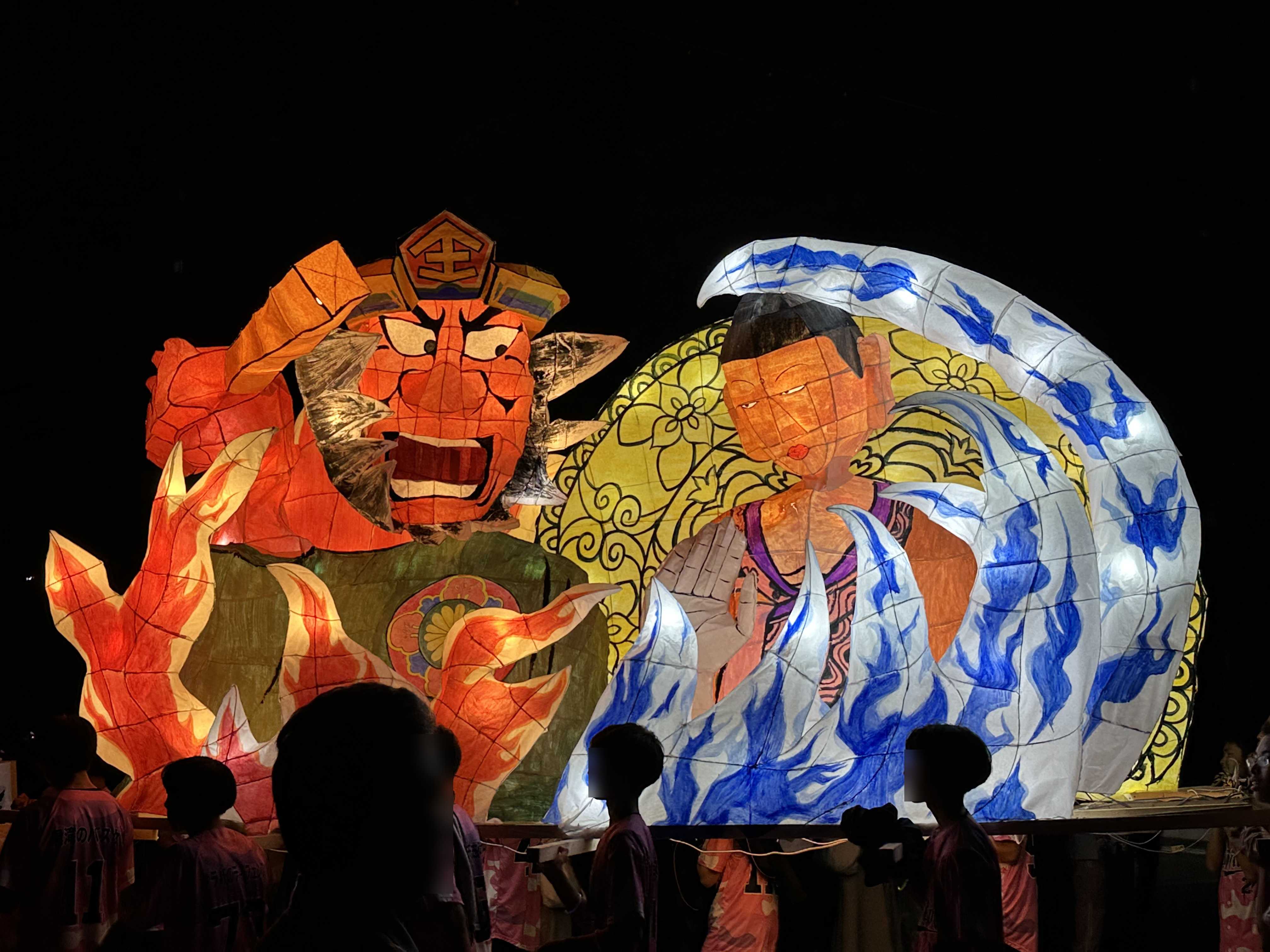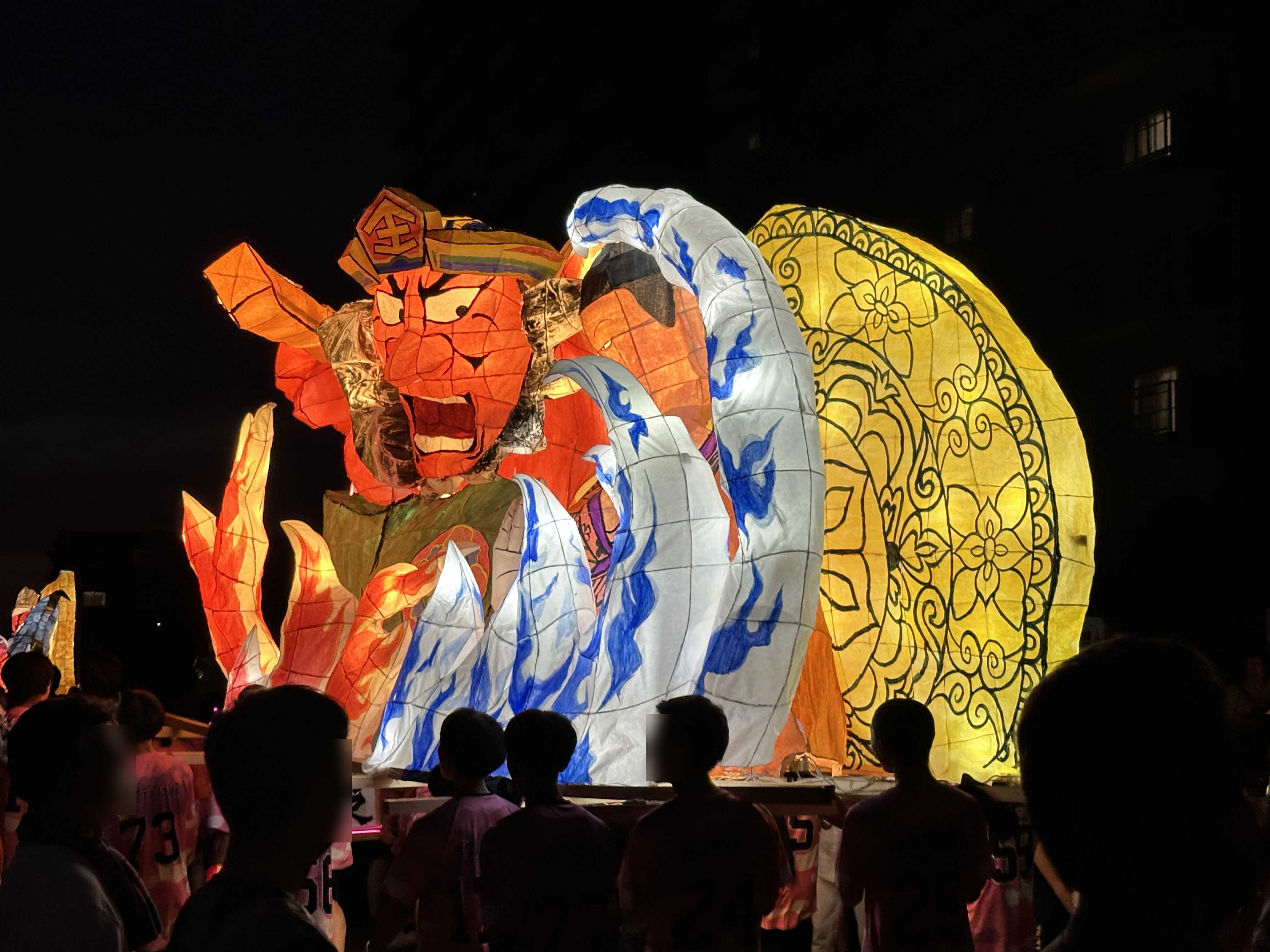閻魔大王と仏の激しさを増す戦い。そんな場面を切り取った行灯は地獄と天国、閻魔大王と仏などの様々な対比を鮮やかな色や構図で表現しています。言葉では言い尽くせない魅力がつまった二年七組力作の行灯をぜひお楽しみください。