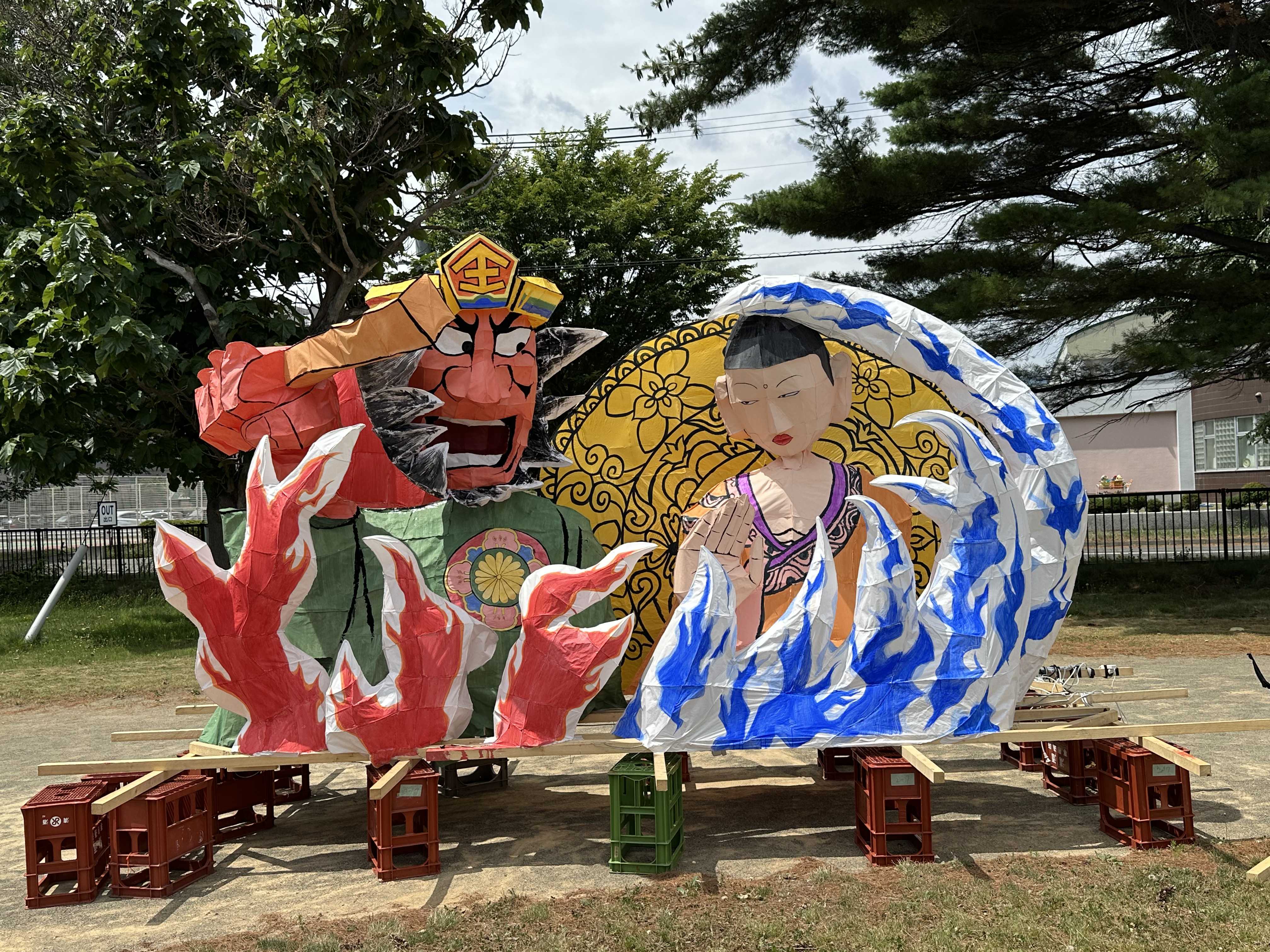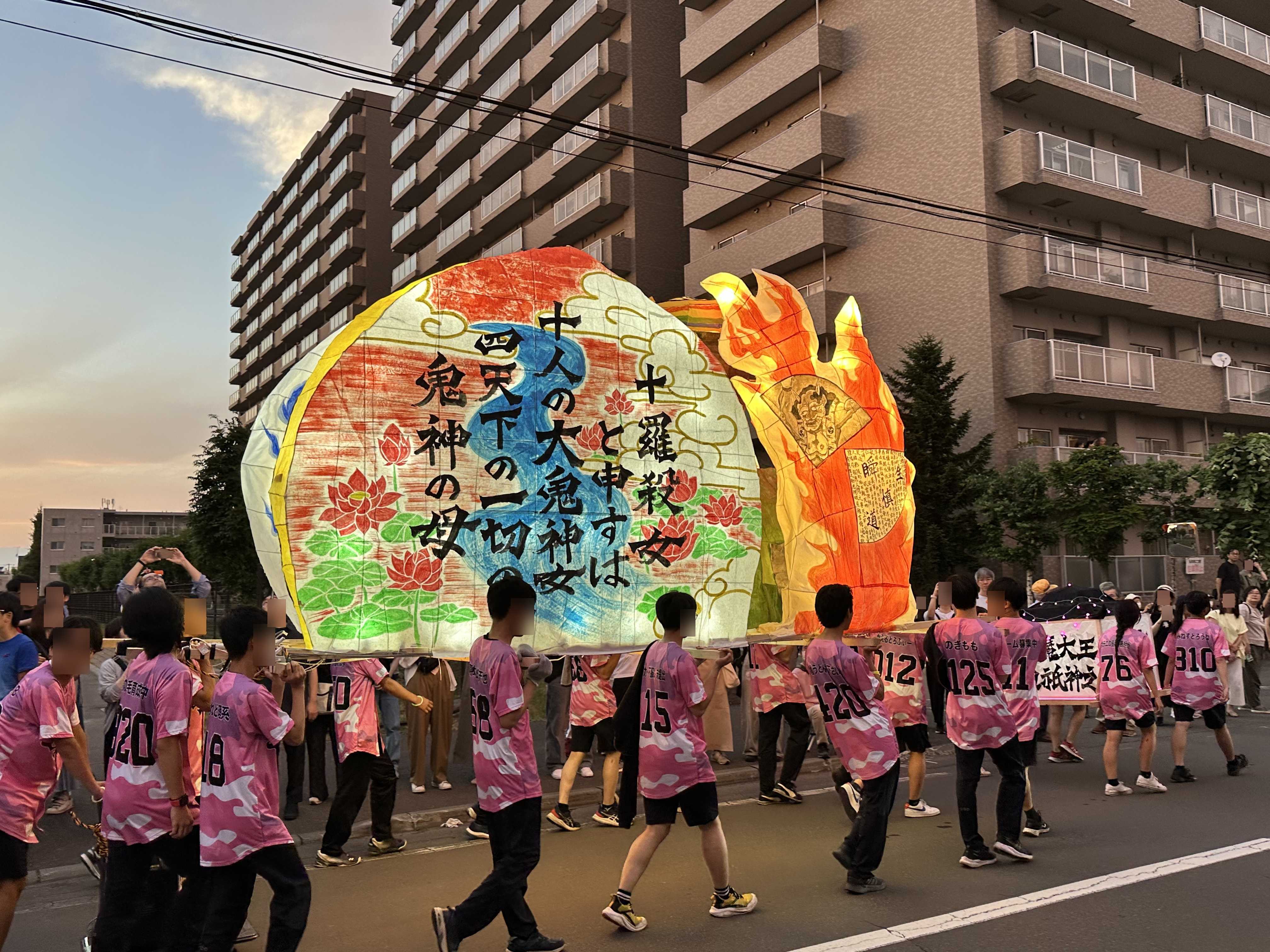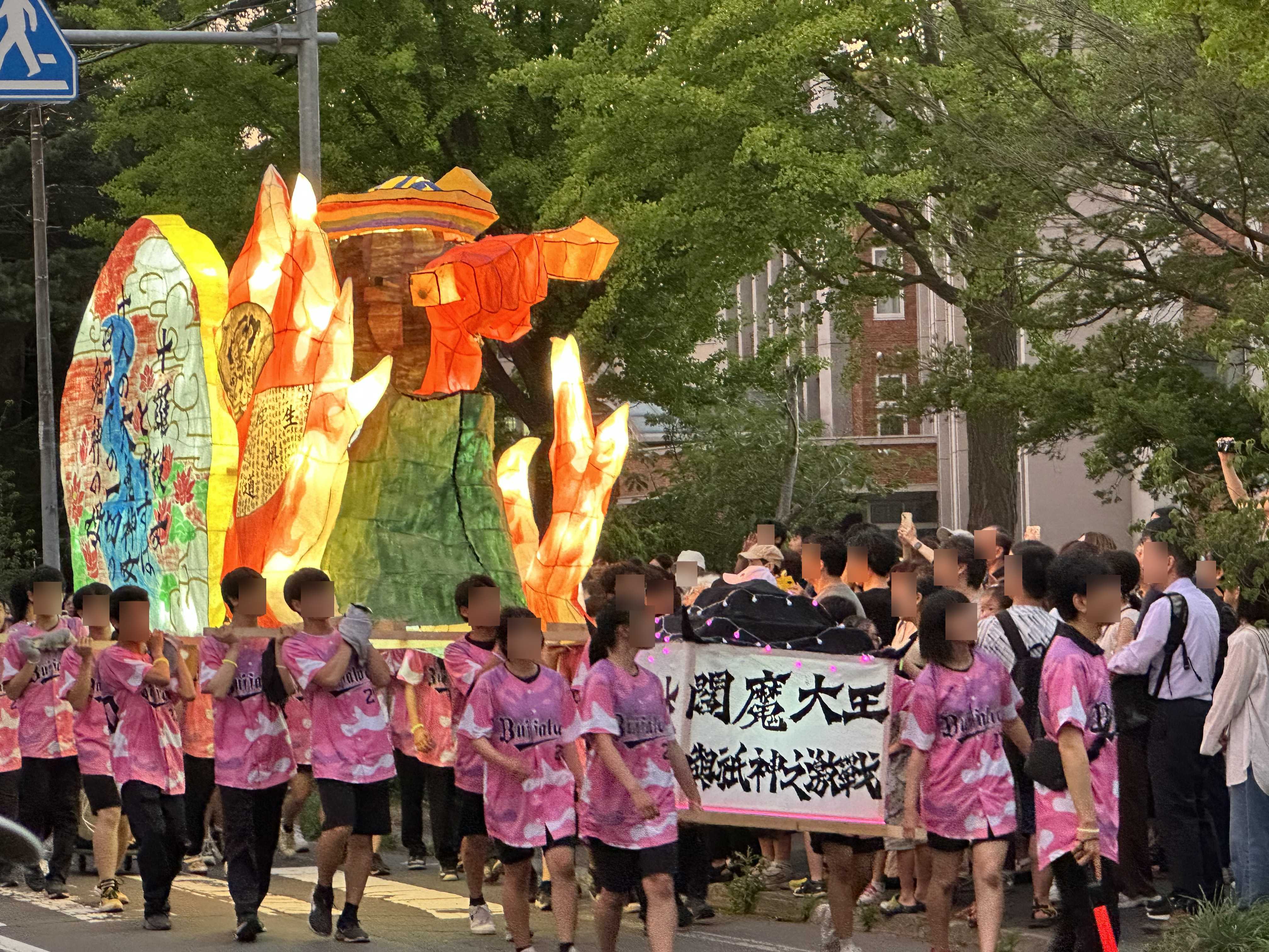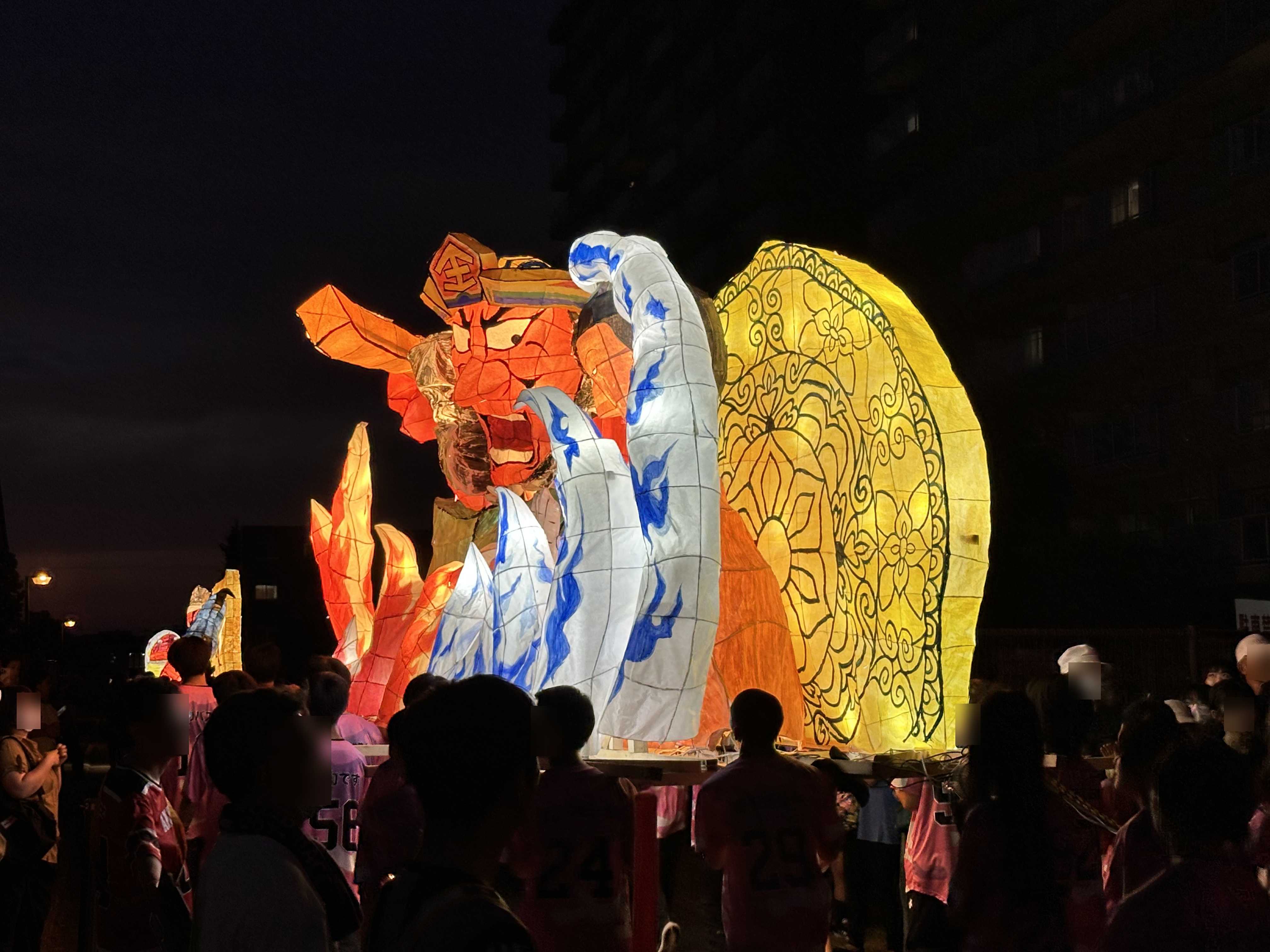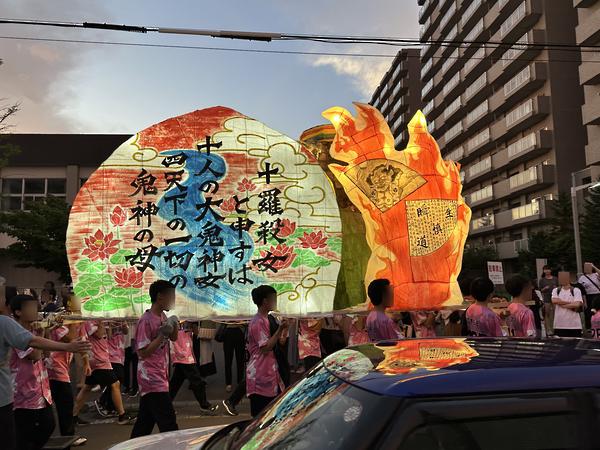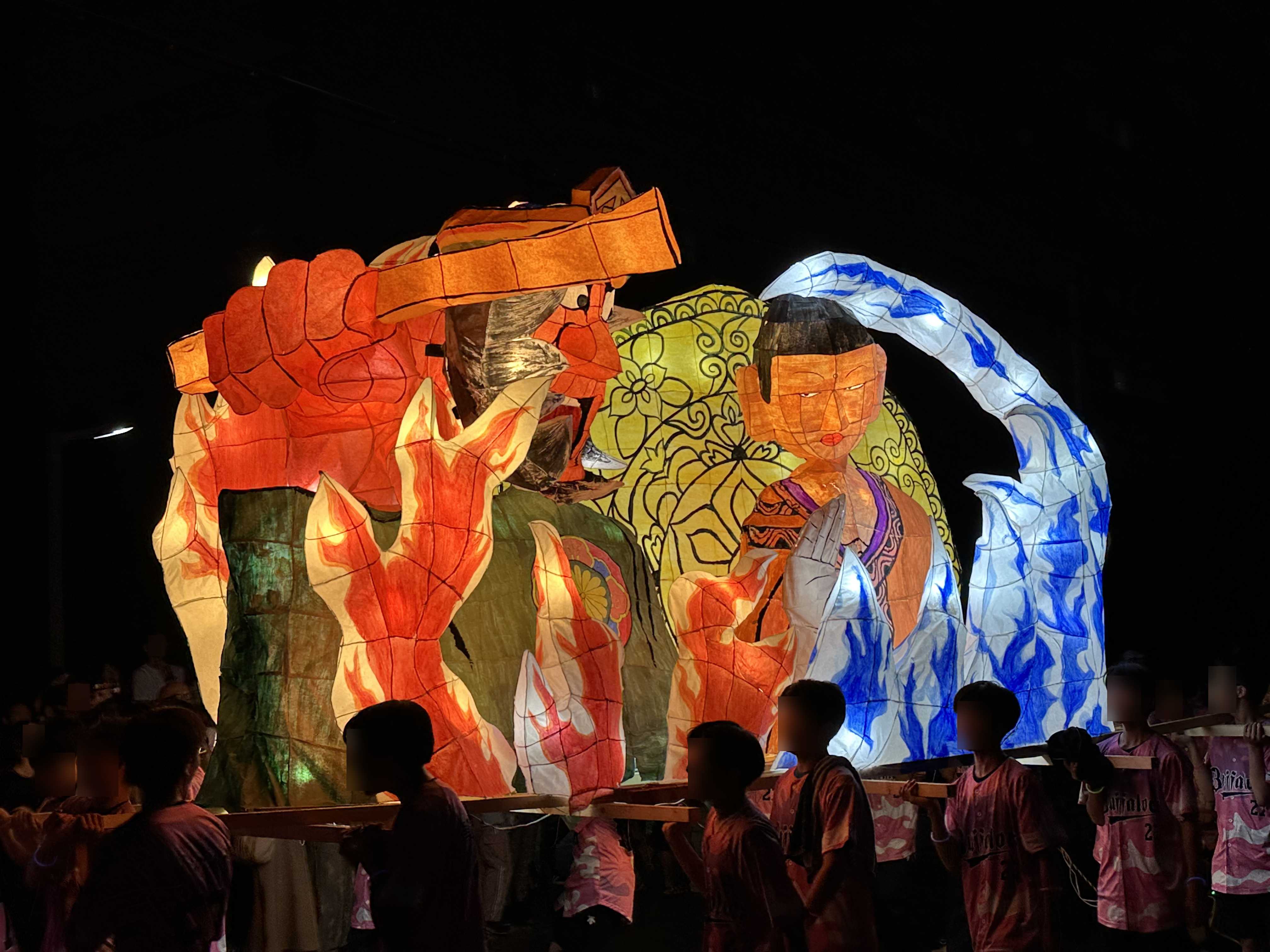 閻魔大王と仏の激しさを増す戦い。そんな場面を切り取った行灯は地獄と天国、閻魔大王と仏などの様々な対比を鮮やかな色や構図で表現しています。言葉では言い尽くせない魅力がつまった二年七組力作の行灯をぜひお楽しみください。