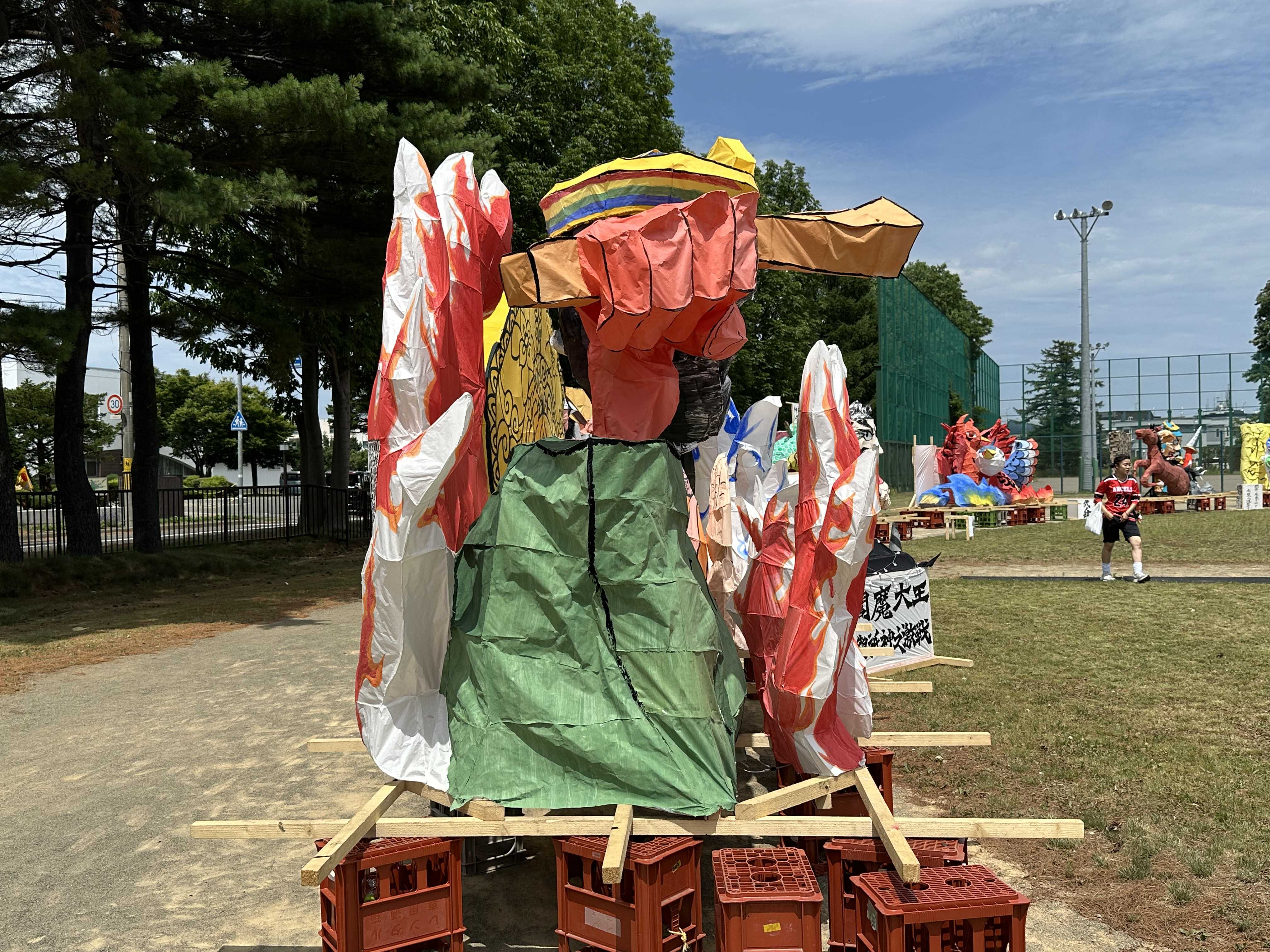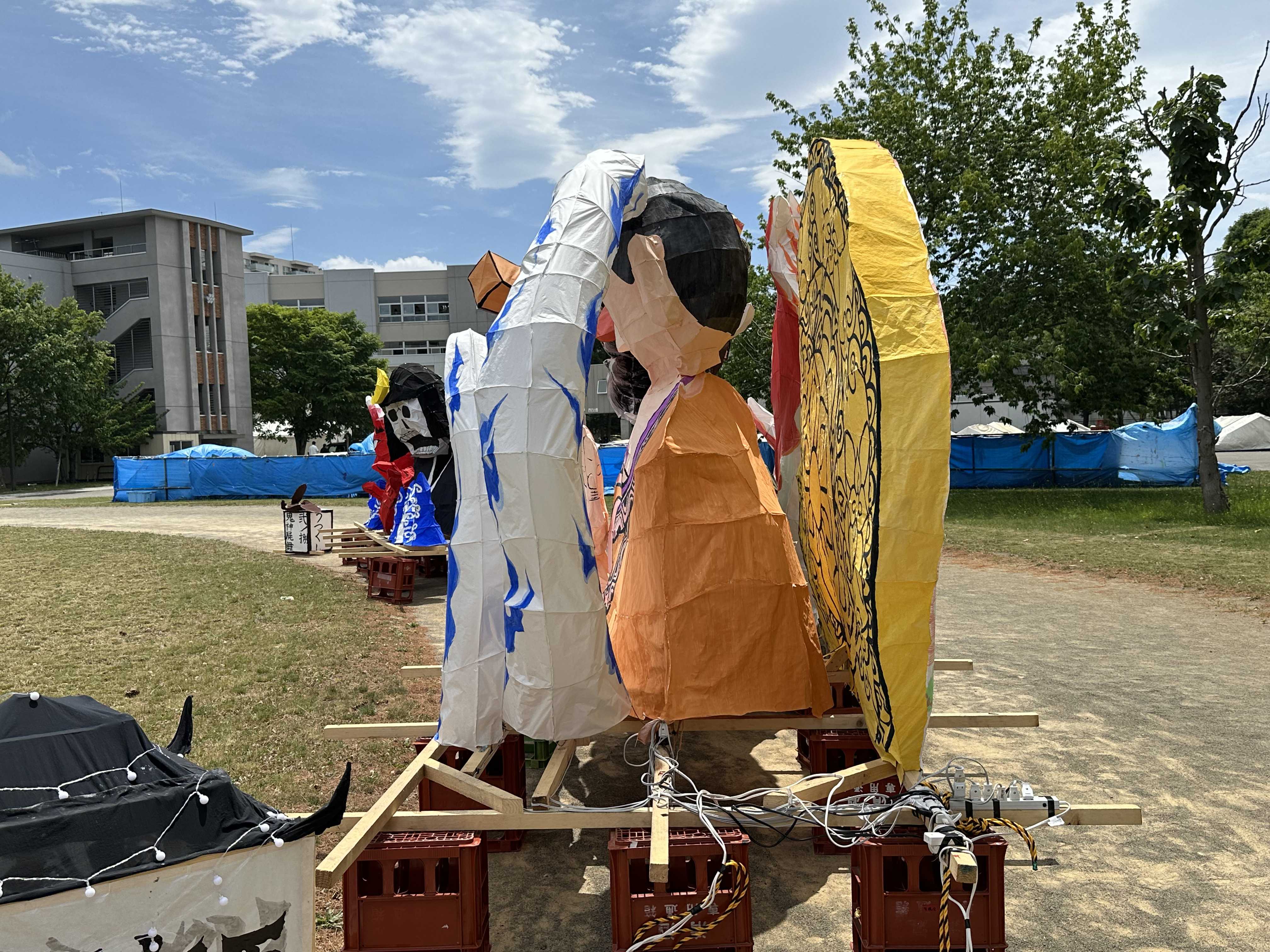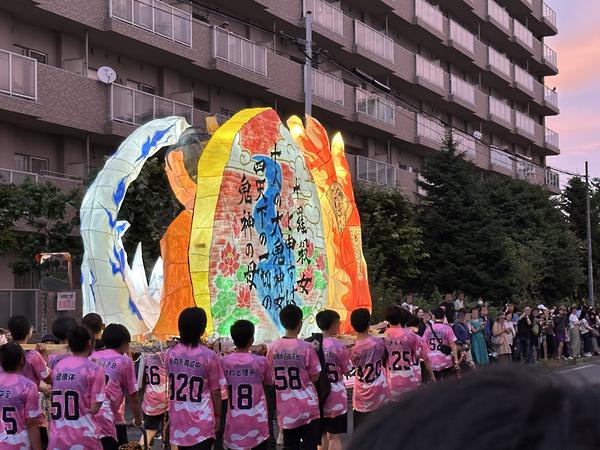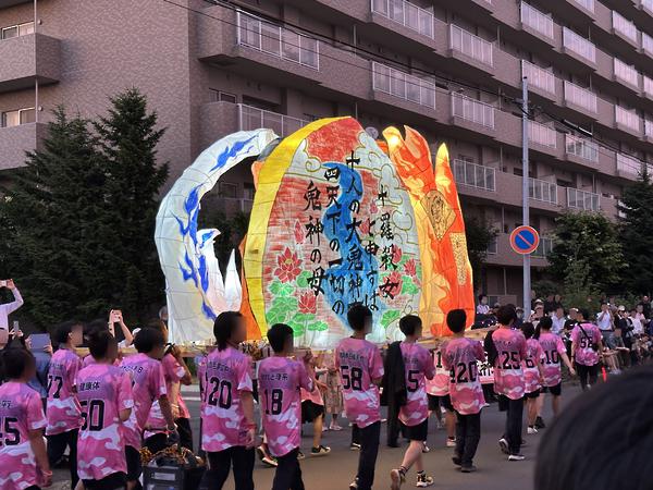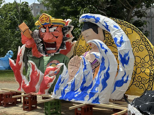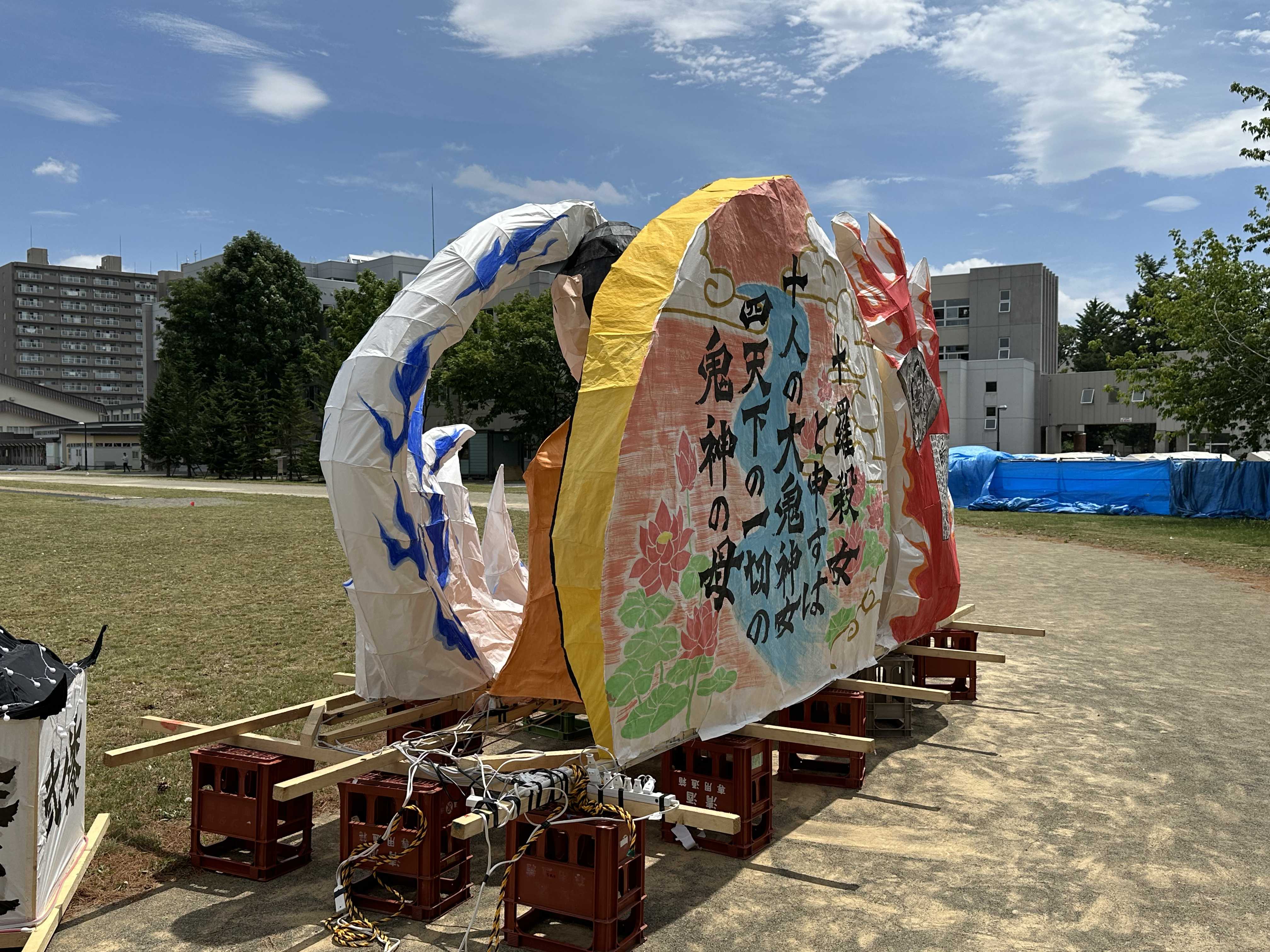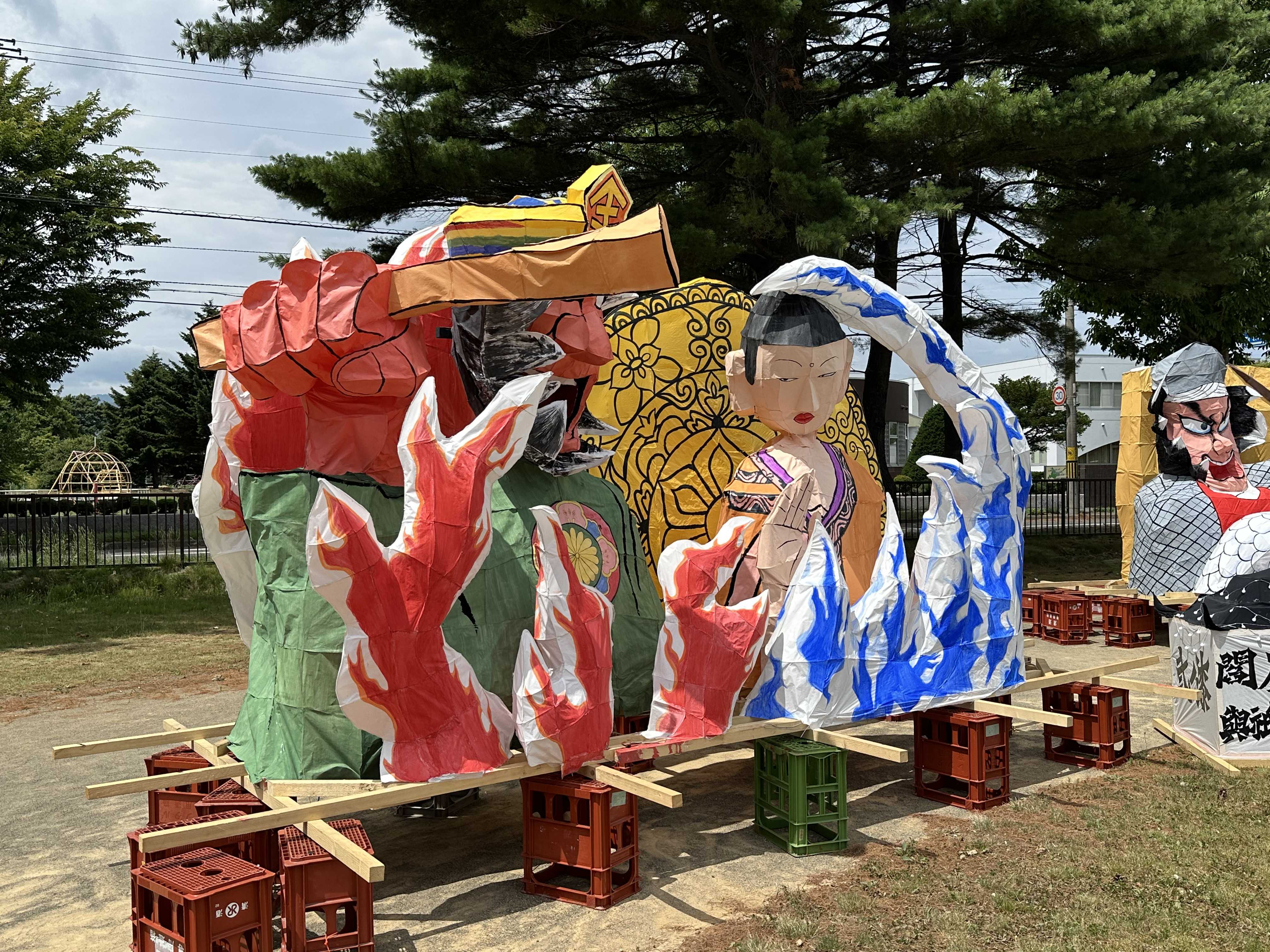 閻魔大王と仏の激しさを増す戦い。そんな場面を切り取った行灯は地獄と天国、閻魔大王と仏などの様々な対比を鮮やかな色や構図で表現しています。言葉では言い尽くせない魅力がつまった二年七組力作の行灯をぜひお楽しみください。