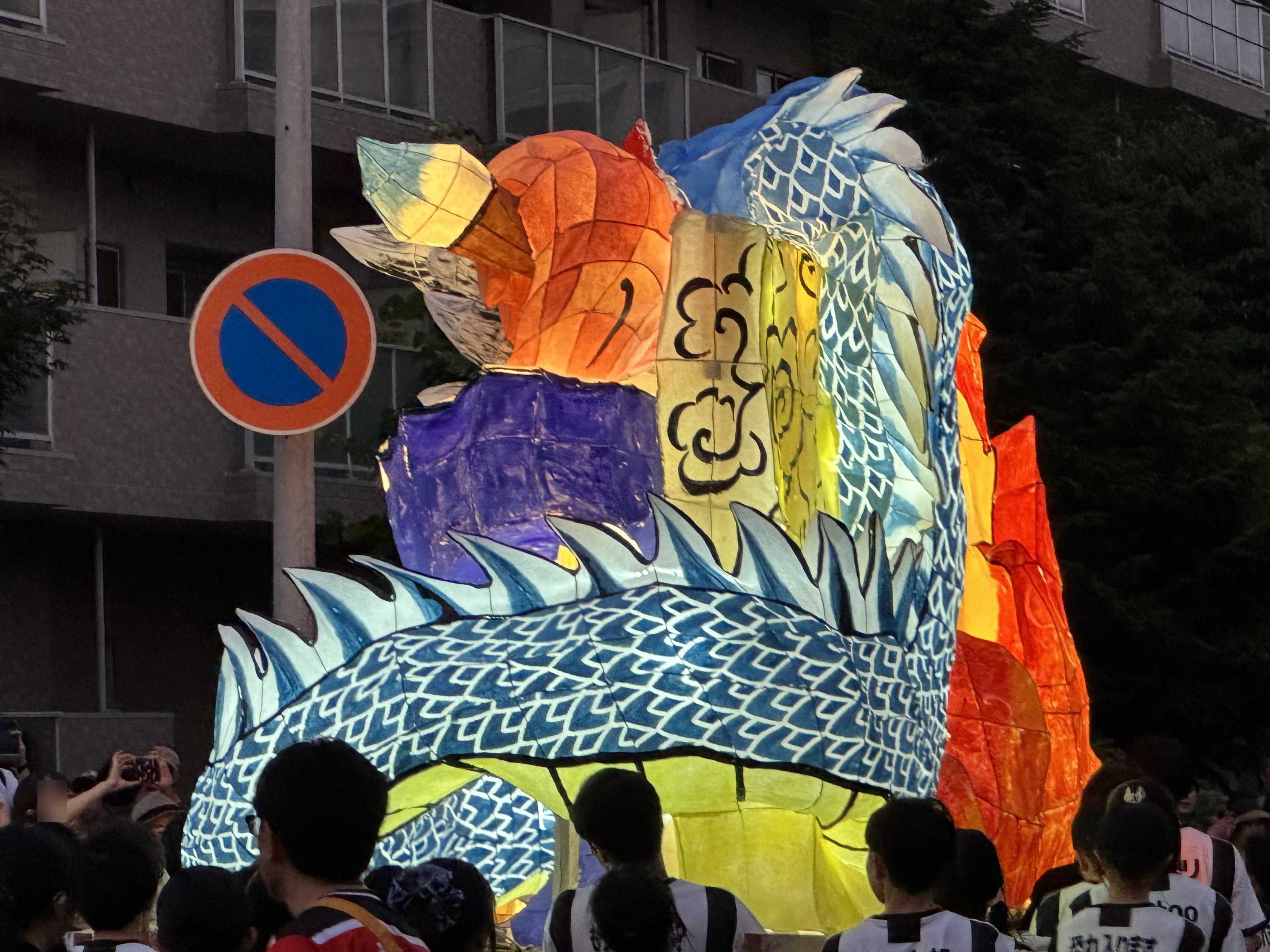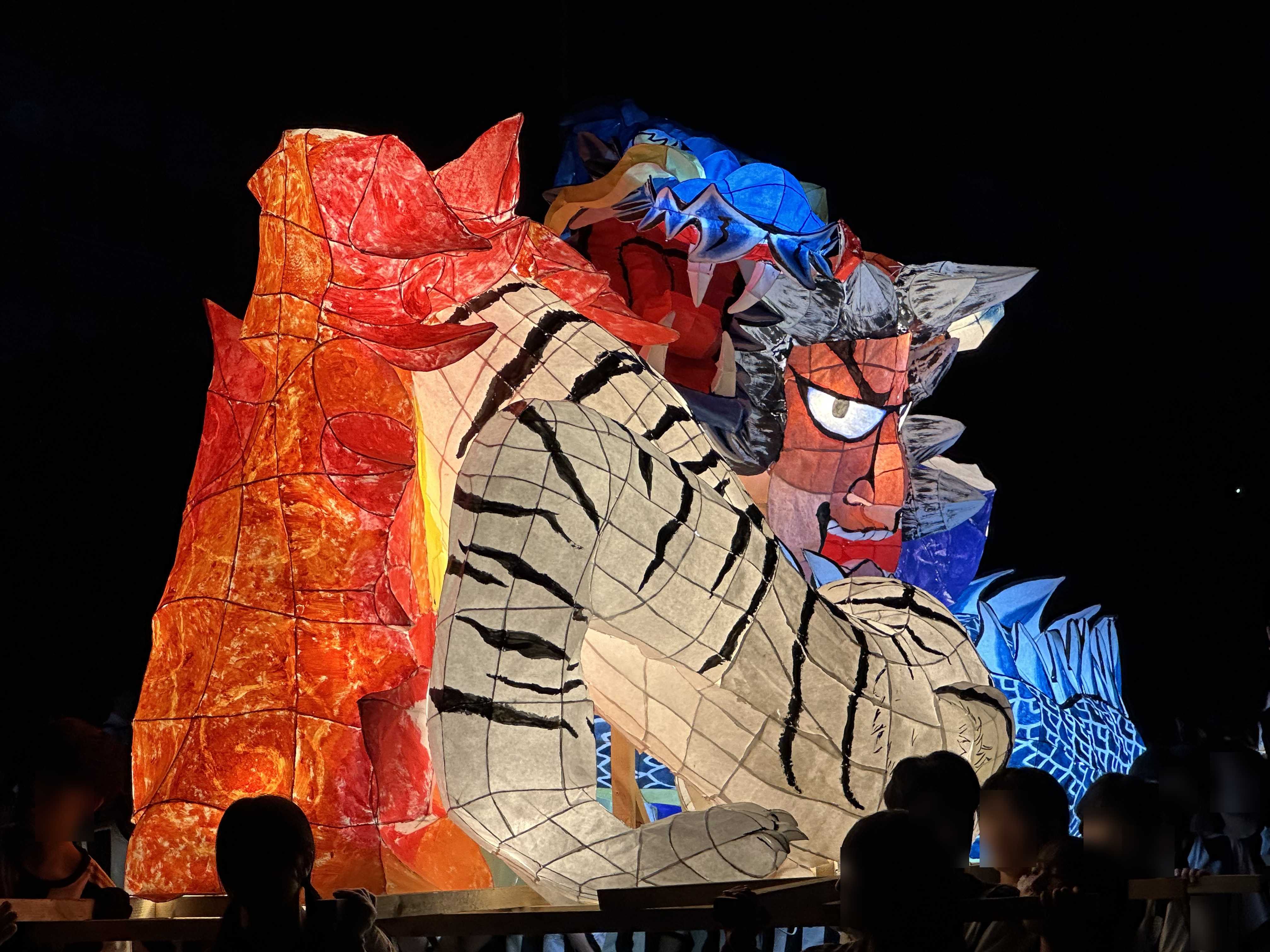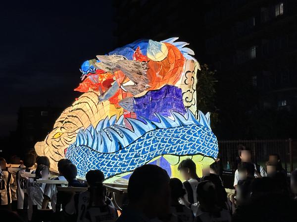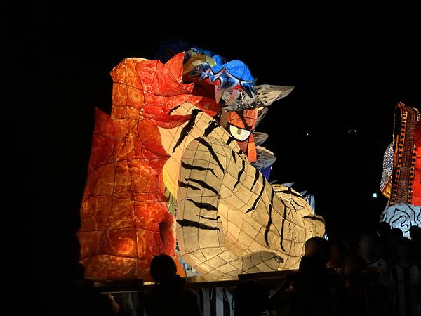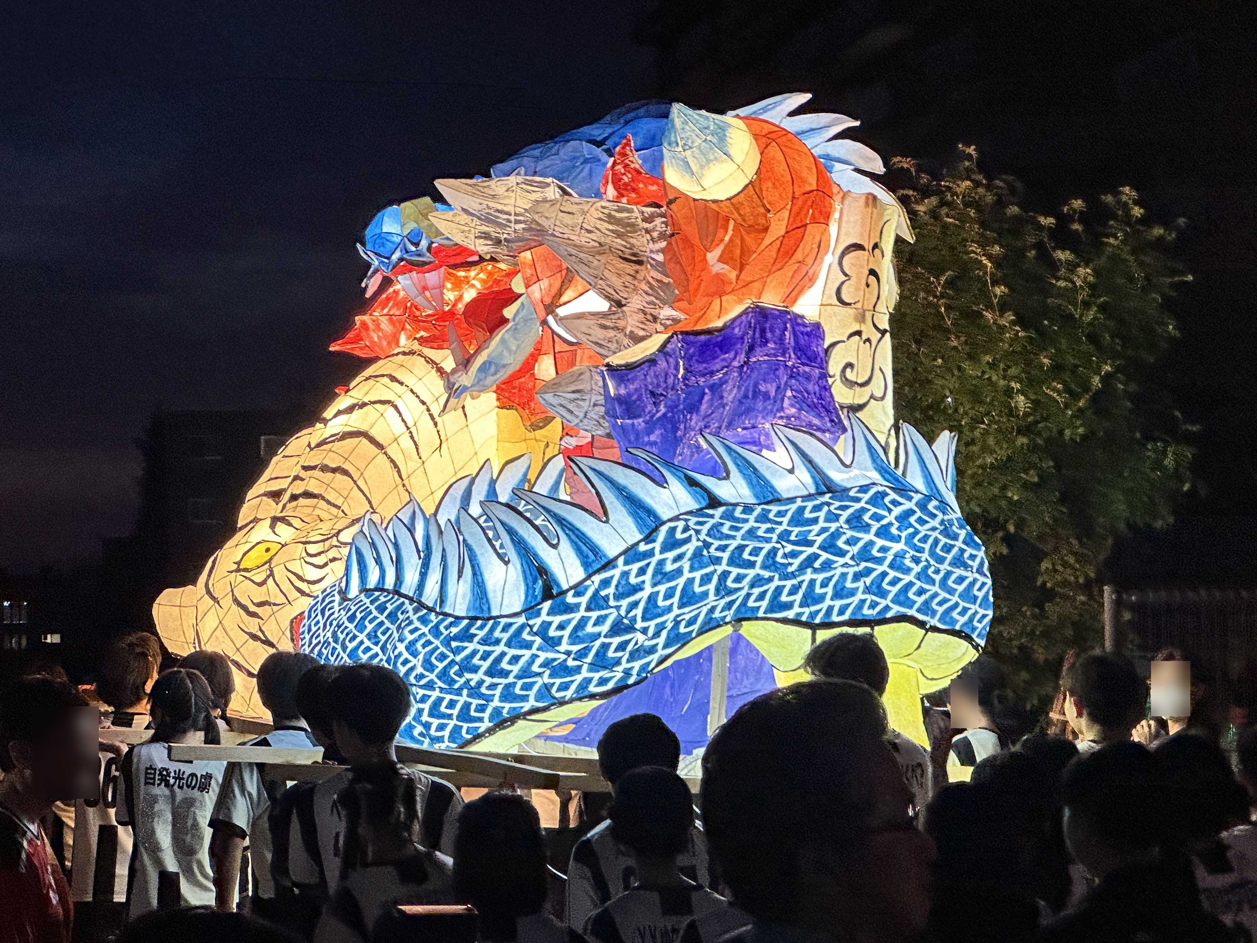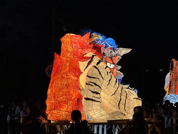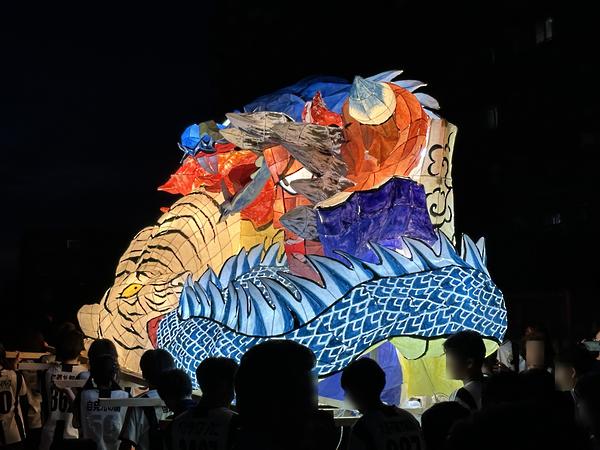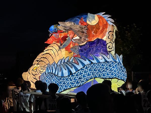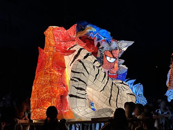 龍がかっこいい!特に後ろから見たときの龍のうねり具合がかっこよくて好きです。龍の背びれをきちんと作るところは珍しいのですがこちらの行灯は上手く作られていましたし、背びれの先が細くなりがちなのにどれも光っていたので電飾も素晴らしかったです。