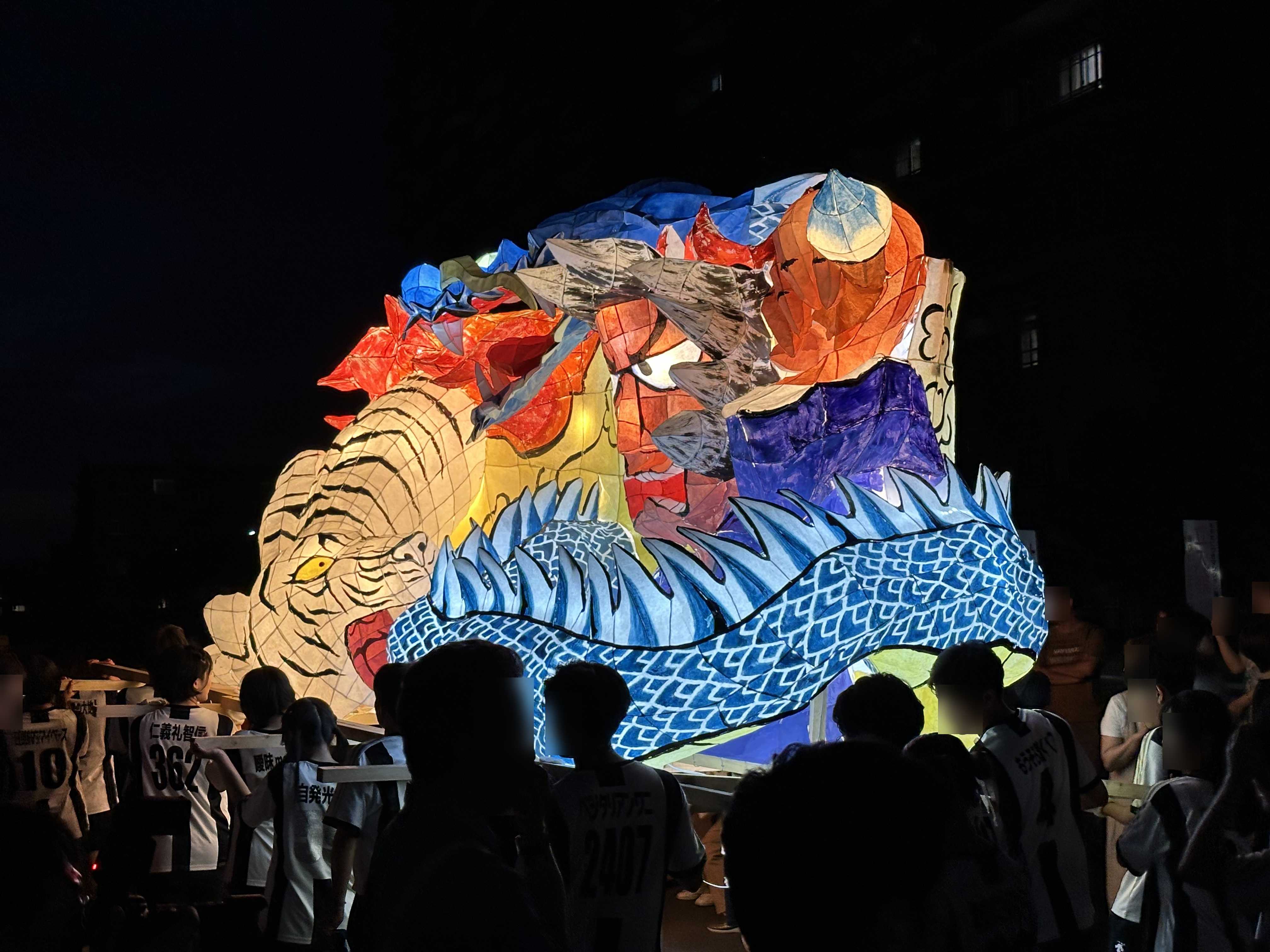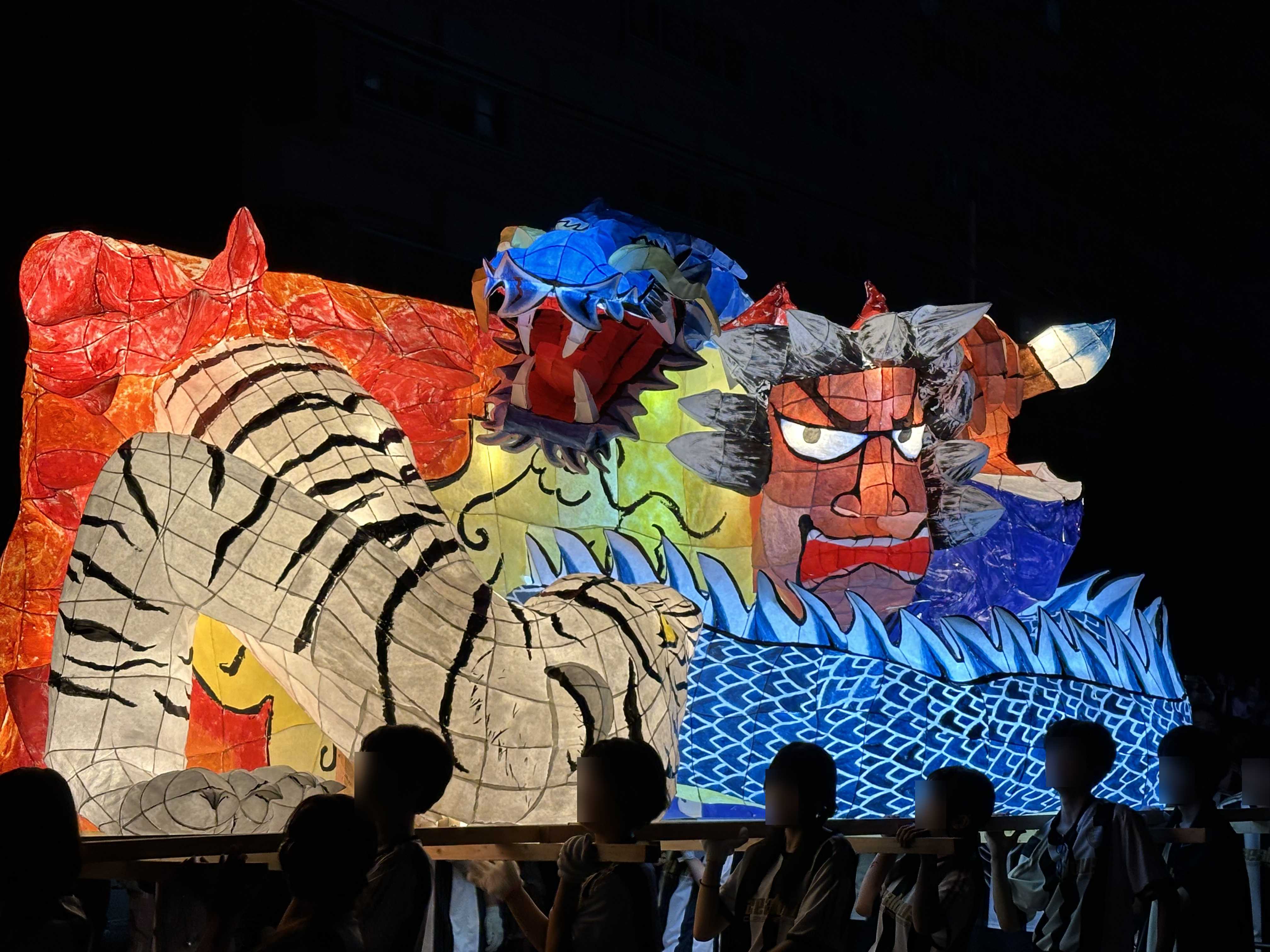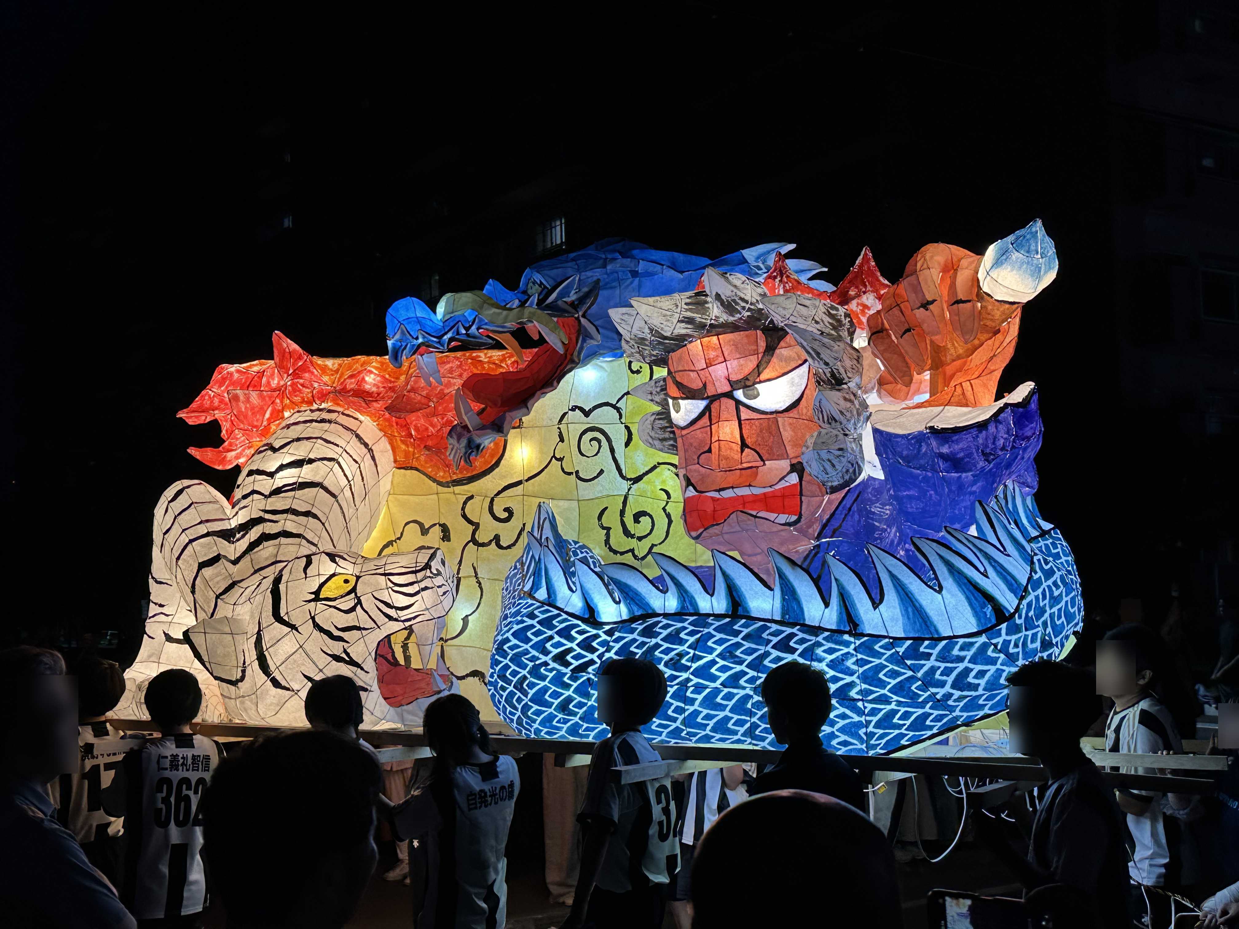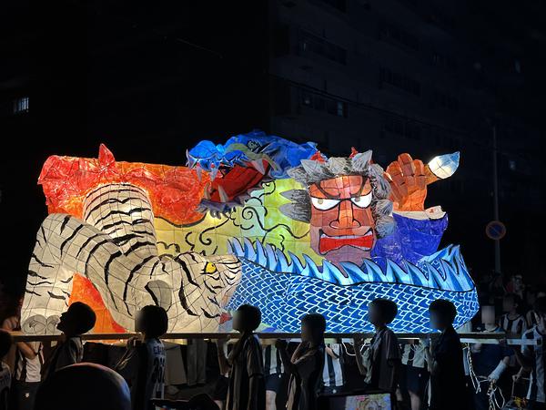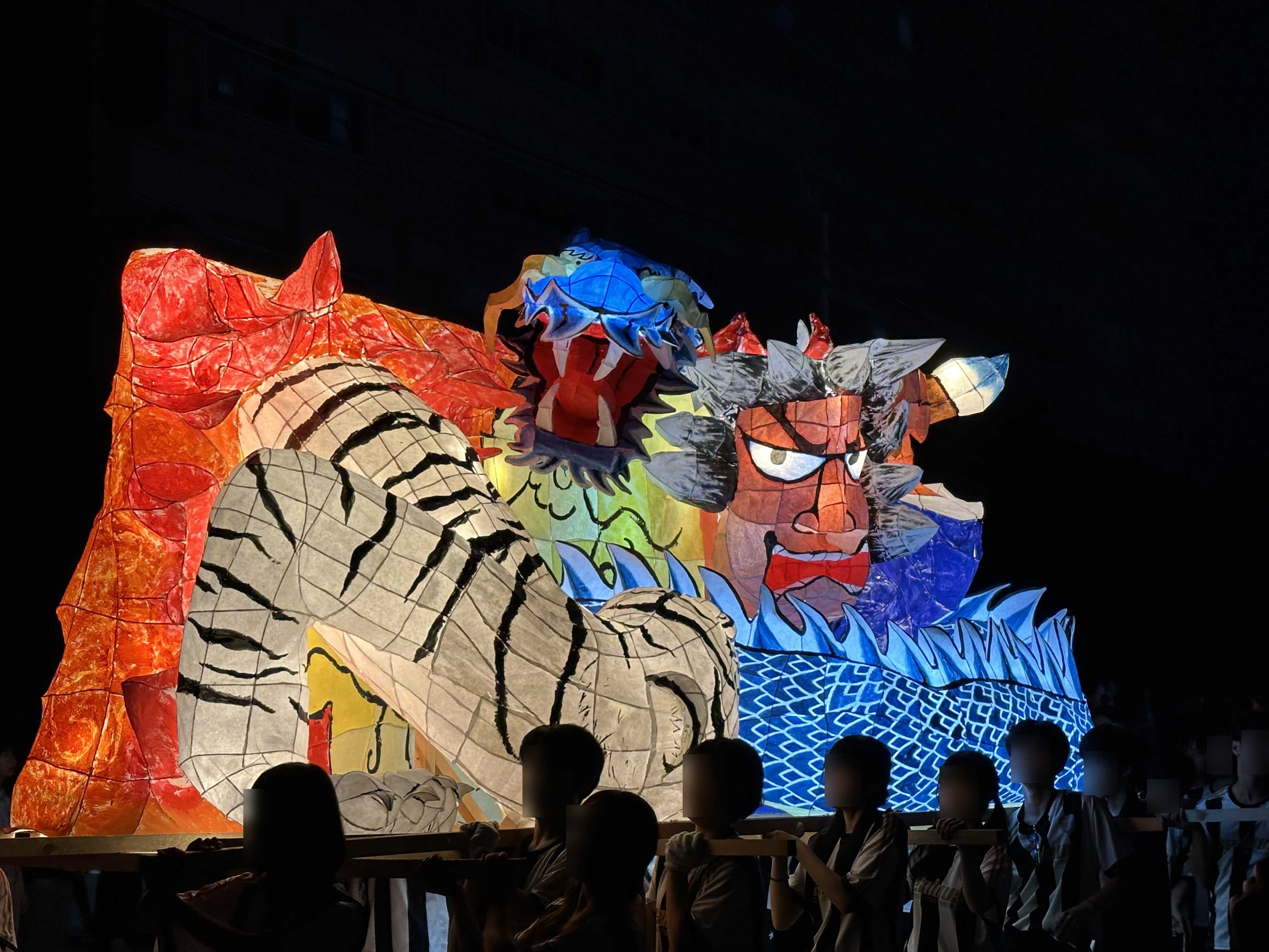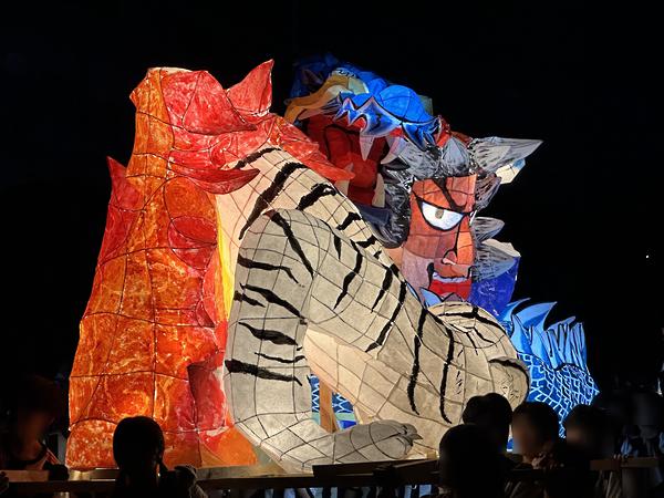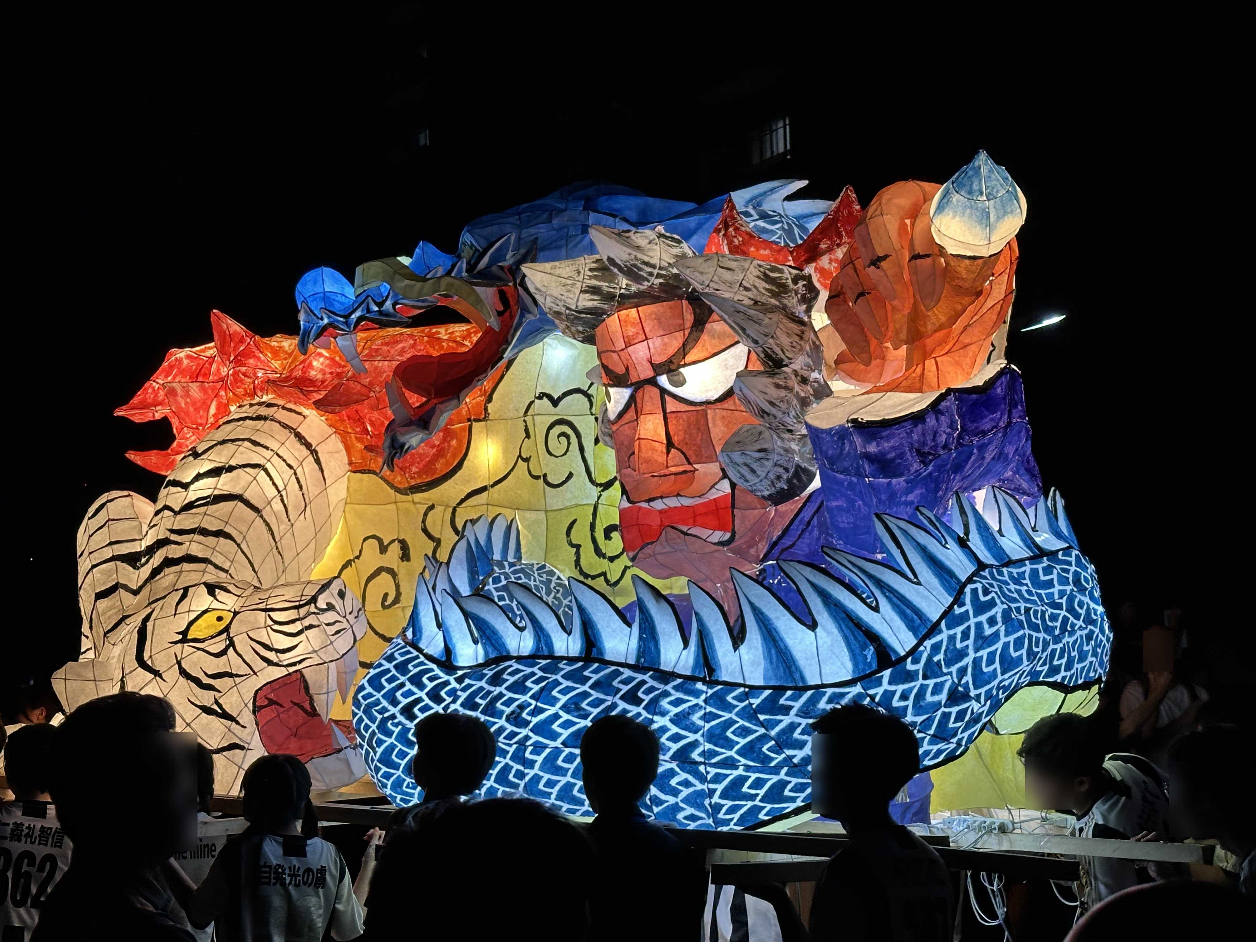龍がかっこいい!特に後ろから見たときの龍のうねり具合がかっこよくて好きです。龍の背びれをきちんと作るところは珍しいのですがこちらの行灯は上手く作られていましたし、背びれの先が細くなりがちなのにどれも光っていたので電飾も素晴らしかったです。