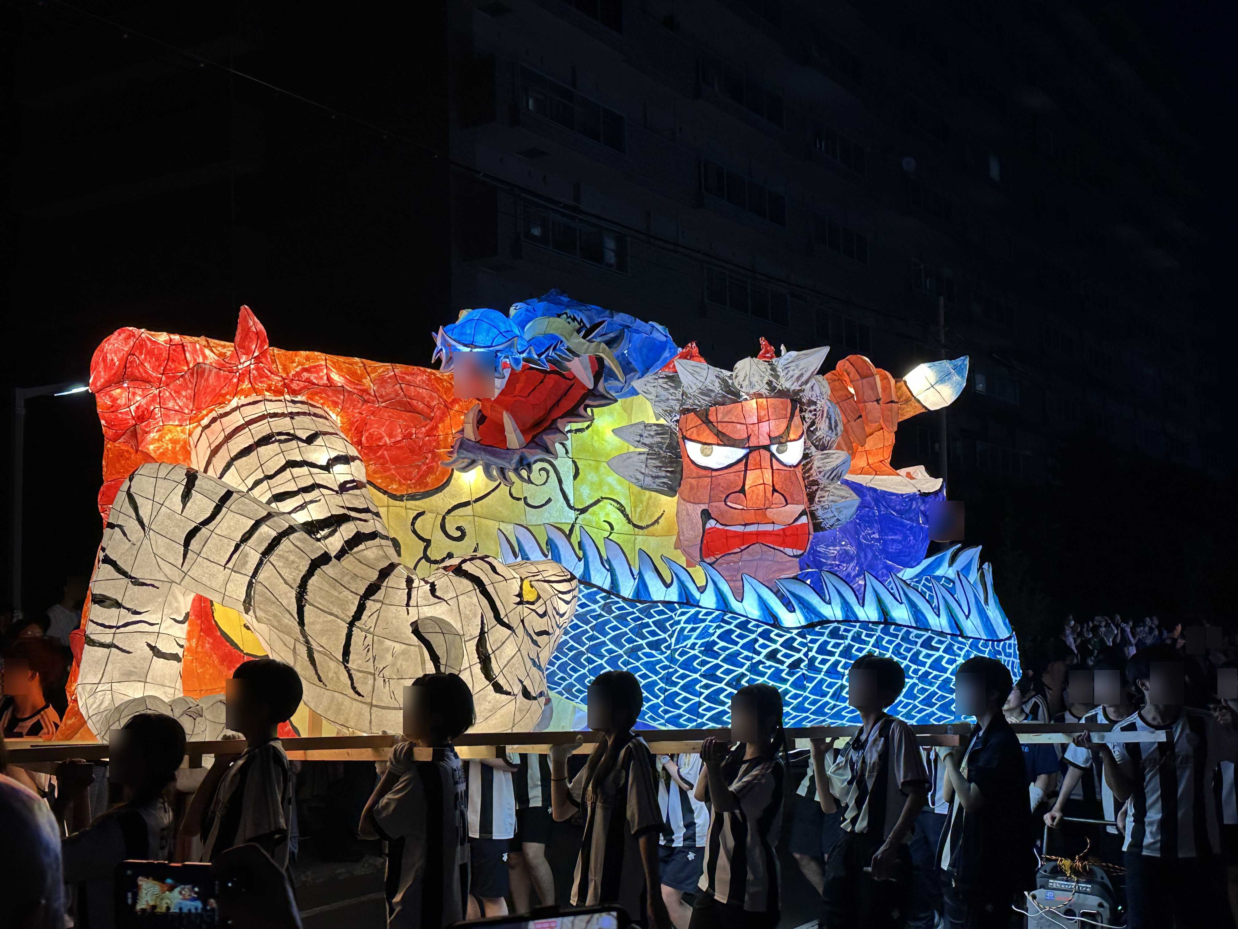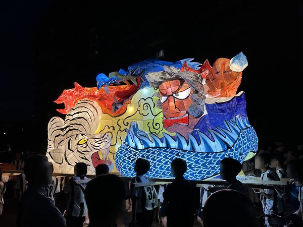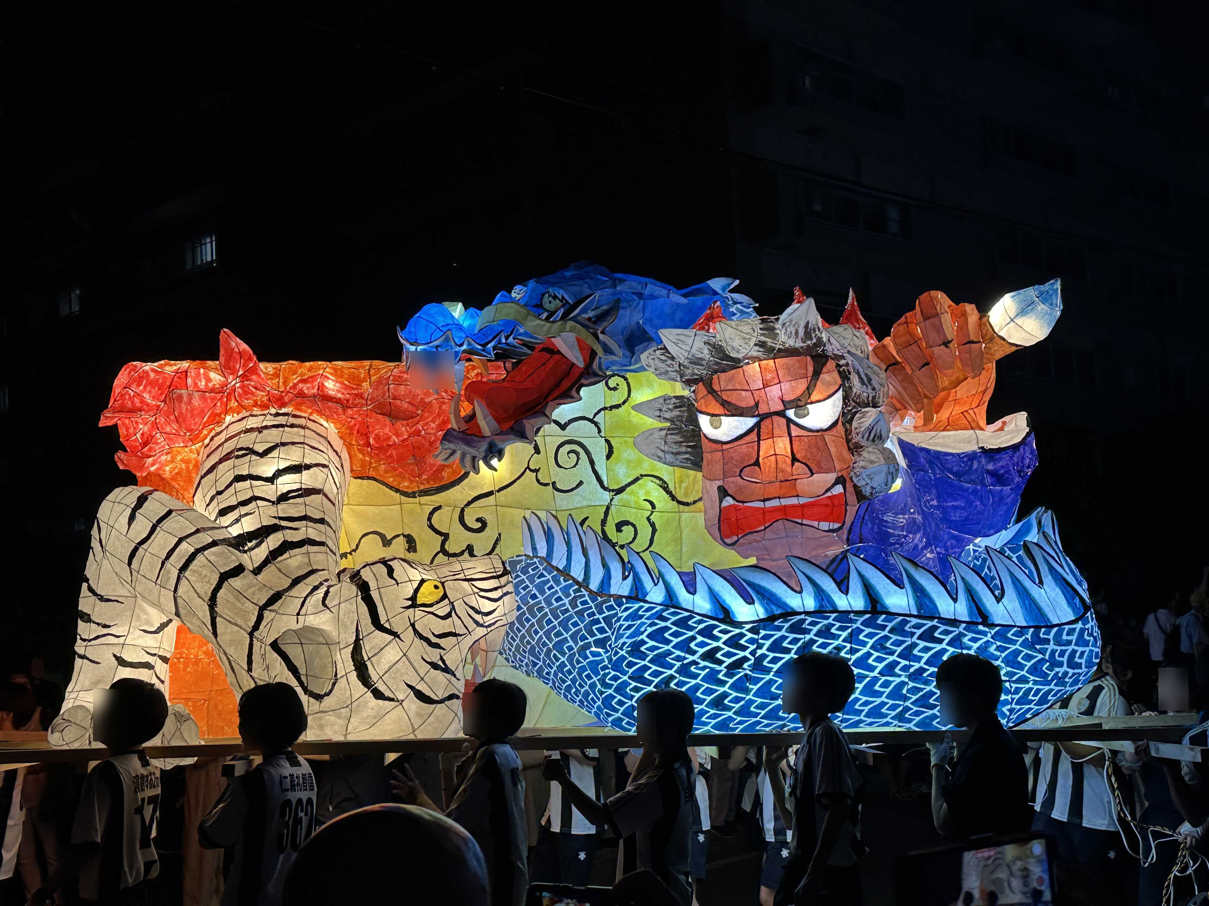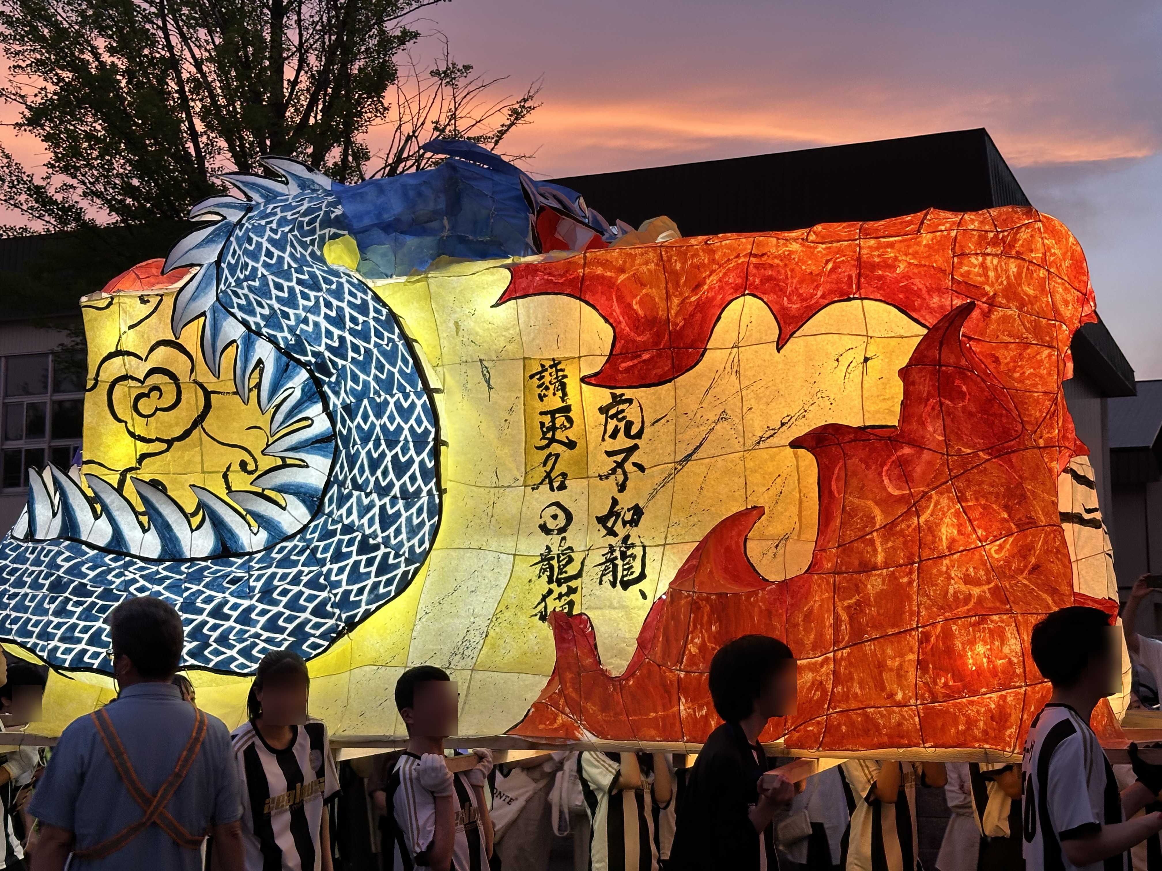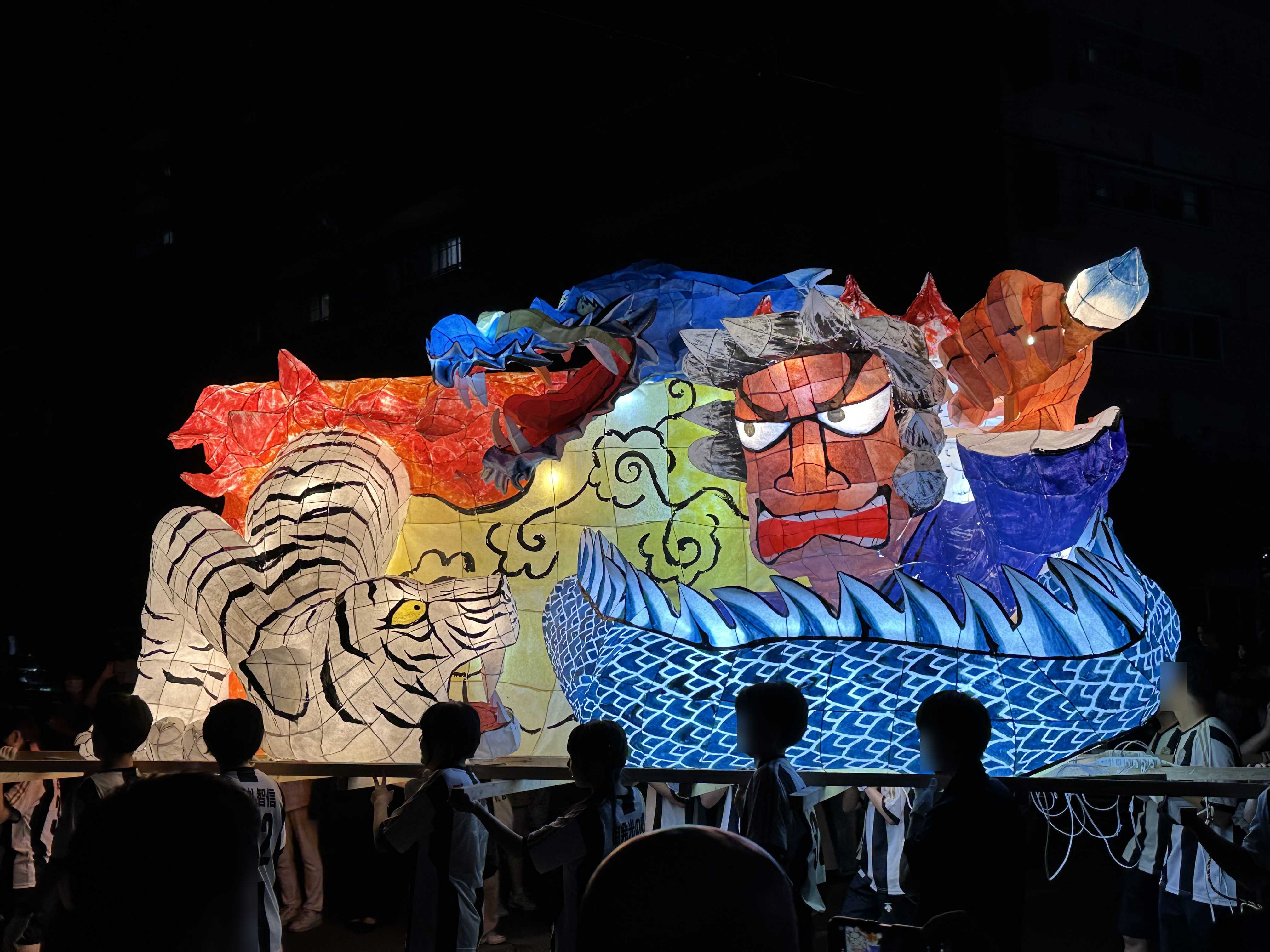 龍がかっこいい!特に後ろから見たときの龍のうねり具合がかっこよくて好きです。龍の背びれをきちんと作るところは珍しいのですがこちらの行灯は上手く作られていましたし、背びれの先が細くなりがちなのにどれも光っていたので電飾も素晴らしかったです。