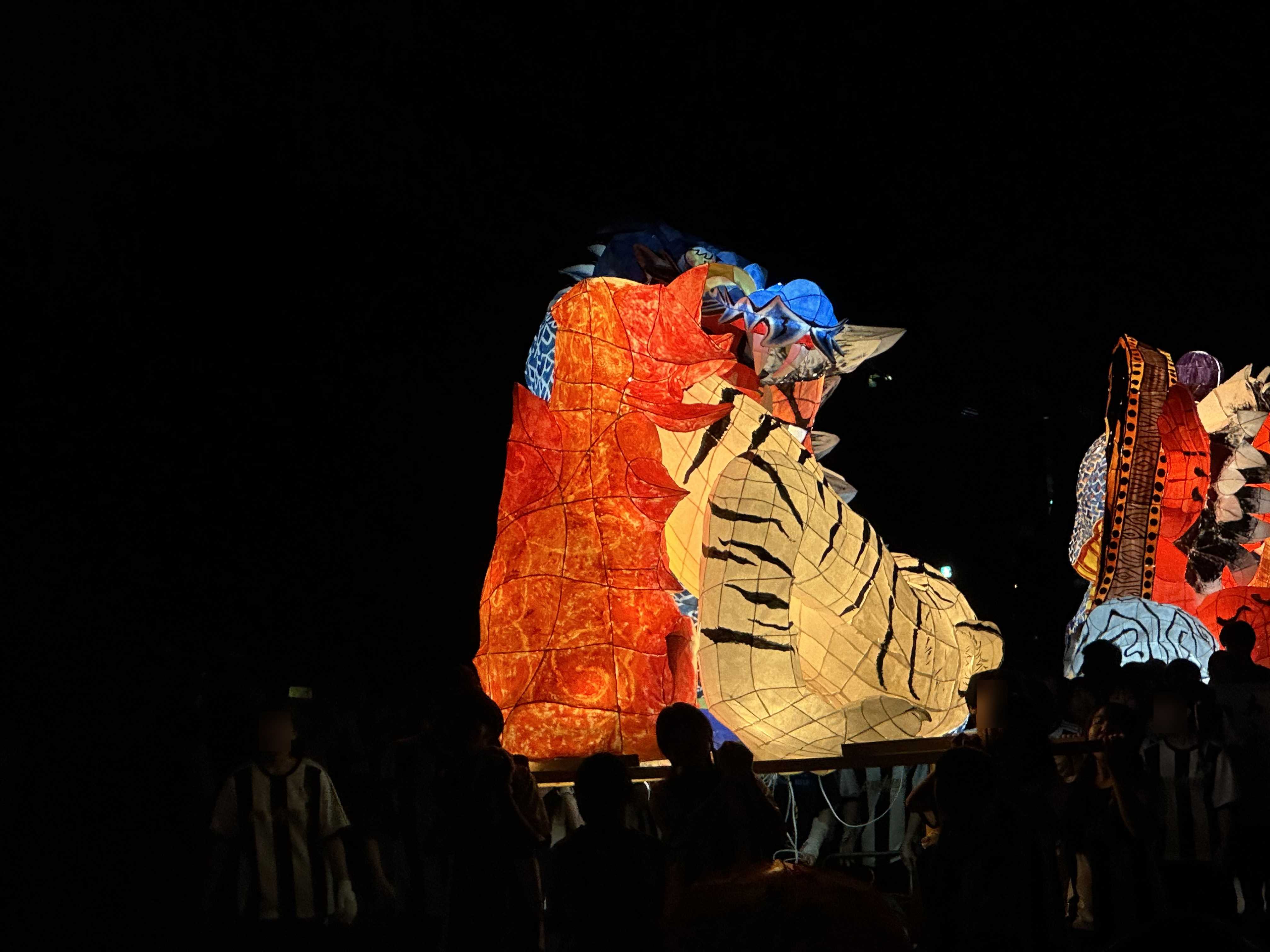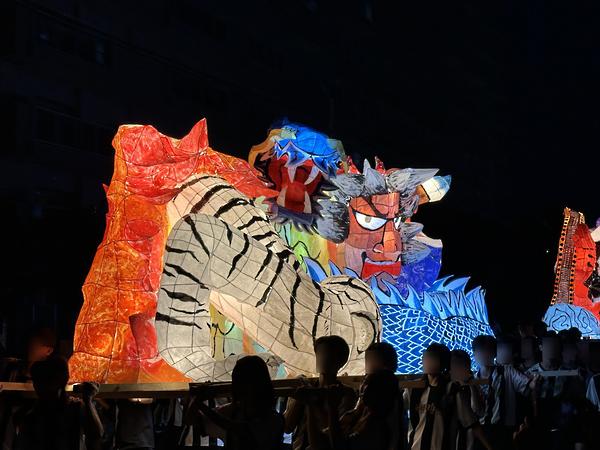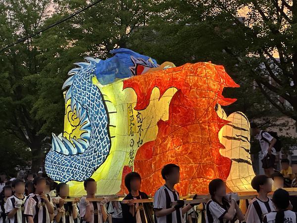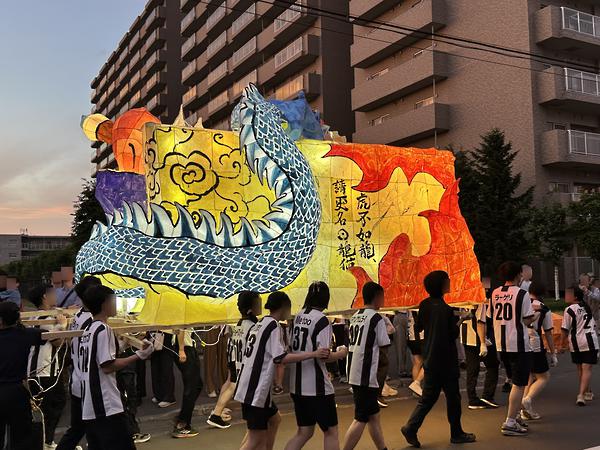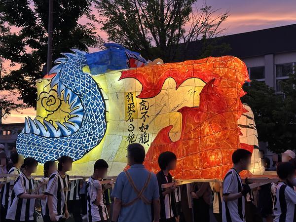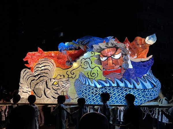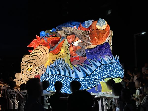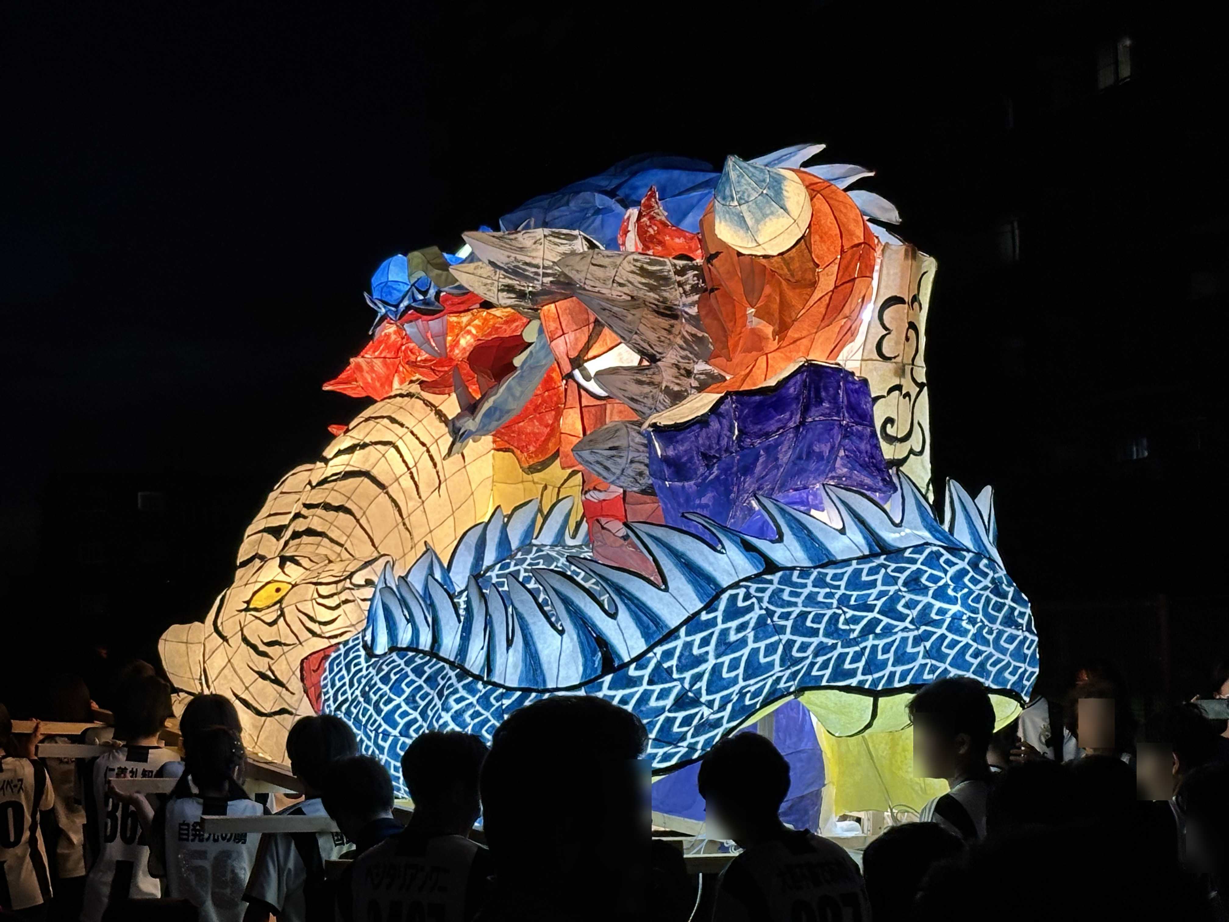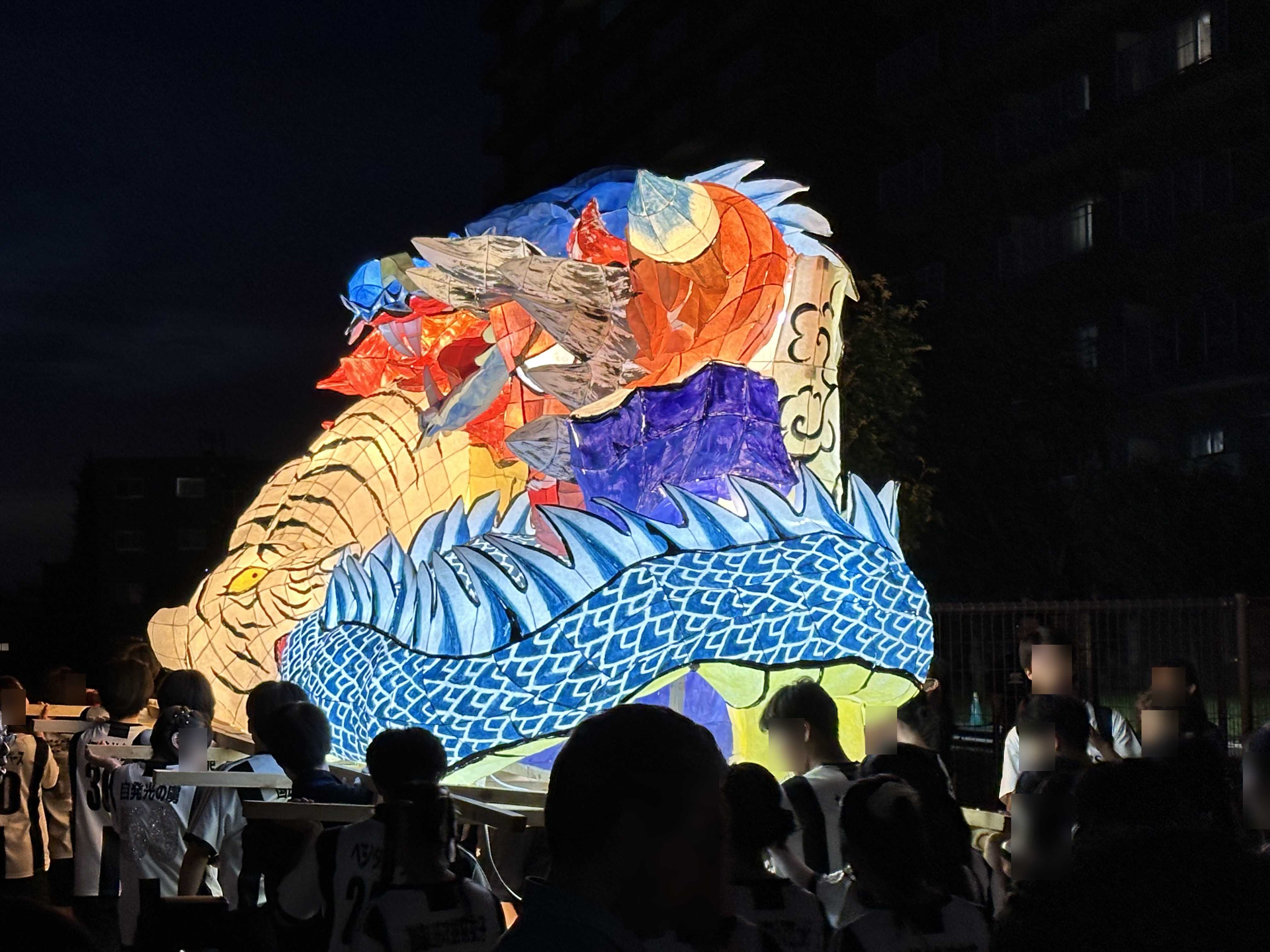 龍がかっこいい!特に後ろから見たときの龍のうねり具合がかっこよくて好きです。龍の背びれをきちんと作るところは珍しいのですがこちらの行灯は上手く作られていましたし、背びれの先が細くなりがちなのにどれも光っていたので電飾も素晴らしかったです。