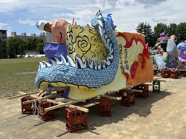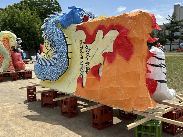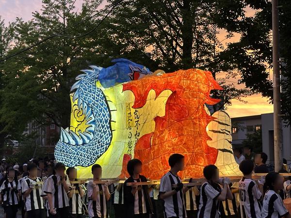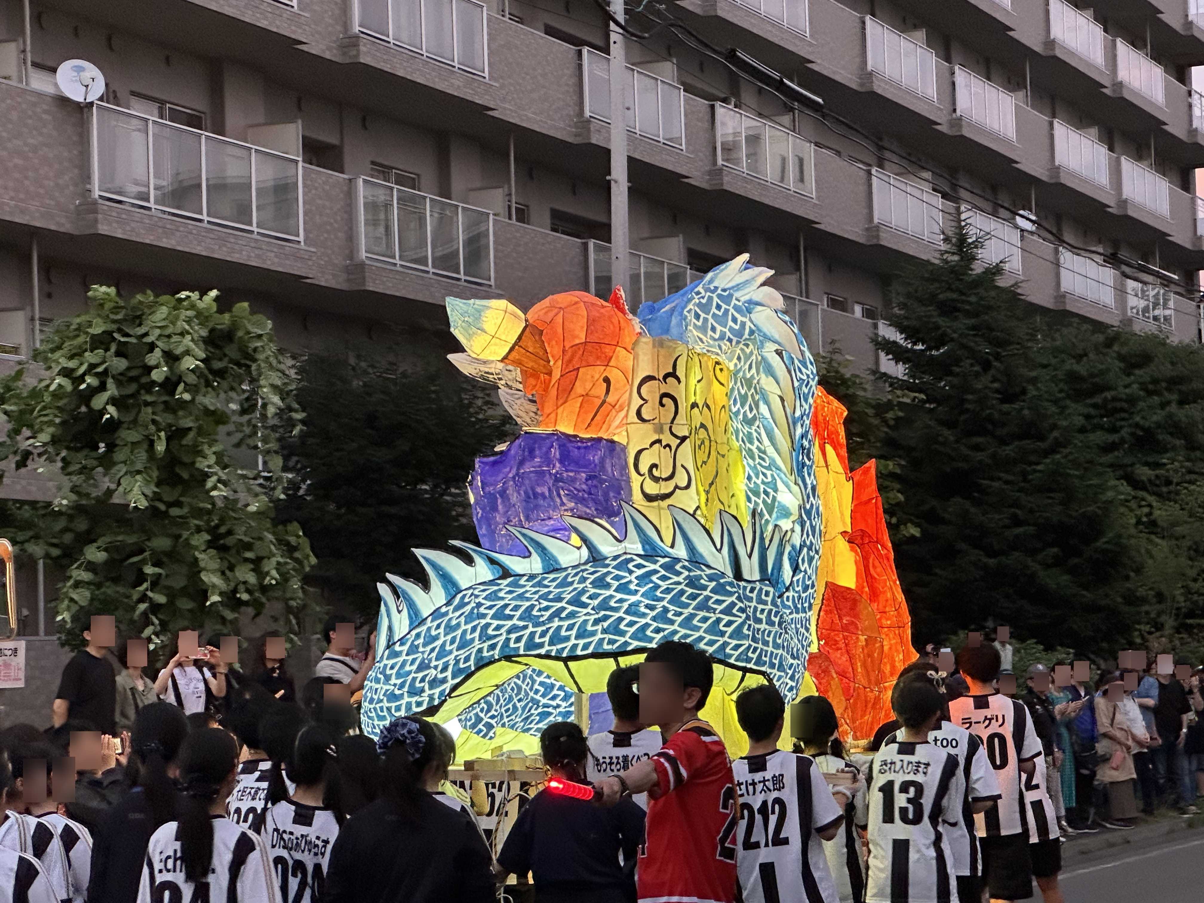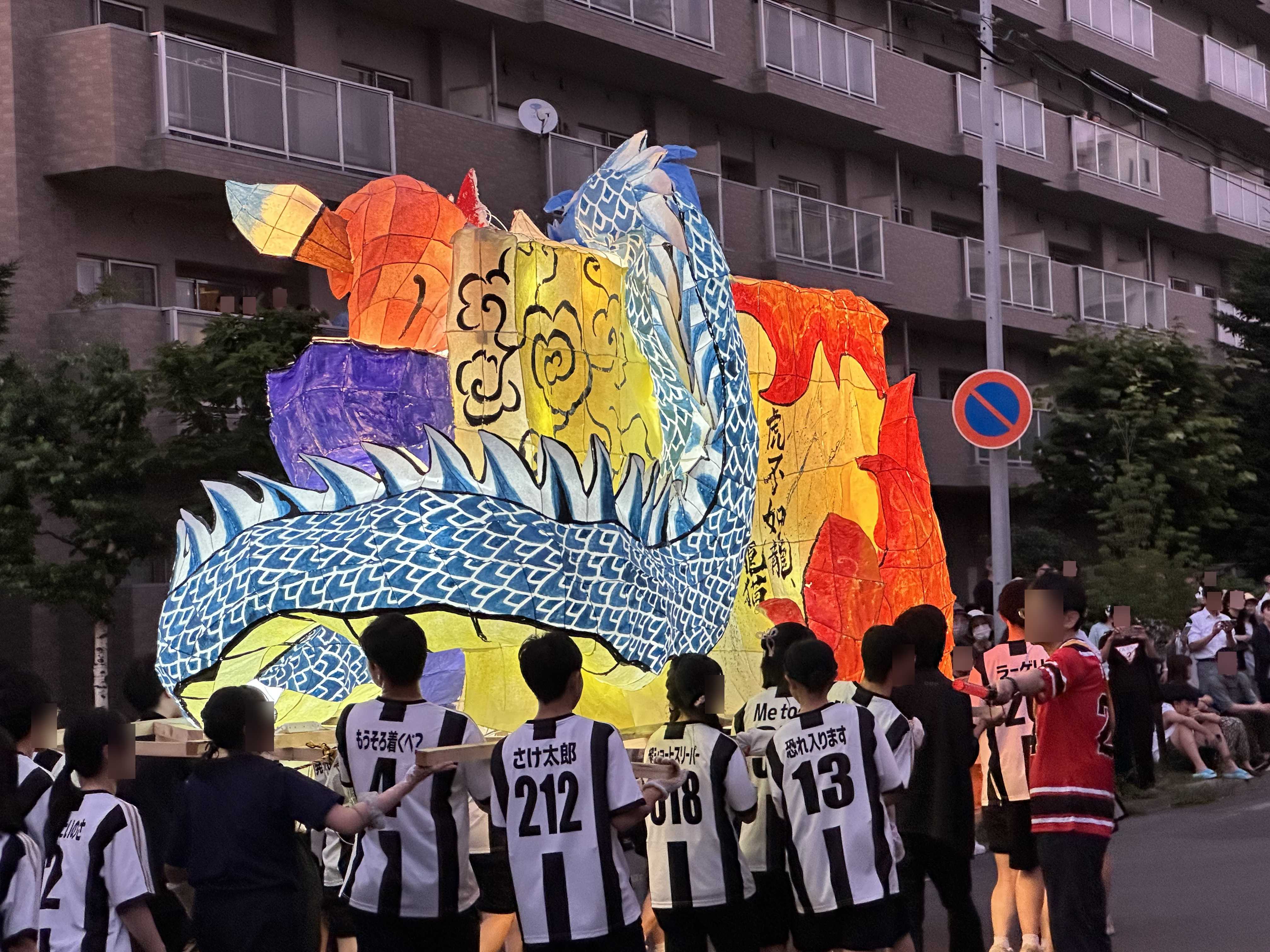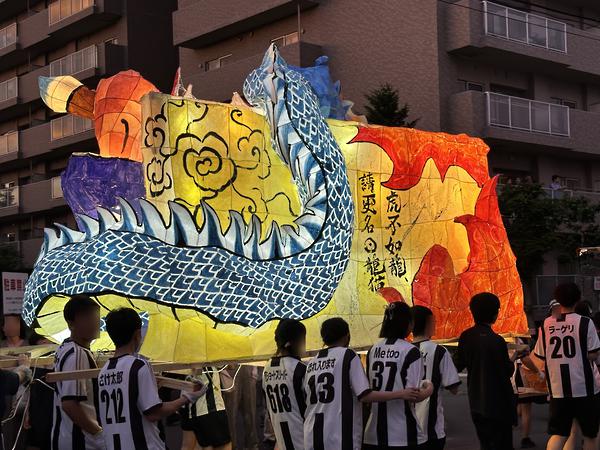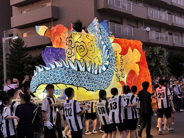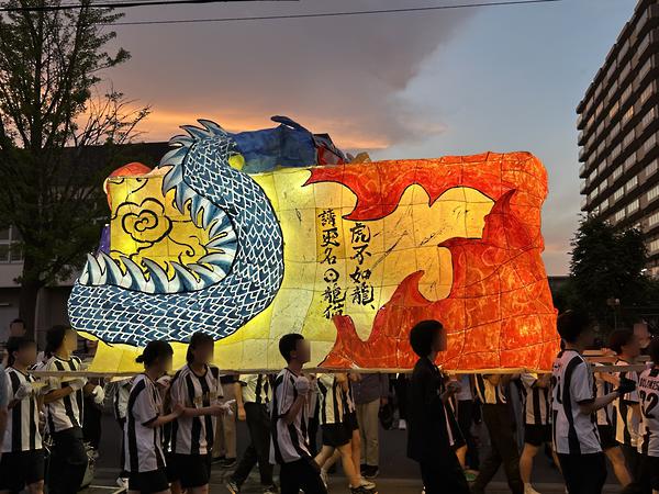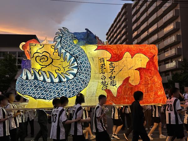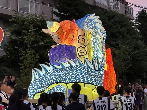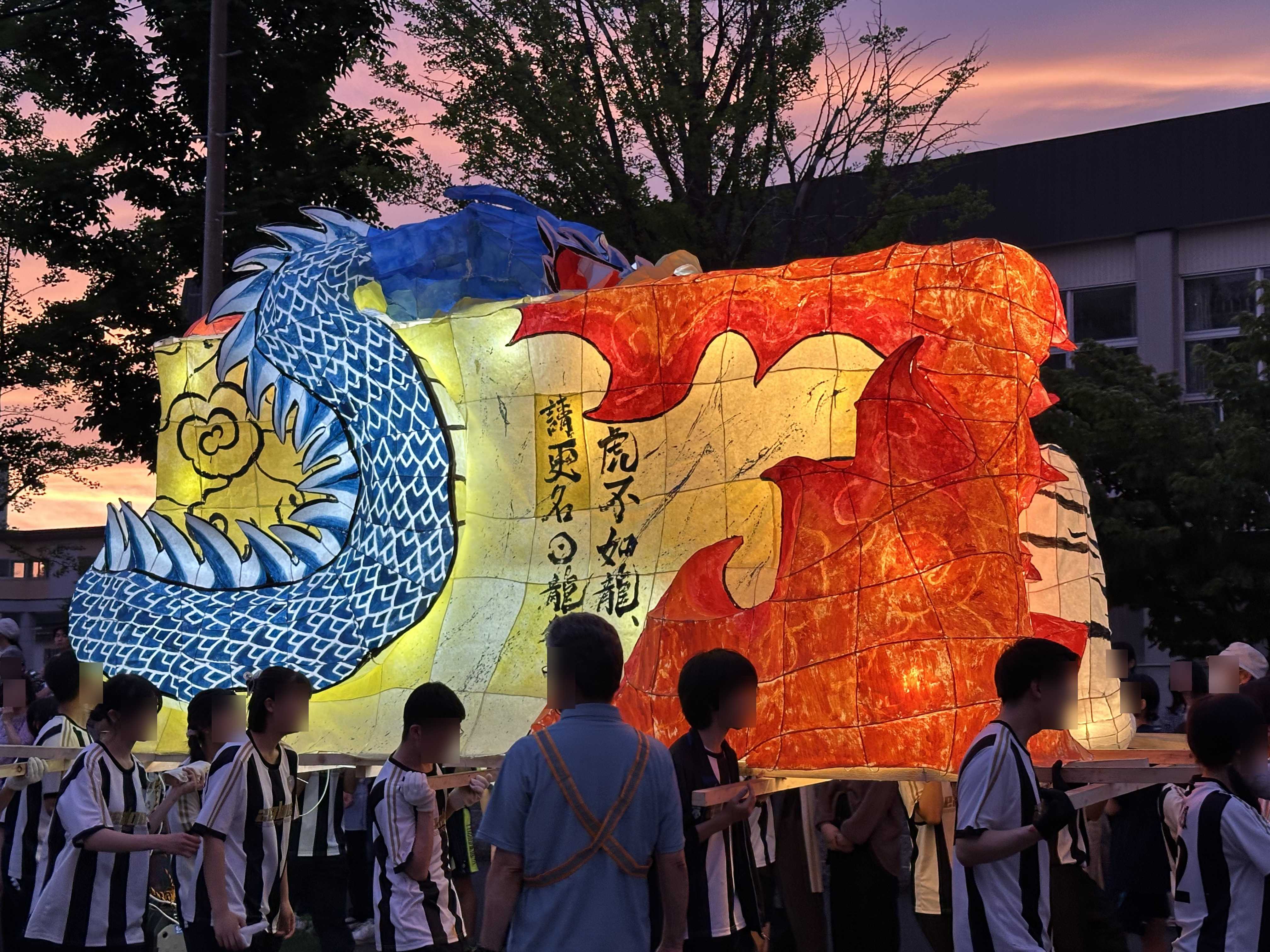 龍がかっこいい!特に後ろから見たときの龍のうねり具合がかっこよくて好きです。龍の背びれをきちんと作るところは珍しいのですがこちらの行灯は上手く作られていましたし、背びれの先が細くなりがちなのにどれも光っていたので電飾も素晴らしかったです。