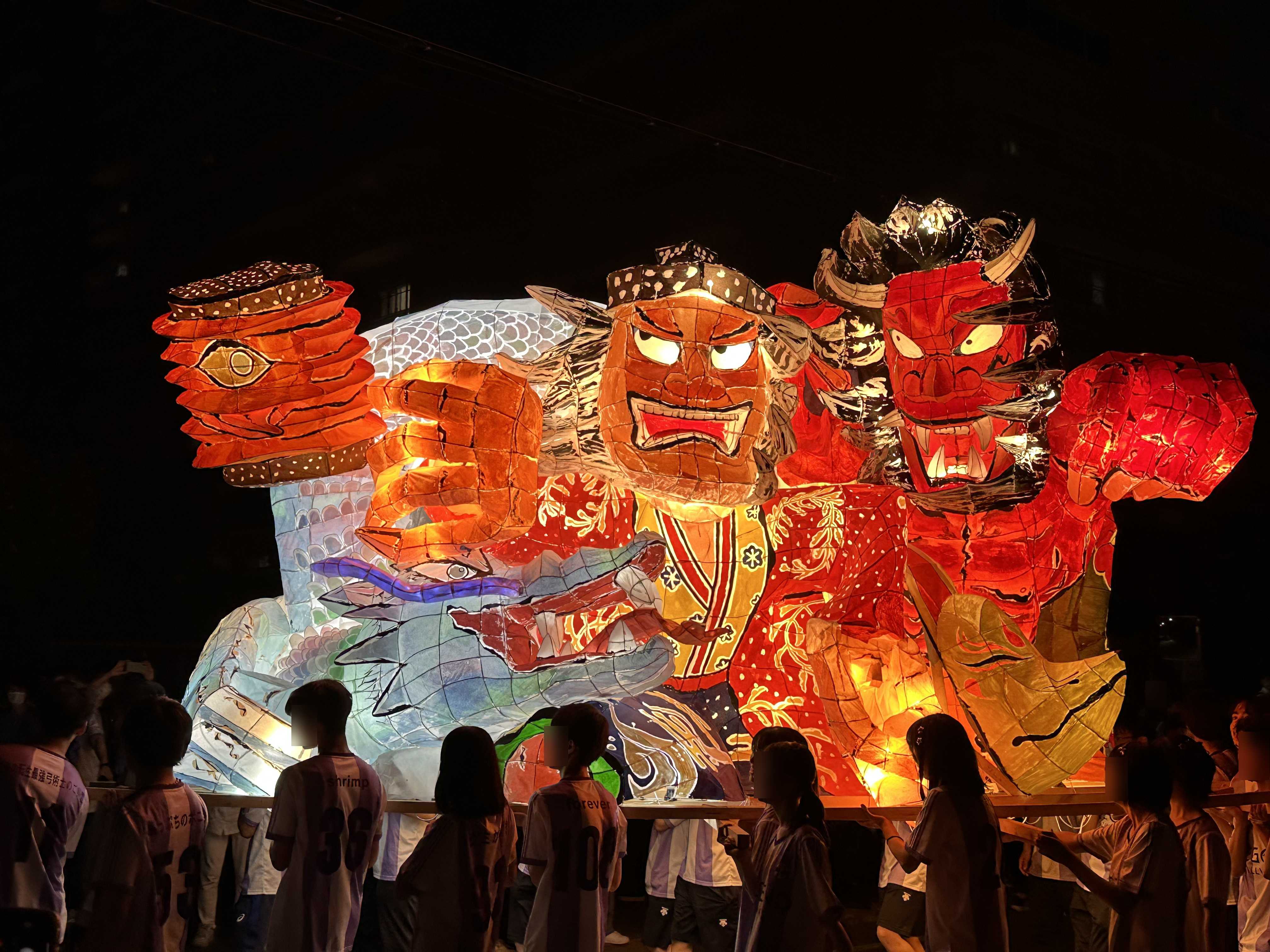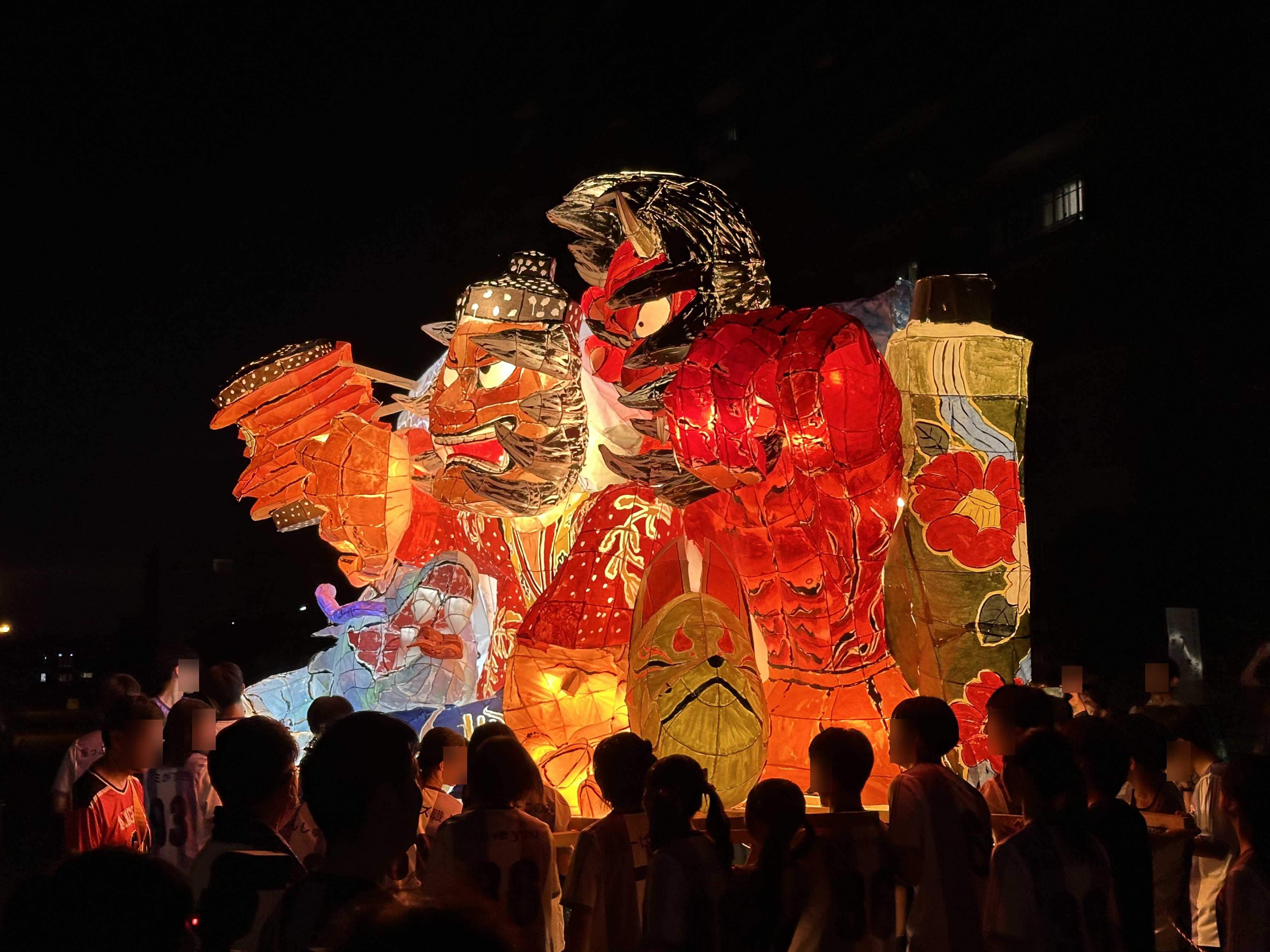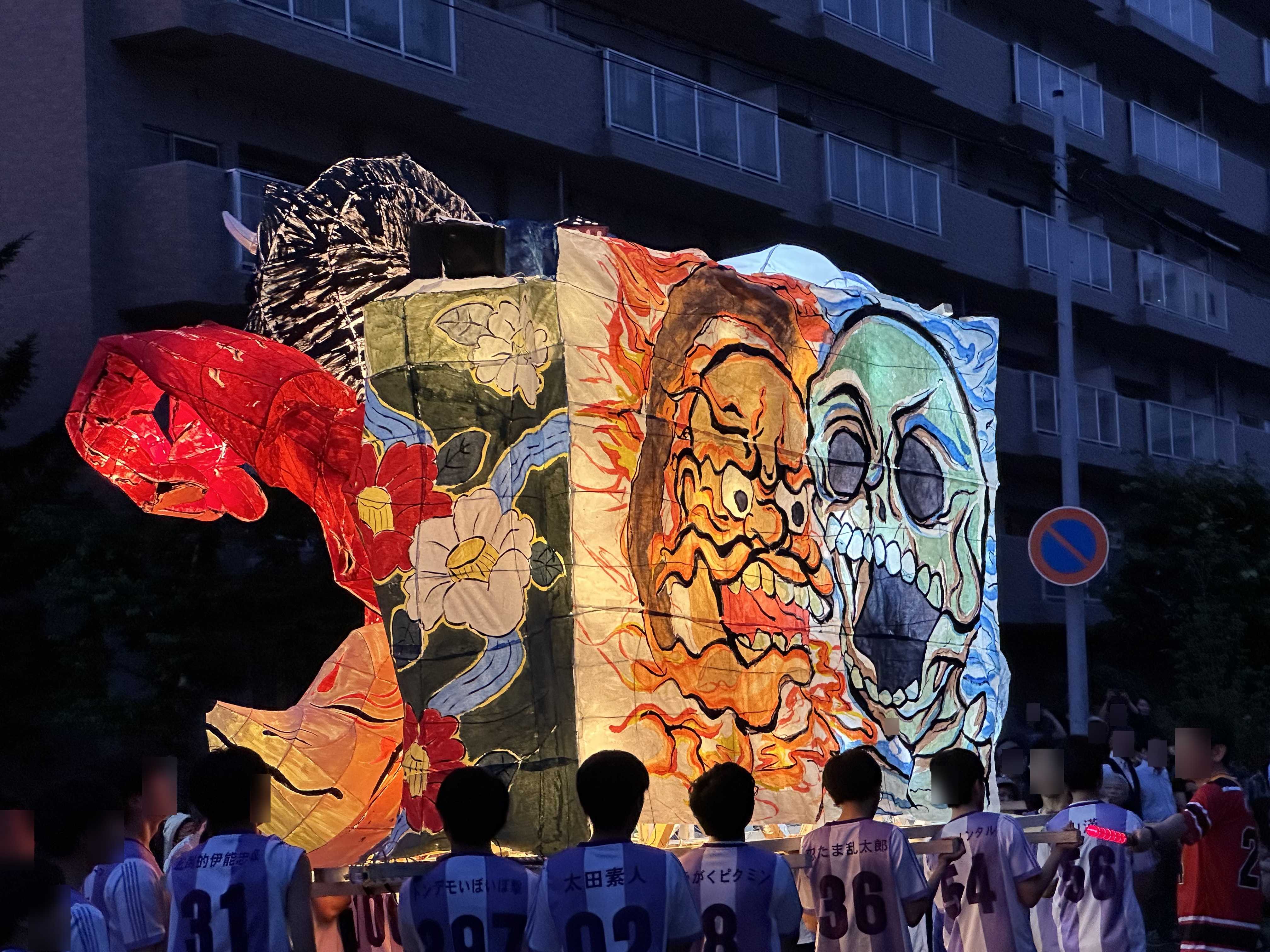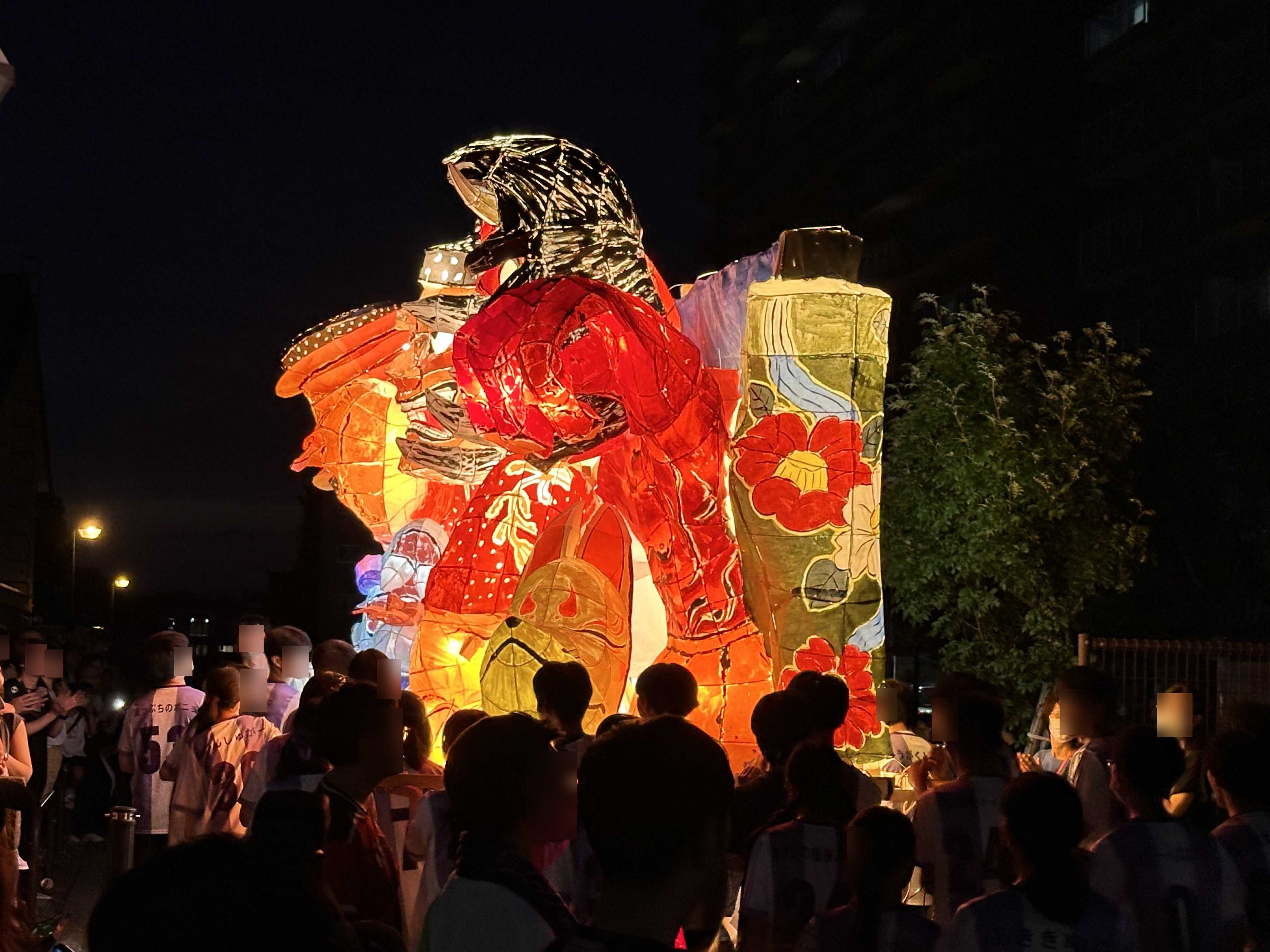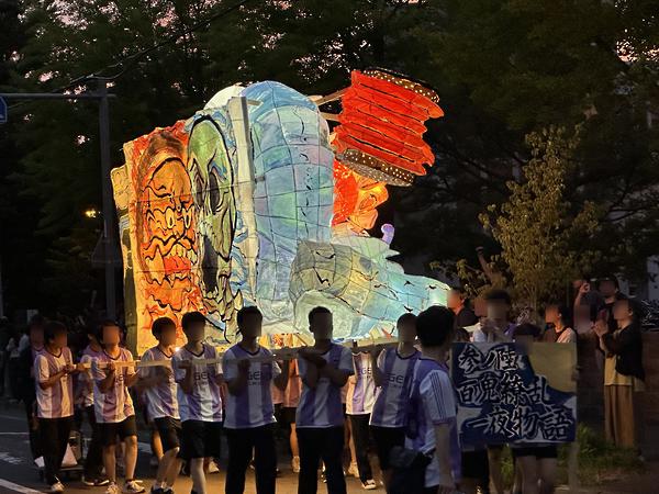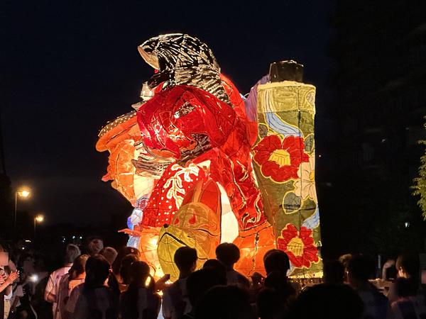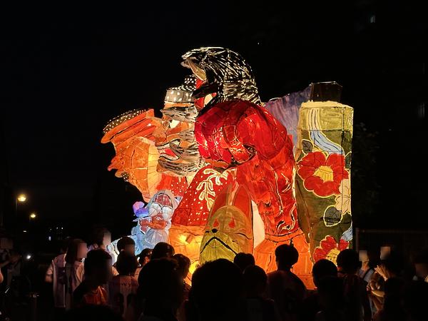 ある宵、藤原常行掟を破り夜道を密かにかけし時、百鬼夜行に遭遇してしまった...この麗美な妖怪に息を吹き込んだのが精鋭6組の行灯武者諸君です。土台から針金、紙張、色塗りに至るまで各部門の熟練工ここに集結!世界に誇る行灯にご注目♡